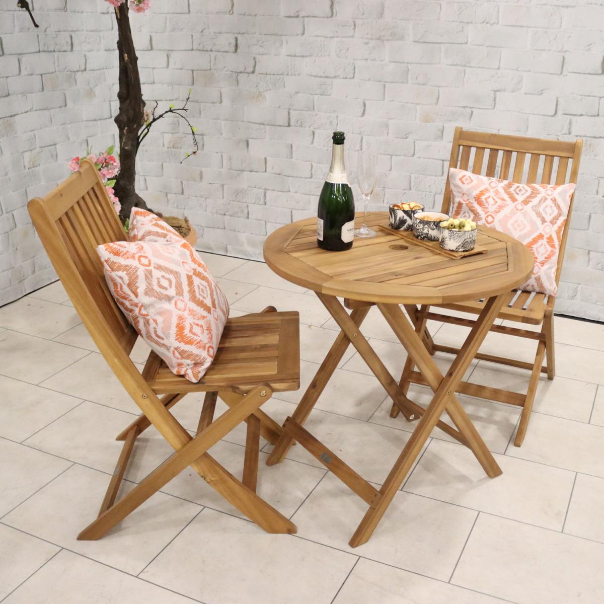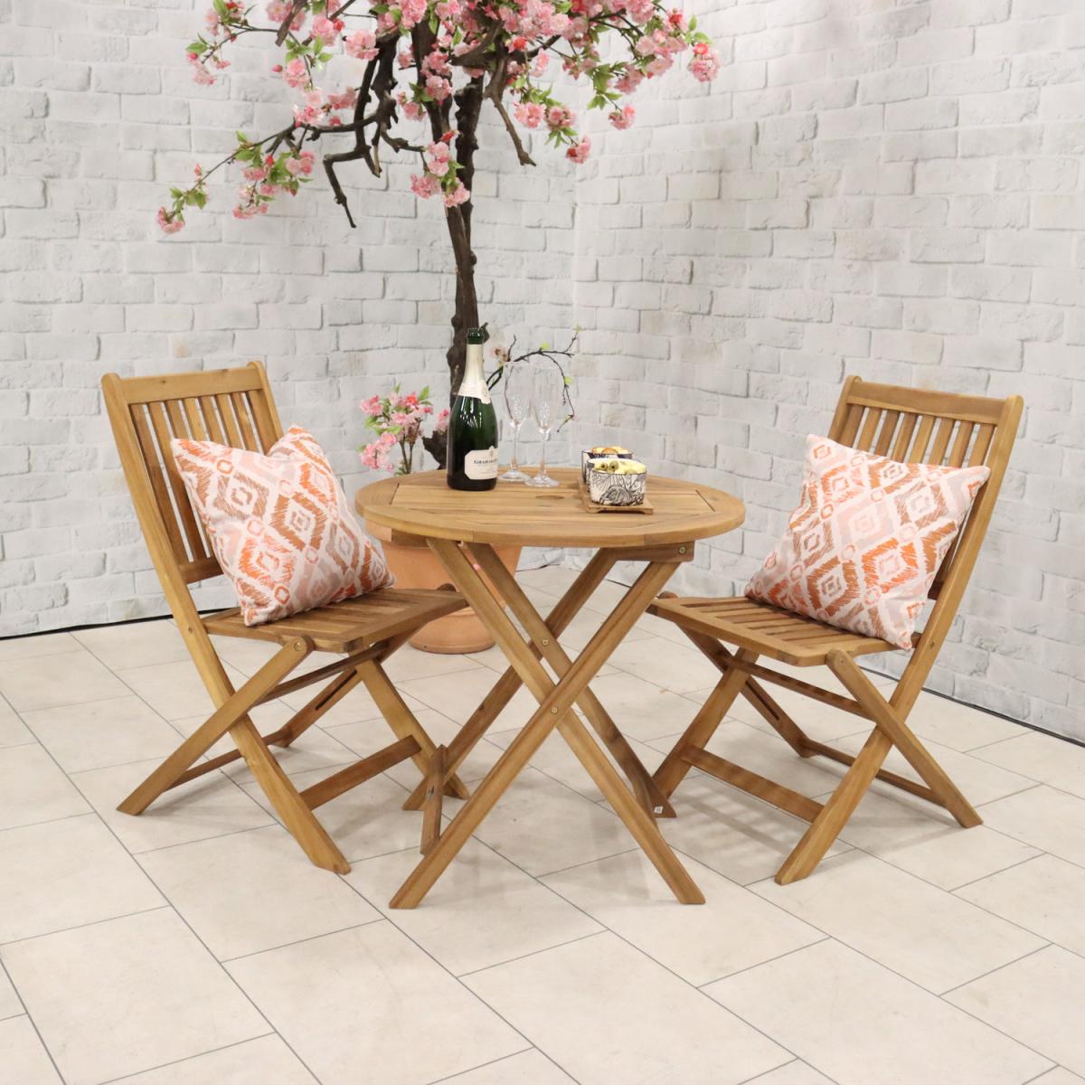 This York Bistro Set with 2 folding chairs will add timeless style to any outdoor space at an affordable price. Consisting of 70cm round folding table and 2 Manhattan folding chairs it is perfect for folding away for easy storage. Our Acacia hardwood is perfect for creating high-quality furniture due to its warm tones and natural beauty. The acacia tree grows very slowly which makes the wood incredibly hard and durable allowing the furniture to be used for many years. The York Bistro set is perfect for your patio or small outdoor areas it will be a lovely addition to any outdoor space.