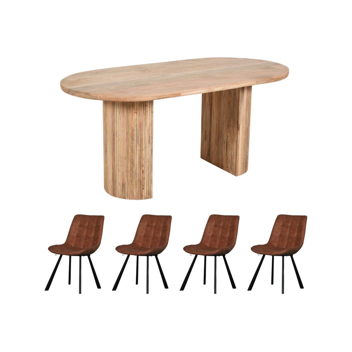 The Handmade York Wooden Dining Table Set of 1 Table and 4 Chairs is a beautiful, rustic addition to any dining room. Made from Mango wood, it's strong durable and measures 170x85x76 CM (LxDx. H), seating up to six. Its lacquered finish provides extra protection from scratches and stains so you can use it right away. Meanwhile, the Industrial Style Chairs, with black powder-coated steel tapered legs, feature a comfy Light Brown Tan PU leather-covered seat - perfect for family dinners or gatherings with friends. It's an excellent choice for anyone looking for a quality dining table.