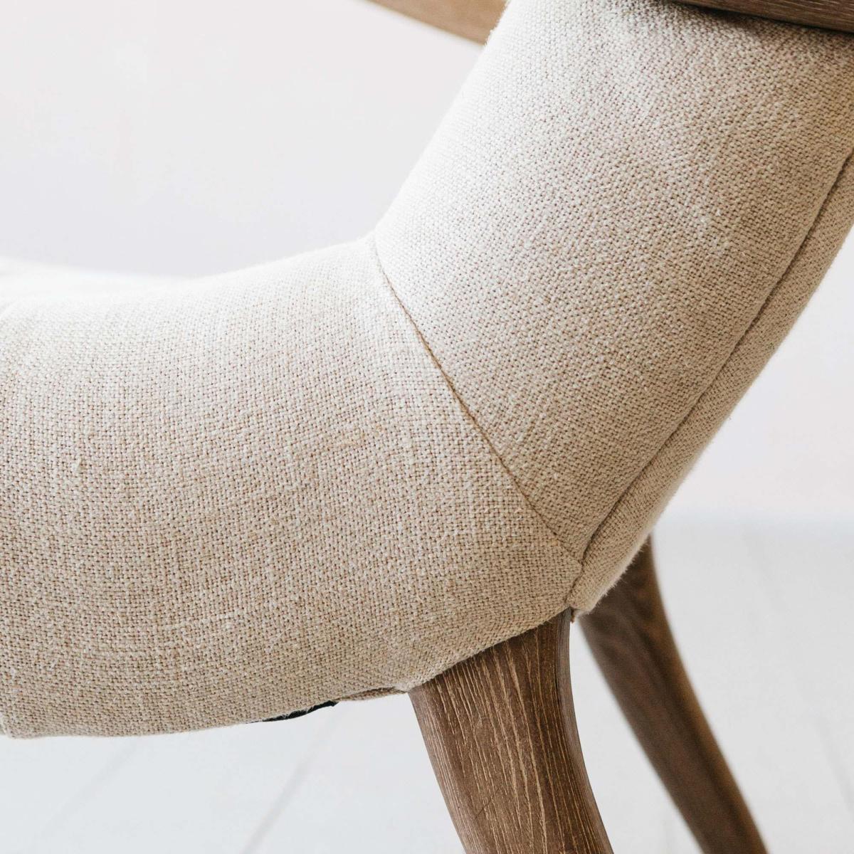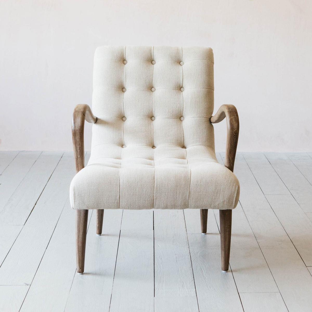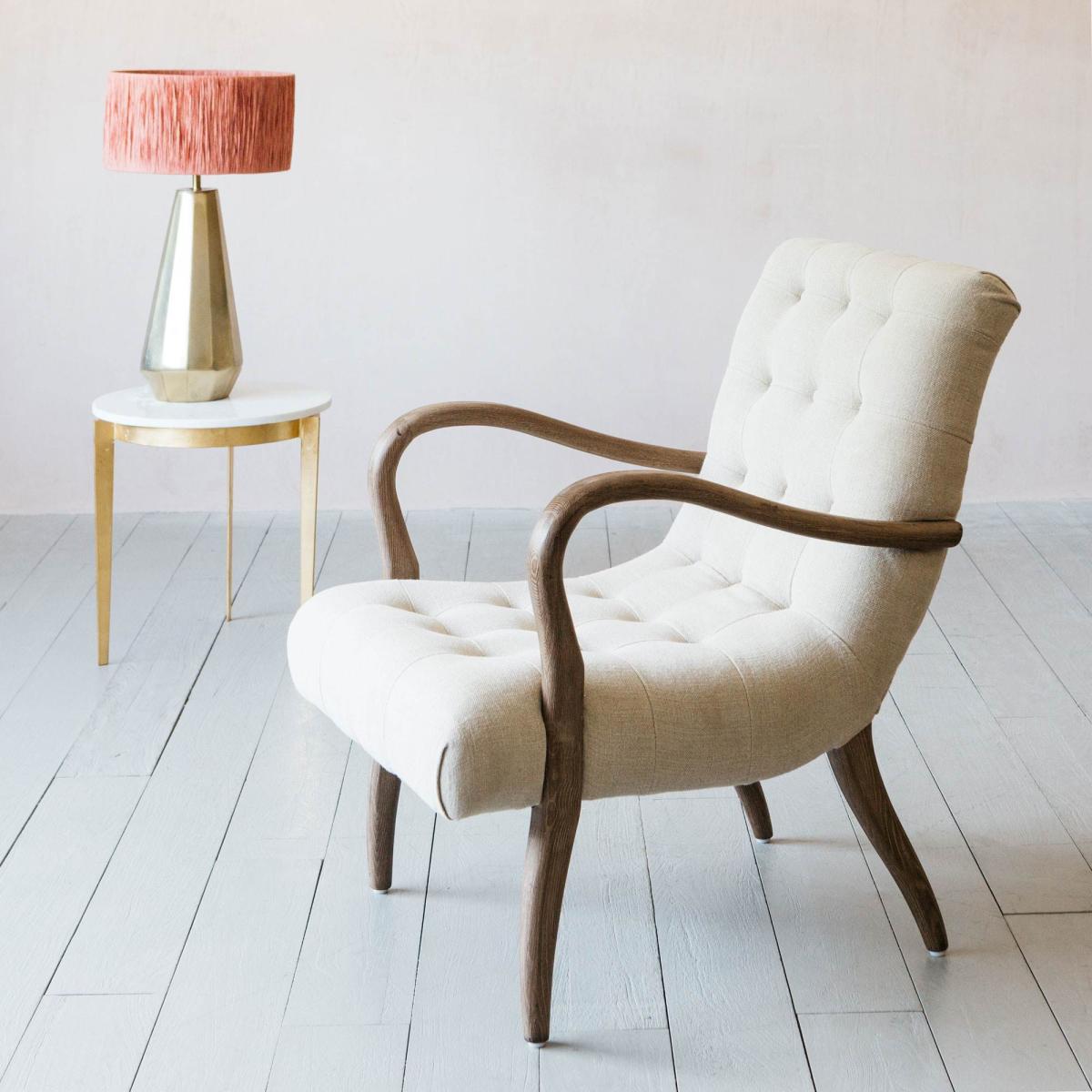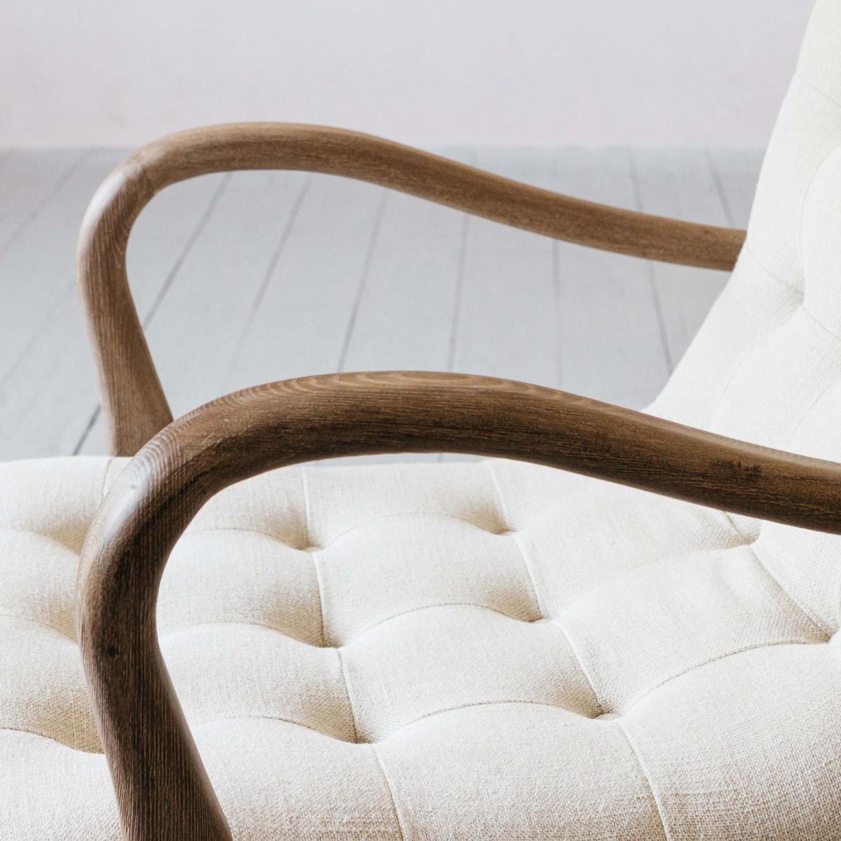 A mid-century inspired armchair handcrafted from ash wood and upholstered in natural linen. Featuring sweeping curved arms, decorative button detailing and tapered legs.