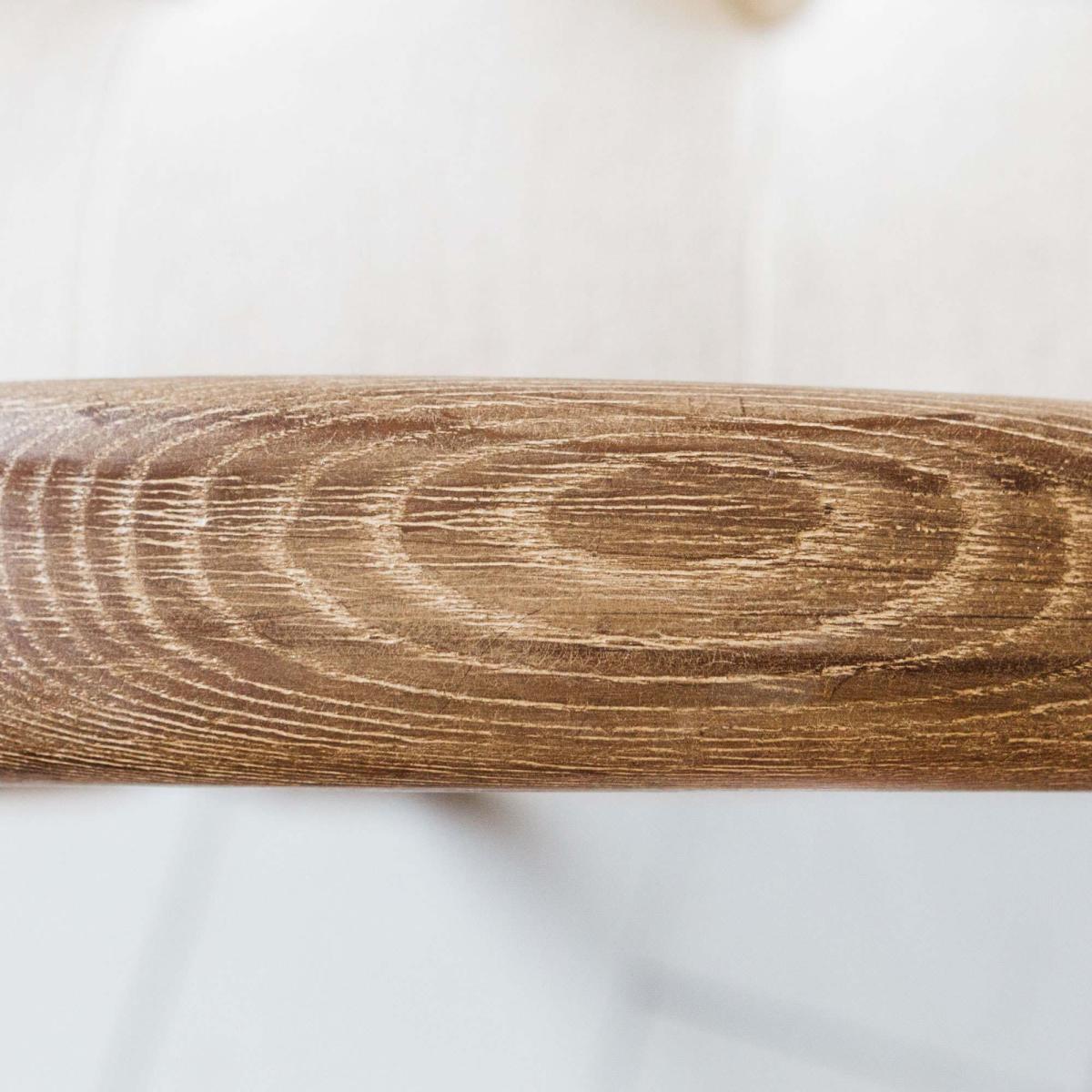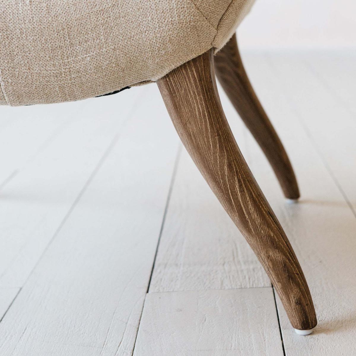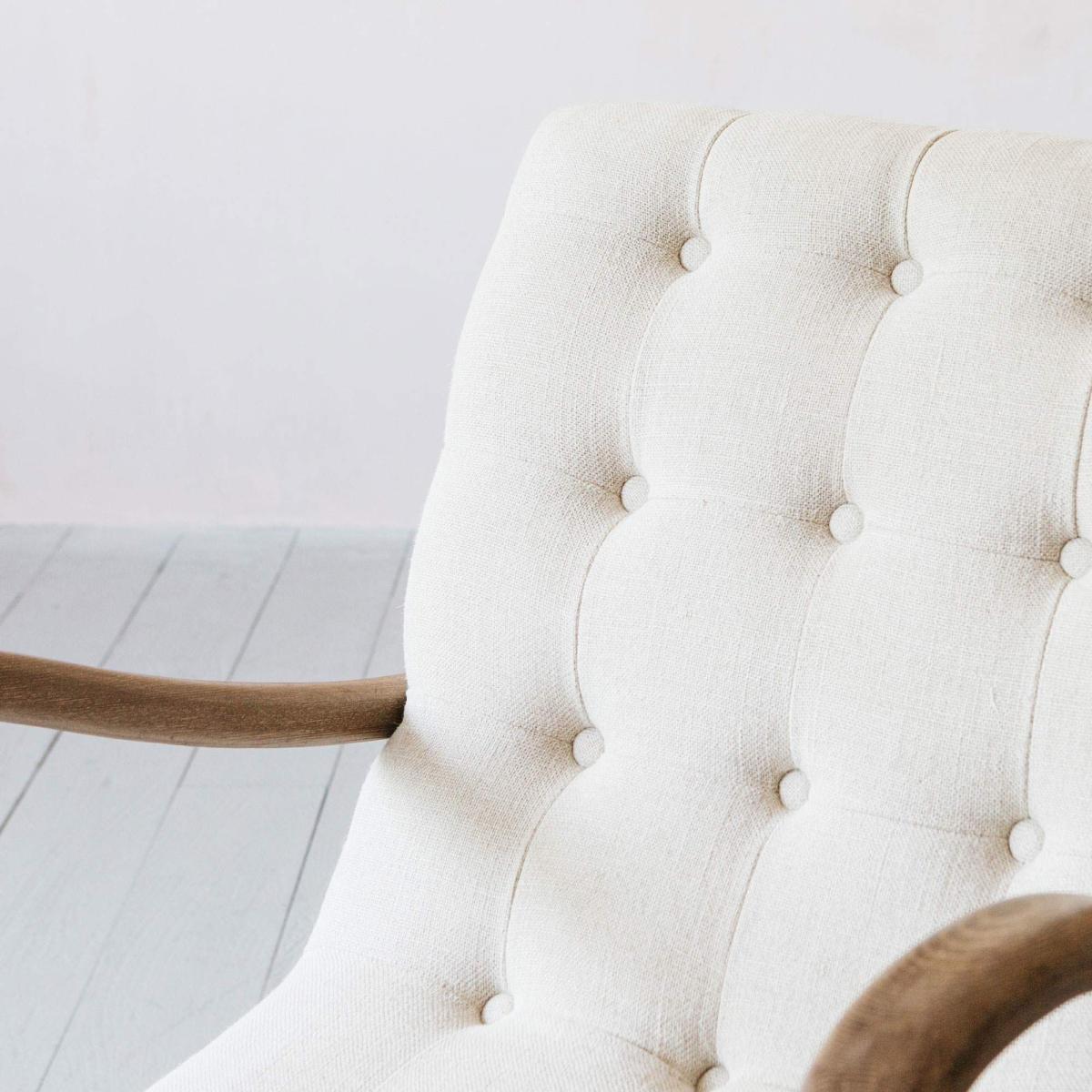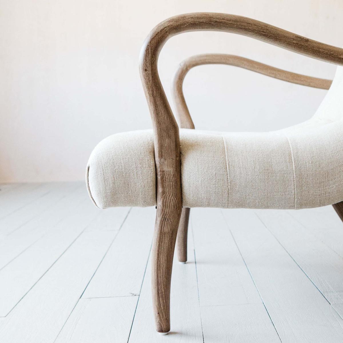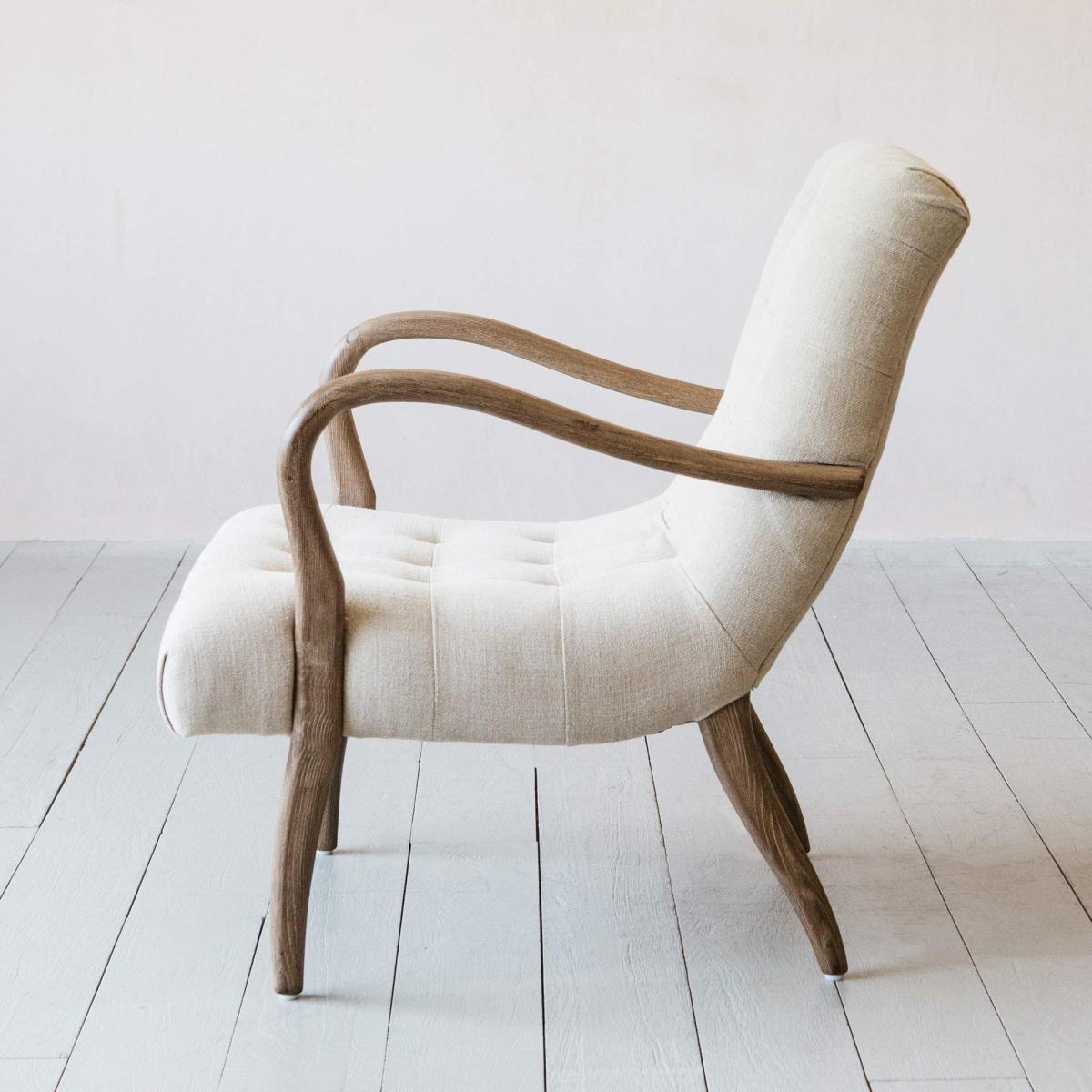 A mid-century inspired armchair handcrafted from ash wood and upholstered in natural linen. Featuring sweeping curved arms, decorative button detailing and tapered legs.