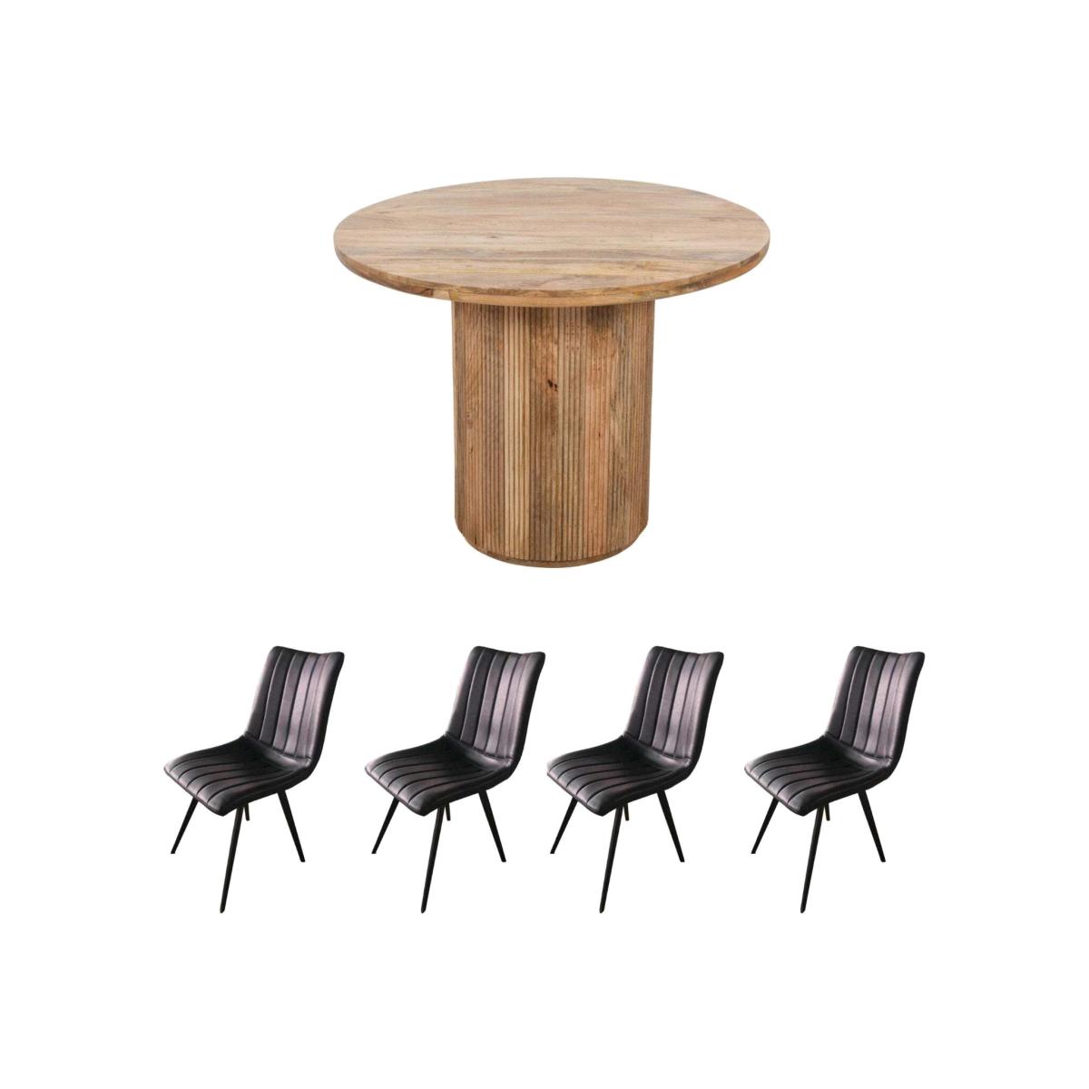 The York Natural Solid Wood Round Table Set contains a timelessly elegant dining table and 4 chairs. This solid wood set provides everlasting durability and features a graceful lacquered finish. Its 100x100x76 cm dimensions make it ideal for small to medium-sized rooms, while its round shape encourages friendly conversation during meals. Assembly is quick and easy, and the necessary tools and hardware are included. Add a touch of sophistication to your dining area with this high-quality, stylish, and functional set. The chairs boast a modern design with eye-catching vertical stitching, a soft vegan leather seat for comfort, and easy-to-clean surfaces.