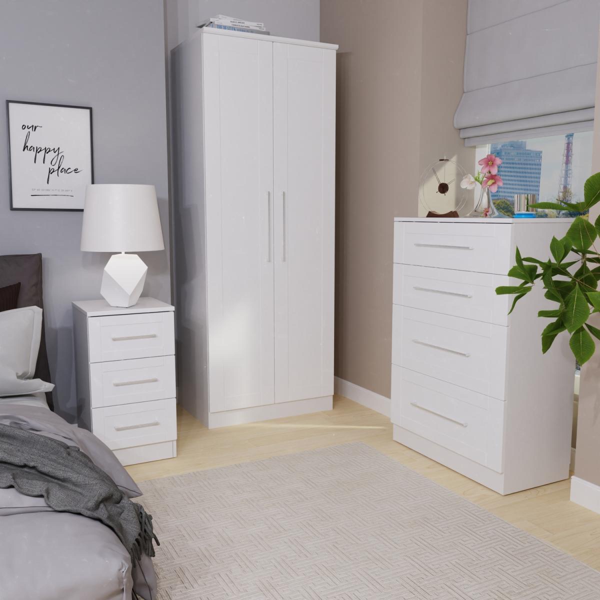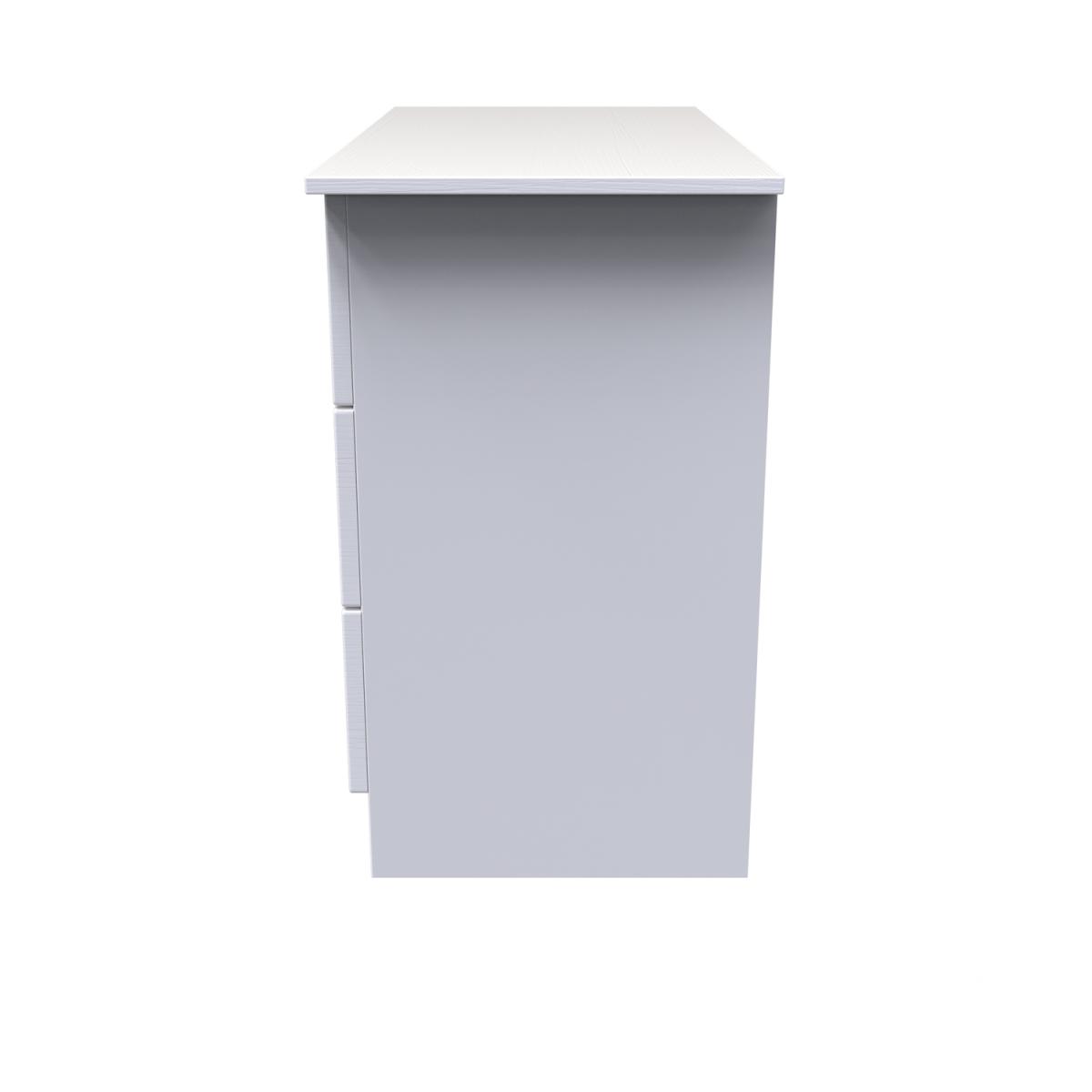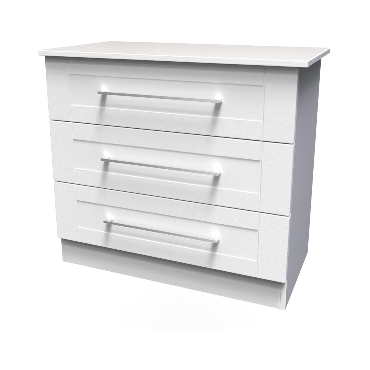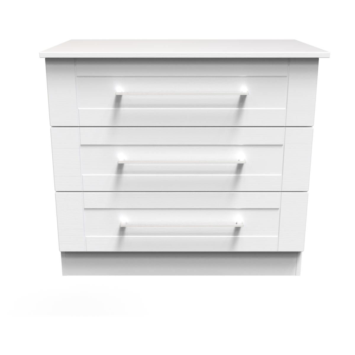 This wide 3 drawer chest of drawers is practical and stylish. Perfect for any home as a free standing storage unit. Wood grain effect, panelled design, recessed fronts and chrome handles, the York Range is a beautifully elegant collection. With this range you have the freedom to choose from a wide range of furniture configurations, allowing you to create the perfect combination to optimise your storage space. All our furniture is made in the United Kingdom, to the highest quality. It is delivered direct to your location of choice by one of our two man delivery teams, and come full assembled (although legs may be removed to prevent damage in transit).