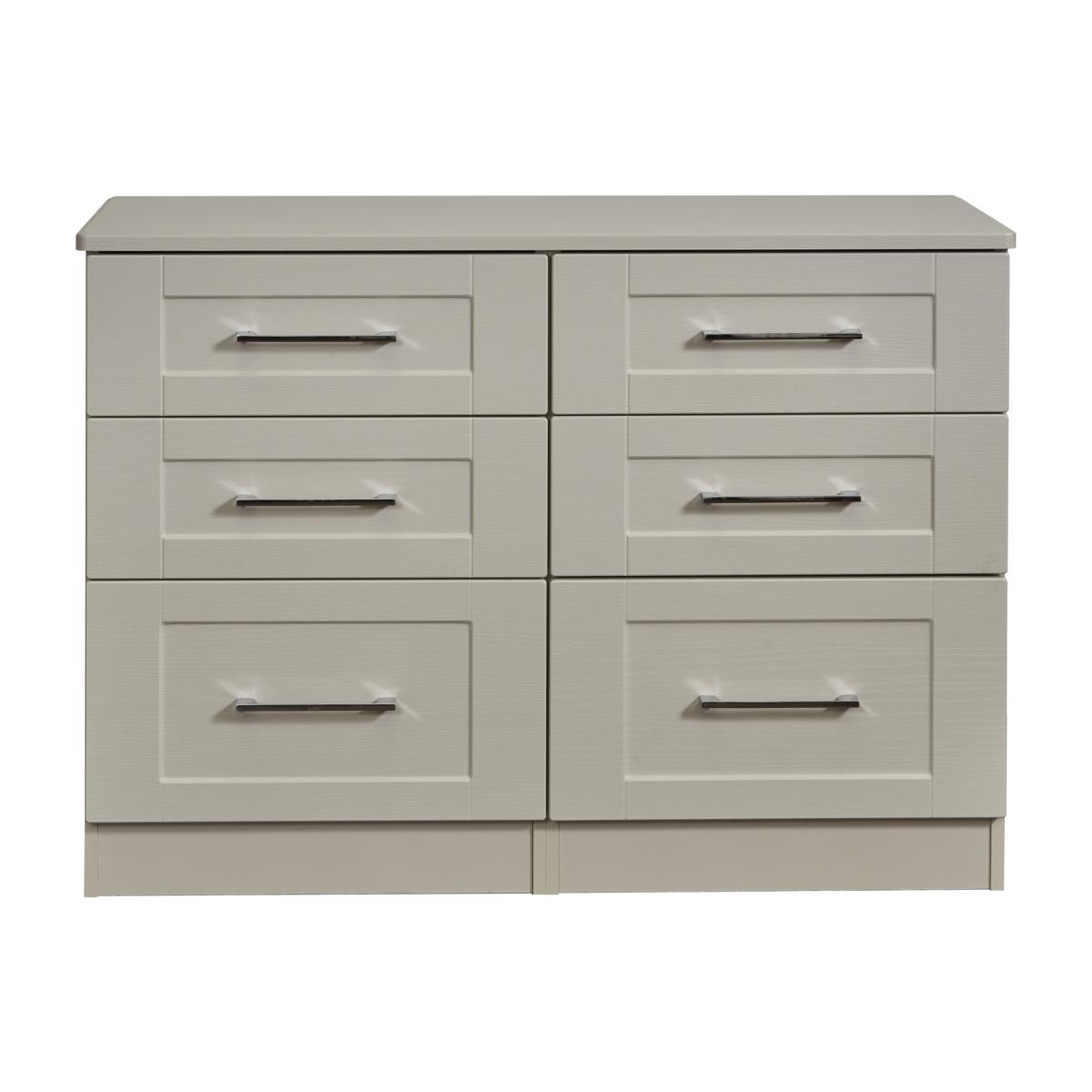 This double width 6 drawer chest of drawers is practical and stylish. Perfect for any home as a free standing storage unit. Wood grain effect, panelled design, recessed fronts and chrome handles, the York Range is a beautifully elegant collection. With this range you have the freedom to choose from a wide range of furniture configurations, allowing you to create the perfect combination to optimise your storage space. All our furniture is made in the United Kingdom, to the highest quality. It is delivered direct to your location of choice by one of our two man delivery teams, and come full assembled (although legs may be removed to prevent damage in transit).