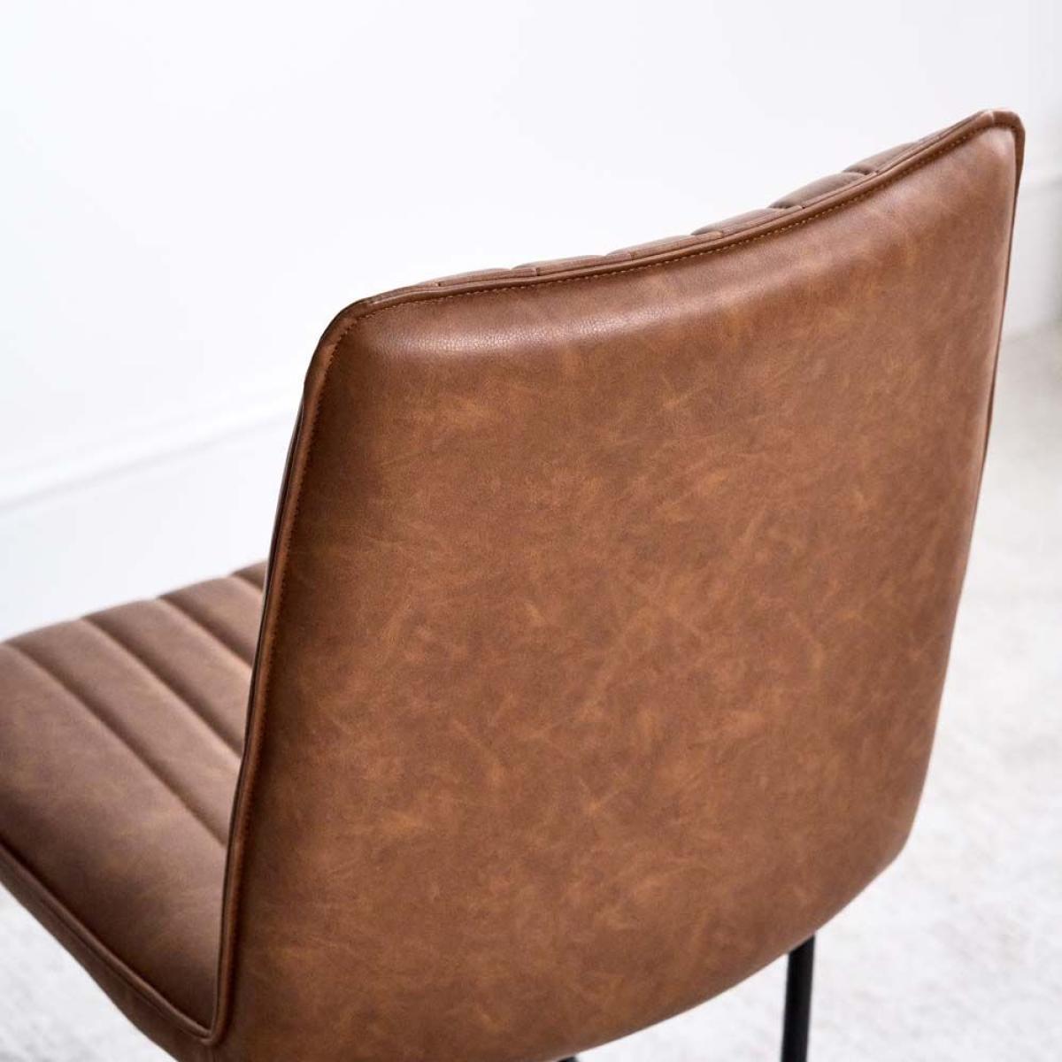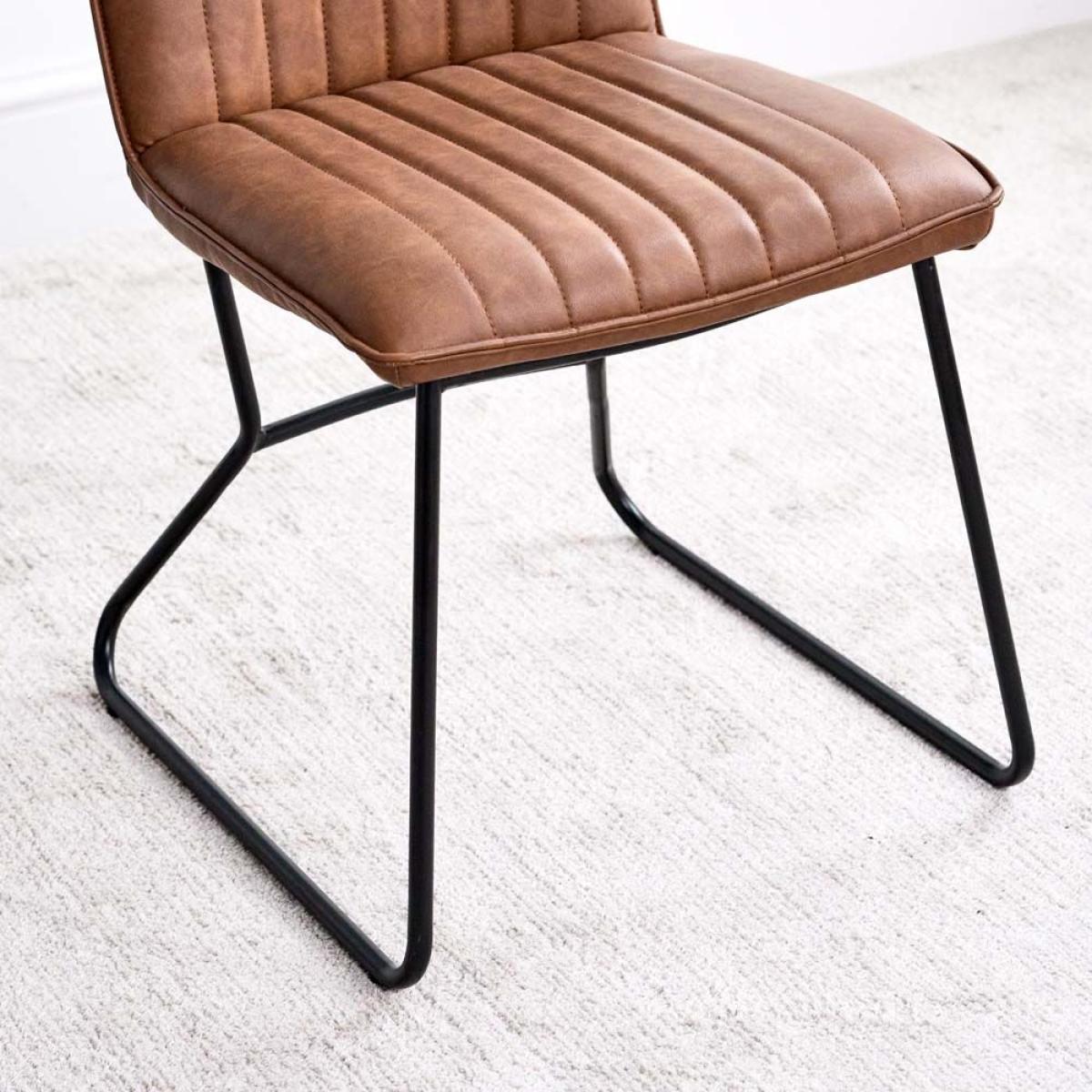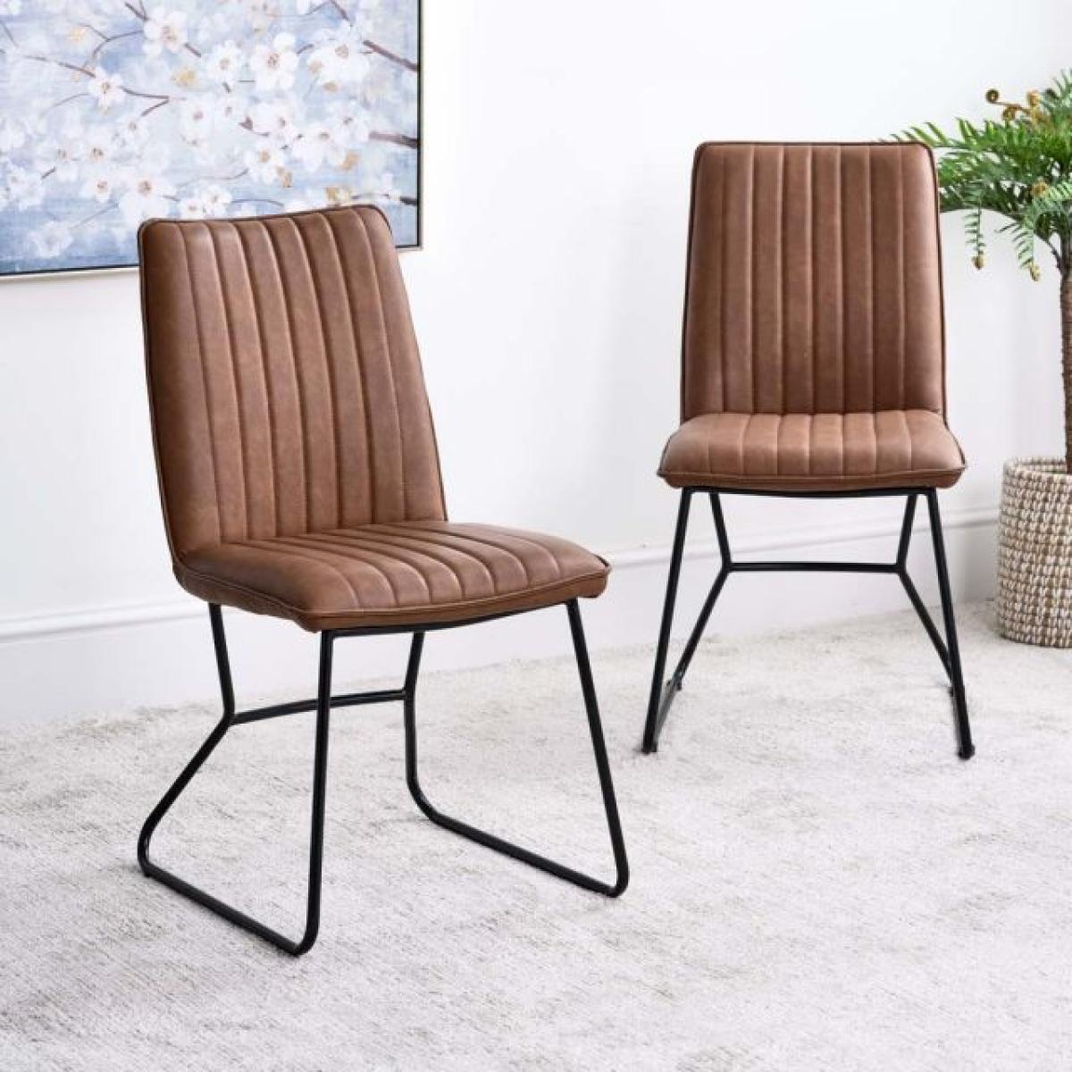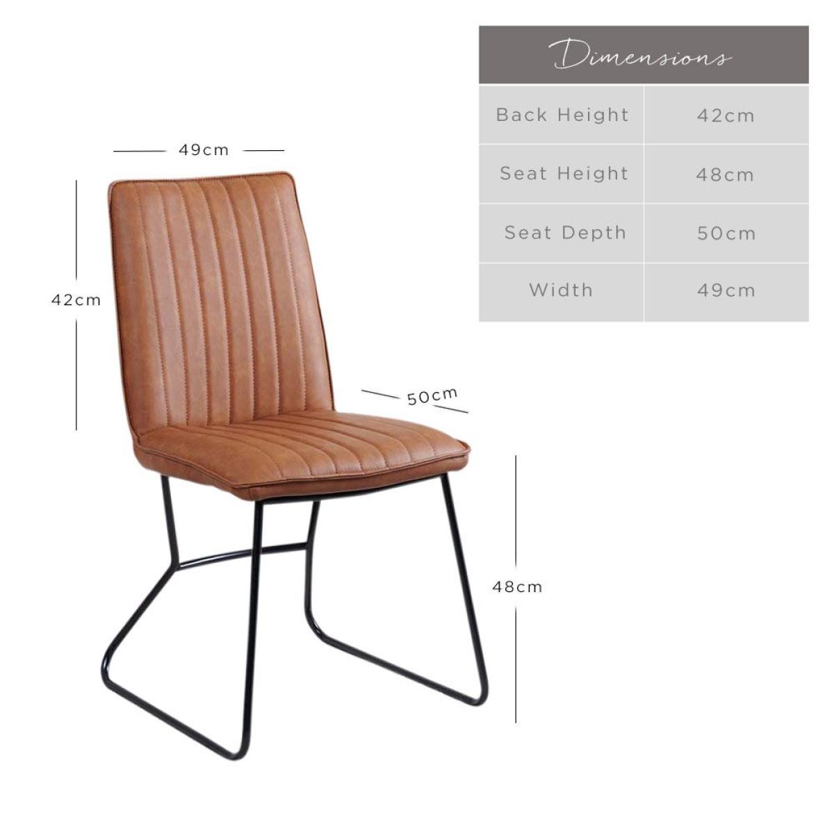 Divine Dining. This York dining chair set is upholstered in a tan faux leather with line detailing and sleek metal legs for a beautiful addition to the everyday dining room. Also available in Terracotta Pink, Sky, Olive, Anthracite, Lemon Yellow, amp; Grey. Dimensions: H90cm Seat Height 48cm x W49cm x D57cm Simple self assembly Fabric samples available on request. Sold as a pair
