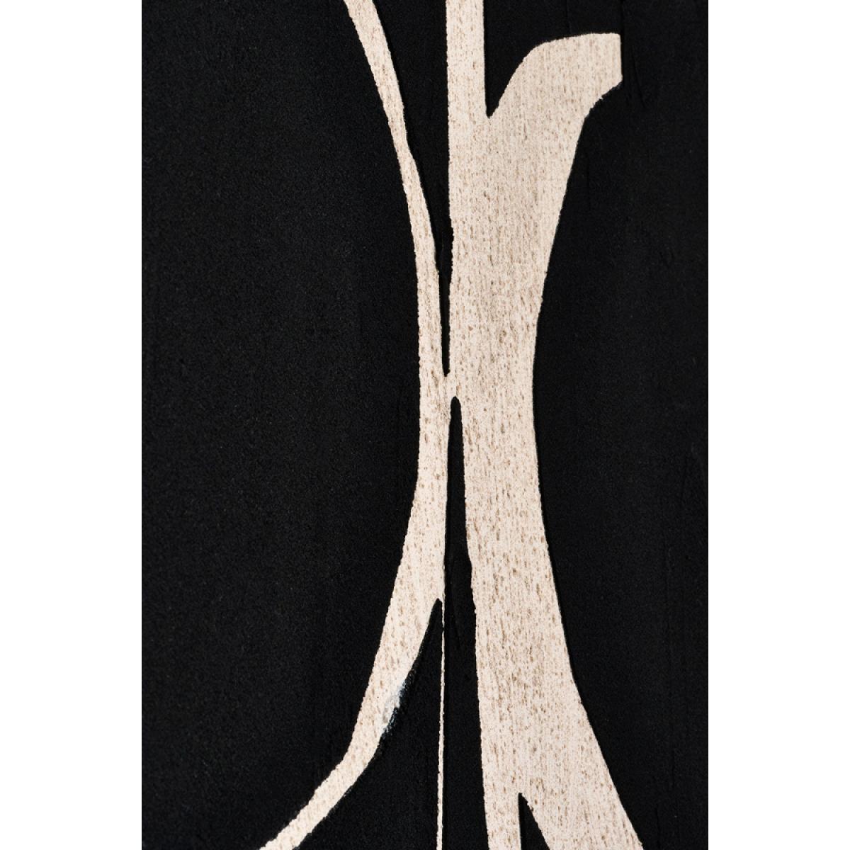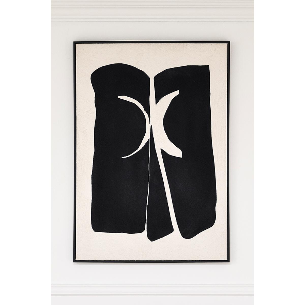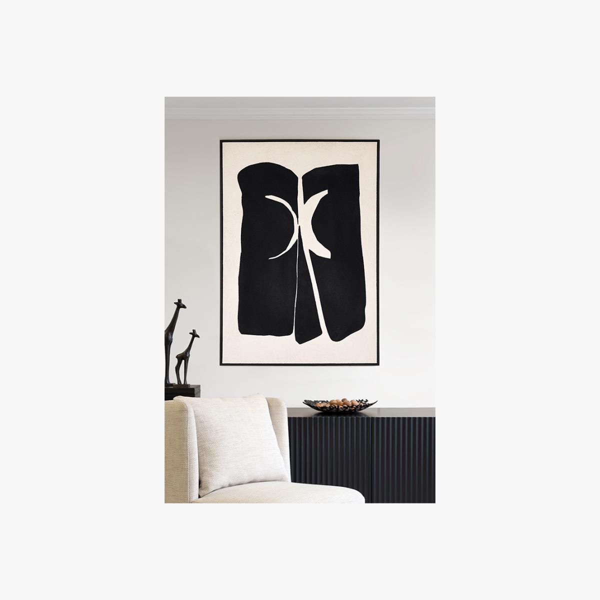 A high-quality, hand-painted design on stretched canvas - exclusive to My Furniture. Influenced by the bold simplicity of tribal abstract art. The raised black shapes and subtle textured background will bring depth and a refined, contemporary edge to any interior. Finished in a deep, black-stained wooden frame. Supplied with fixings for both portrait or landscape hanging.