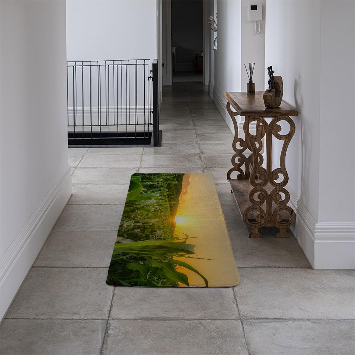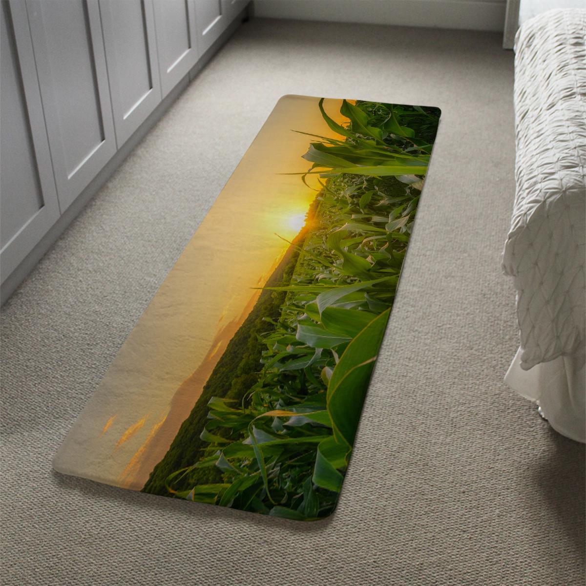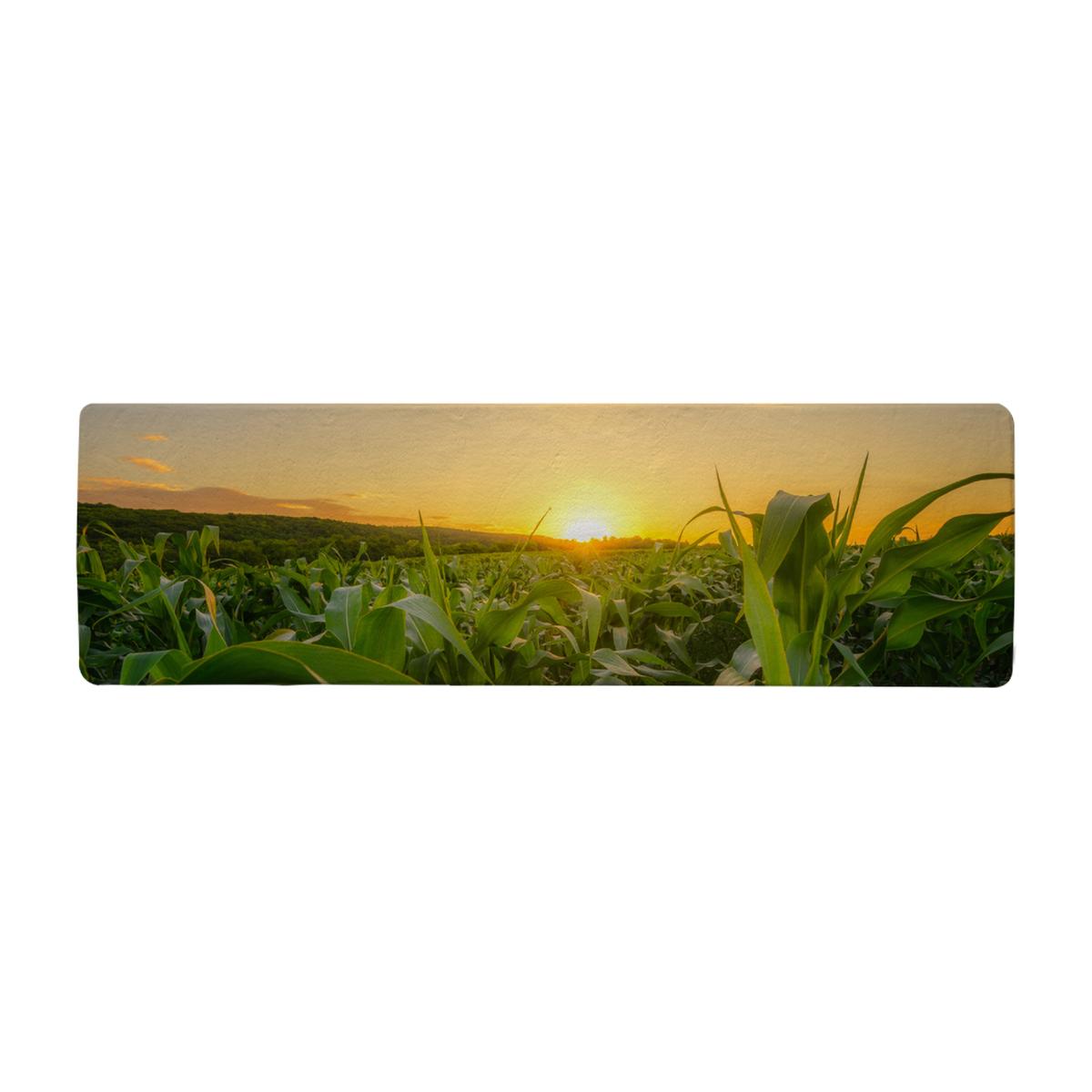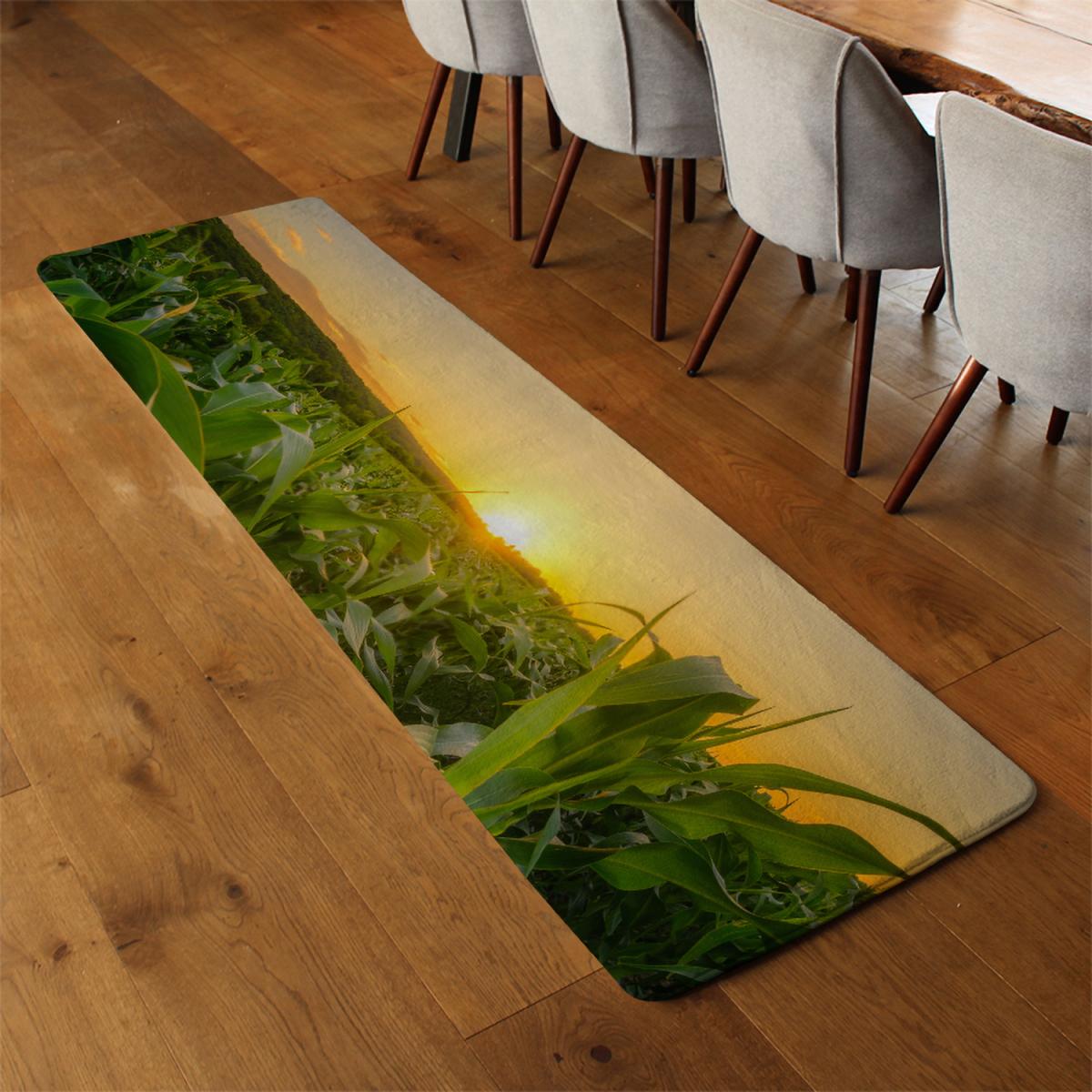 Young green corn growing on the field at sunset Designer Runner Rug - Green