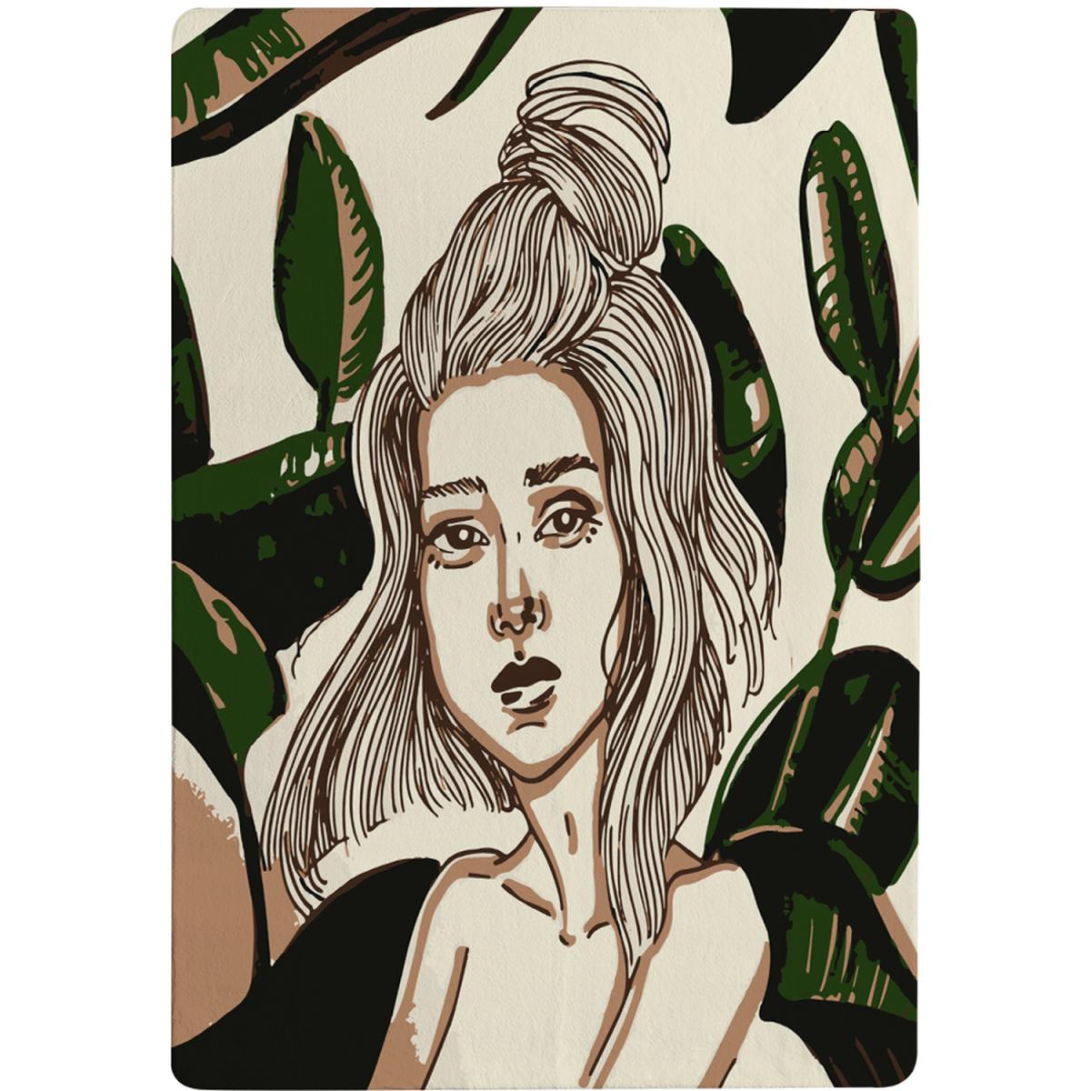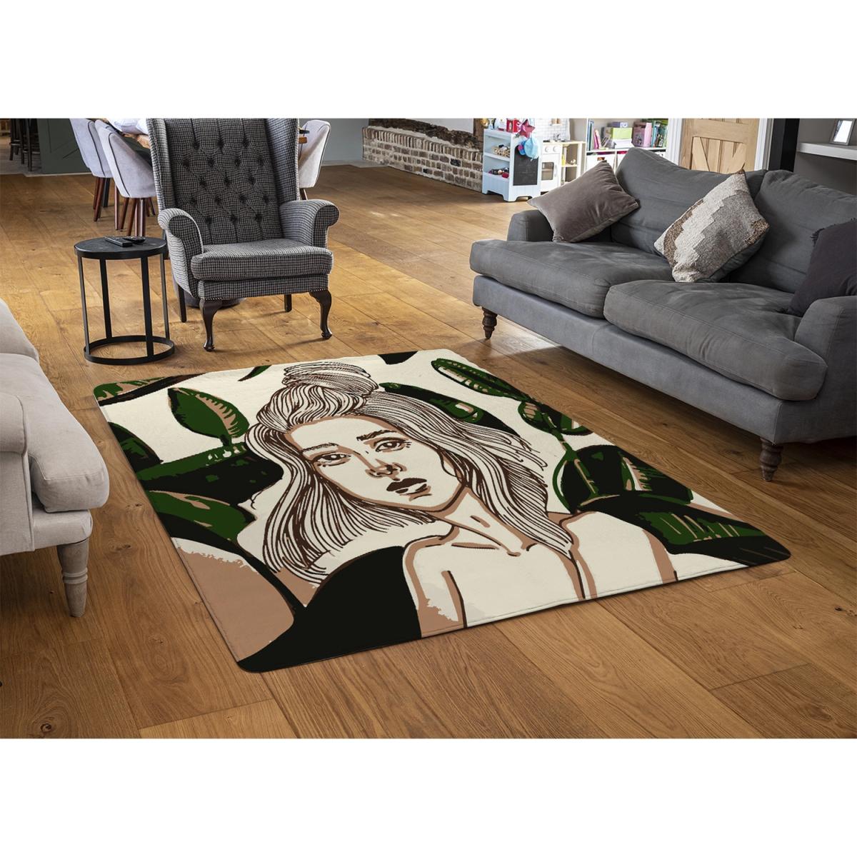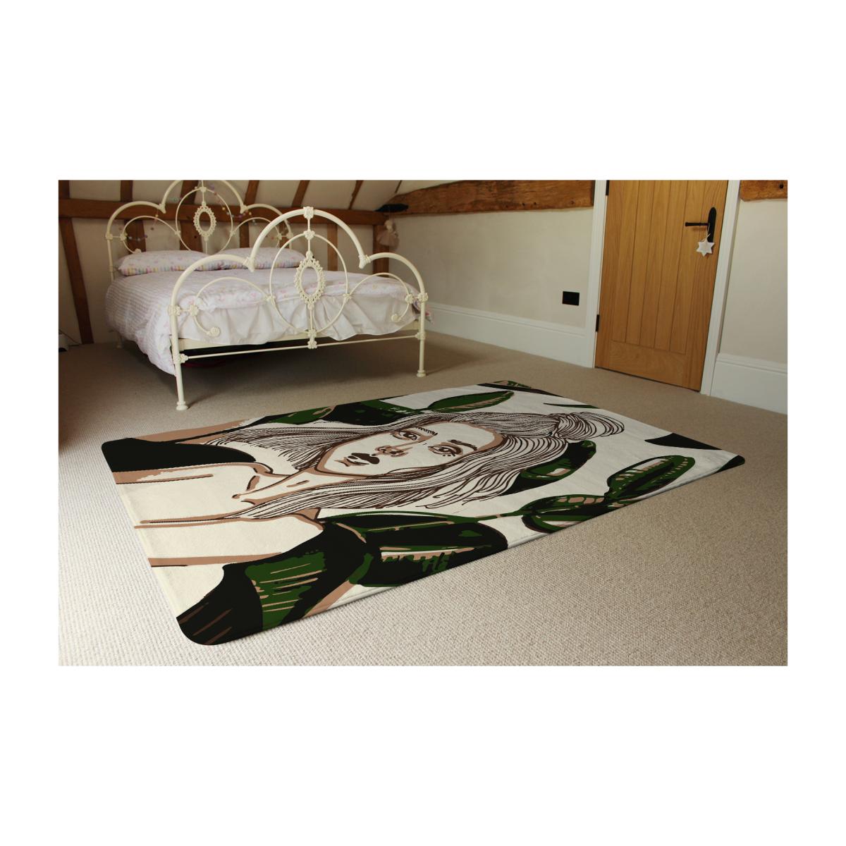 Young Woman In Tropical Leaves Designer Rug - Green / 230cm