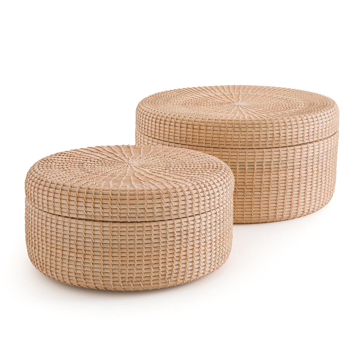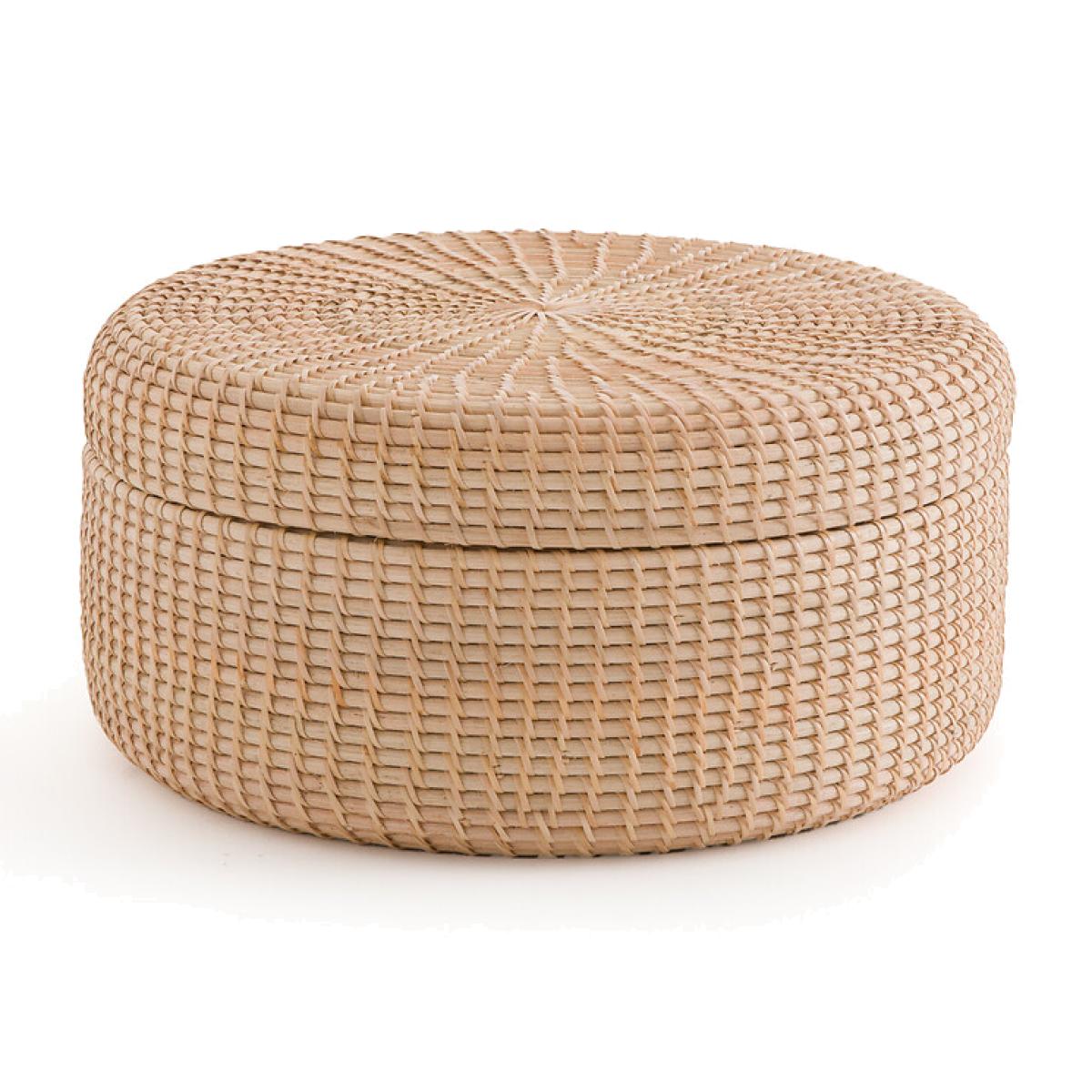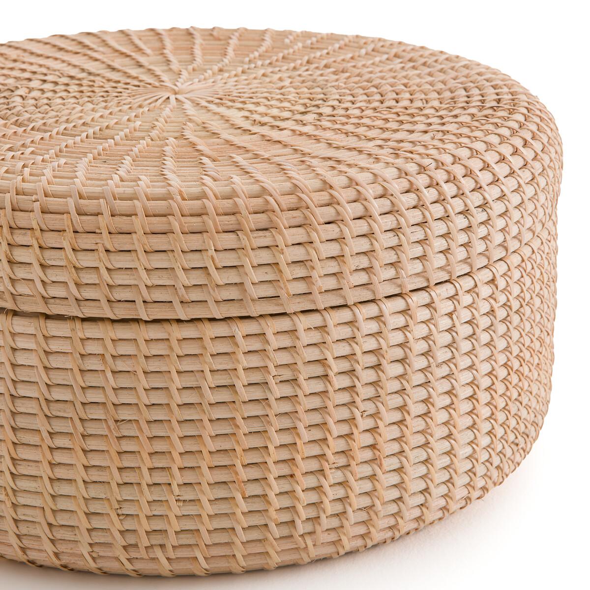 A natural harmony. Hand-woven and rounded, this rattan box is both functional and aesthetic. In the living room or dressing room, it is suitable for storing small everyday things. Product Details • Hand woven rattan • Artisanal craftsmanship. Dimensions • Diameter: 40cm • Height: 20cm Parcel dimensions and weight • 1 parcel • L42cm x H42cm x D22cm. 2kg.