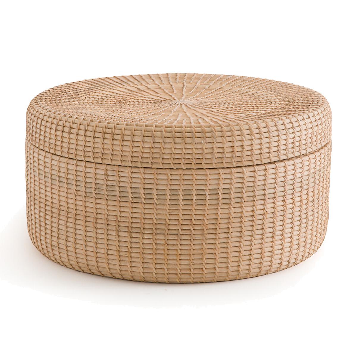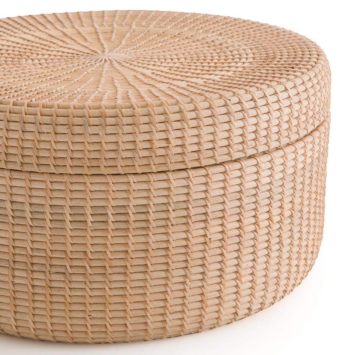 A natural harmony. Hand-woven and rounded, this rattan box is both functional and aesthetic. In the living room or dressing room, it is suitable for storing small everyday things. Product Details • Hand woven rattan • Artisanal craftsmanship. Dimensions • Diameter: 50cm • Height: 25cm Parcel dimensions and weight • 1 parcel • L52 x H52 x D27cm. 2.5kg.