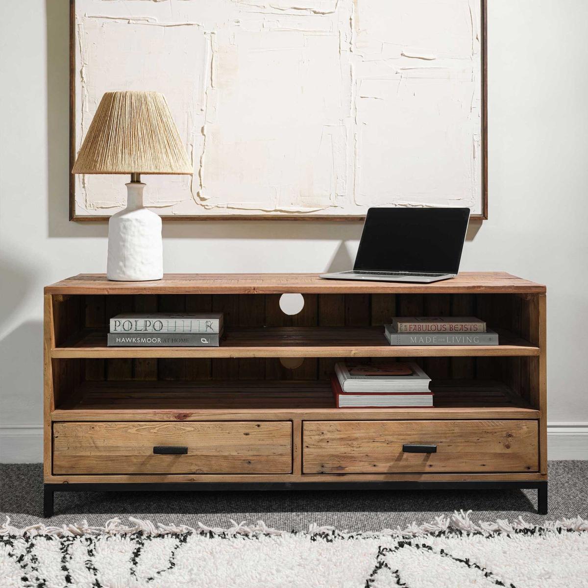 I love the Yukon TV stand for its warm, natural wood finish and clean lines, making it versatile enough to suit a range of interior styles, from rustic to modern minimal. It works particularly well in neutral, Scandinavian, or farmhouse-inspired settings where its understated aesthetic can shine. Style-wise, it’s worth pairing it with textured soft furnishings or greenery to soften the natural wood look. Practical tips include utilising the open shelves for media devices or decorative objects, while the drawers provide excellent storage for remotes, cables, or DVD collections, helping keep your space clutter-free. Its sturdy build also means it’s suitable for larger TVs, grounding your media setup with a cosy, inviting feel.
