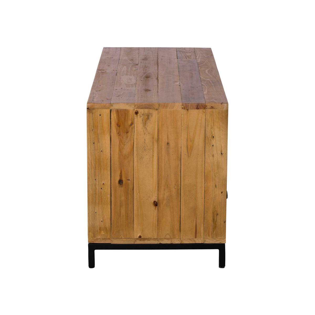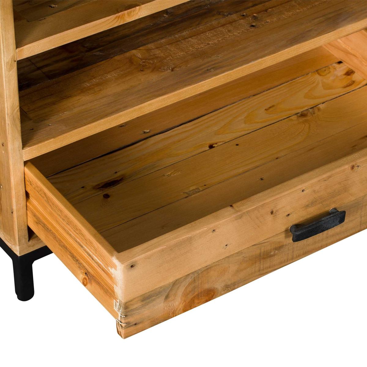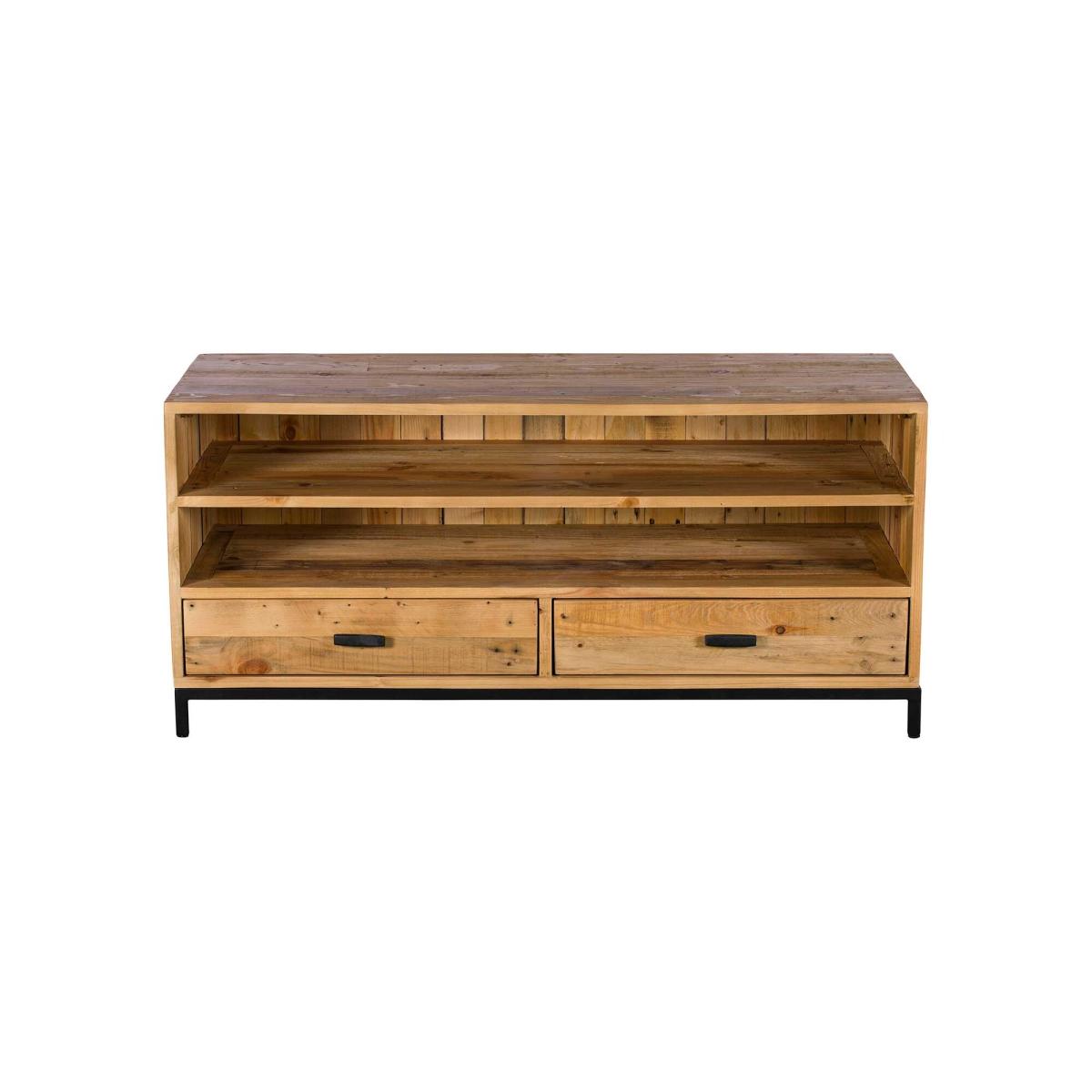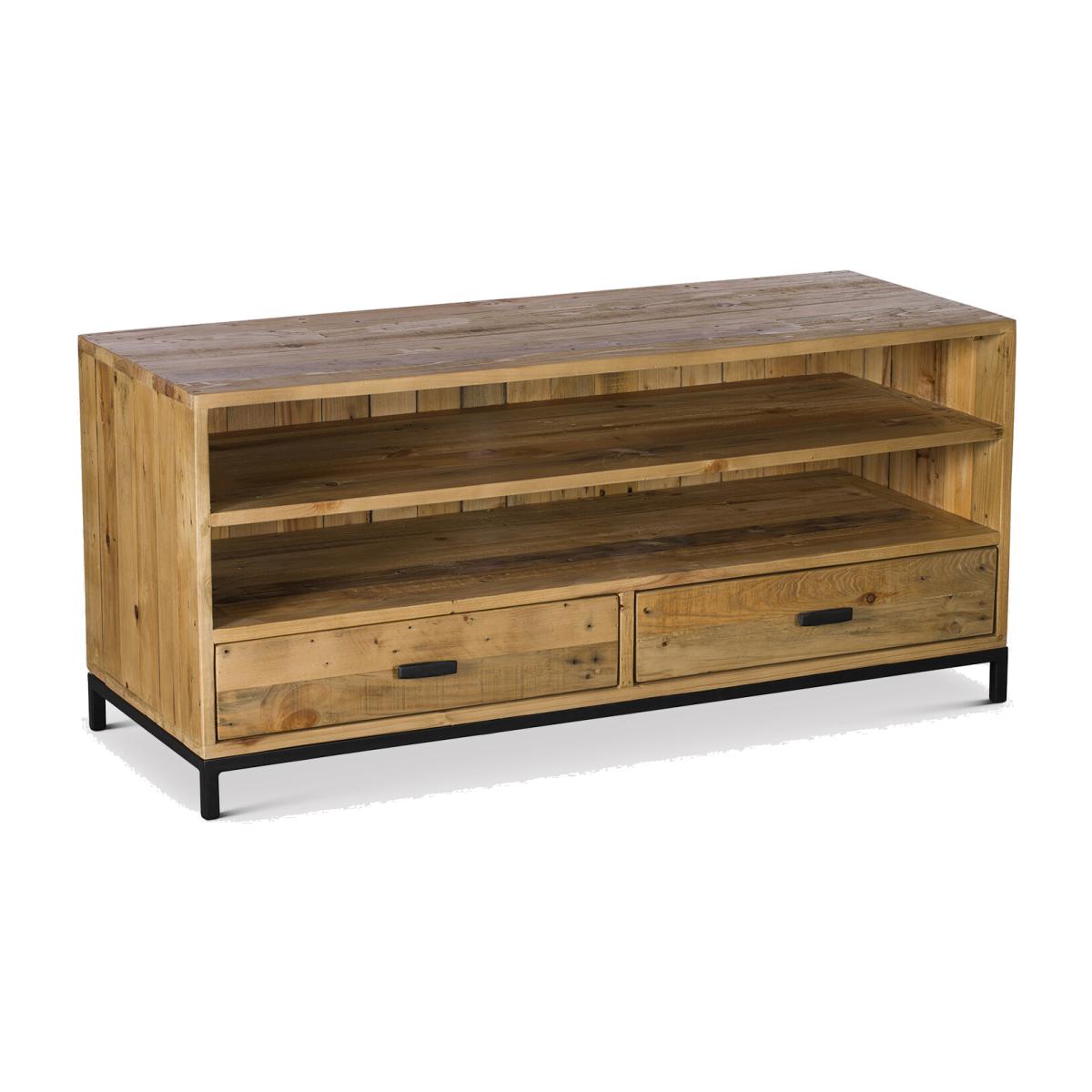 Infuse a touch of rustic charm into your entertainment space with the Yukon Reclaimed Wood TV Unit. Crafted from solid reclaimed timbers, this unit boasts a rustic aesthetic, complemented by a black metal base and handles. With two shelves and two drawers, it offers generous storage for your media devices. Elevate your home decor with this stylish and functional TV unit, marrying the allure of rustic design with practical storage solutions.