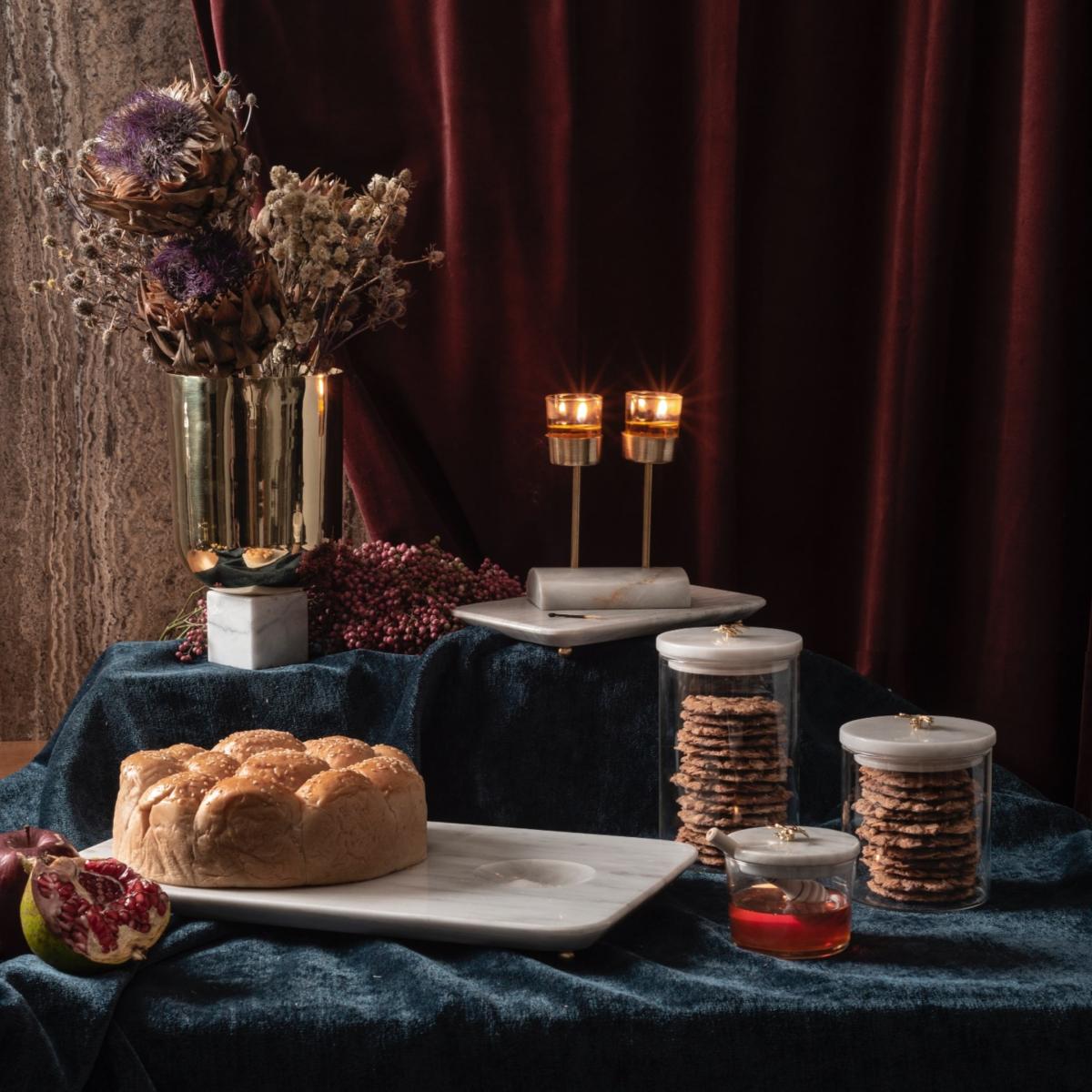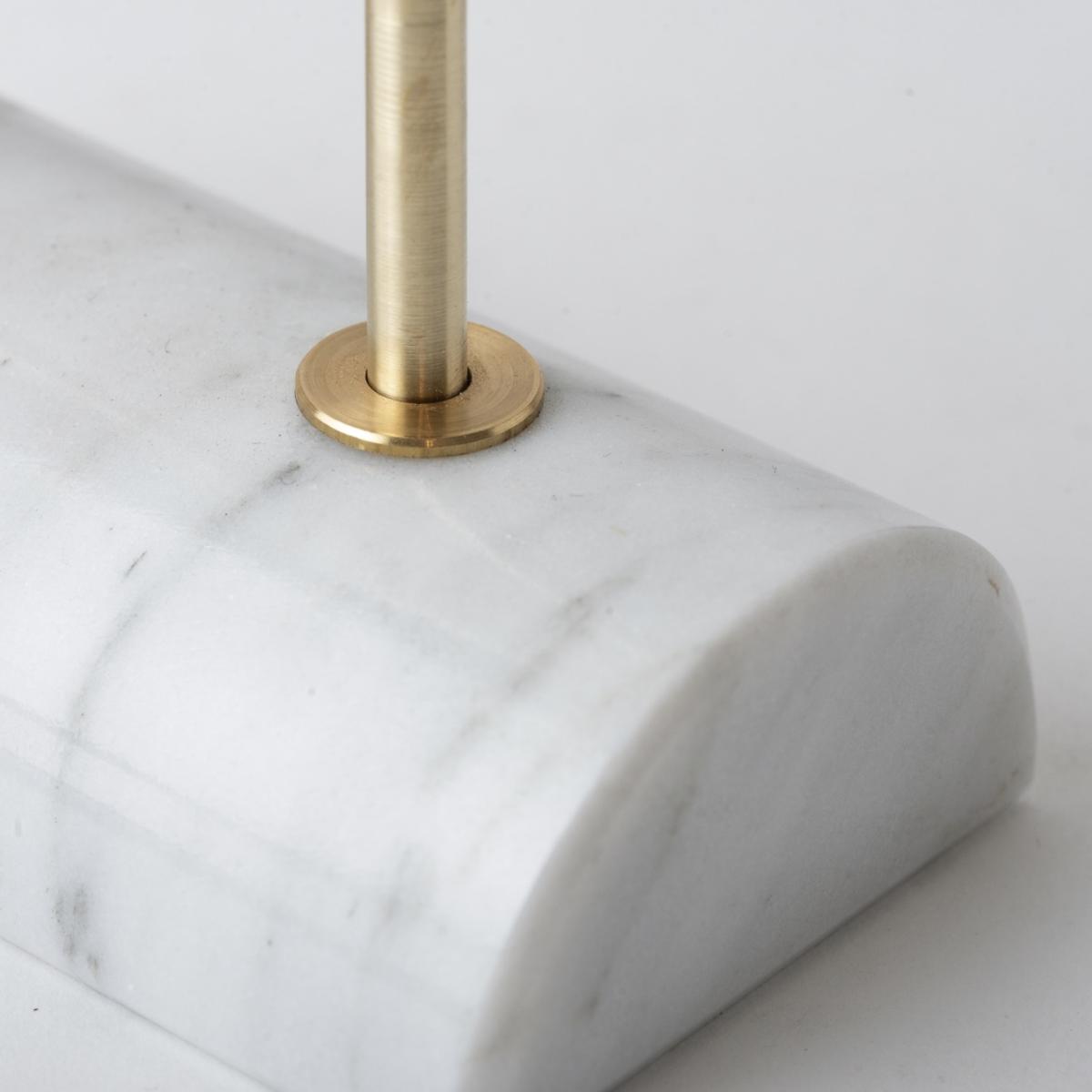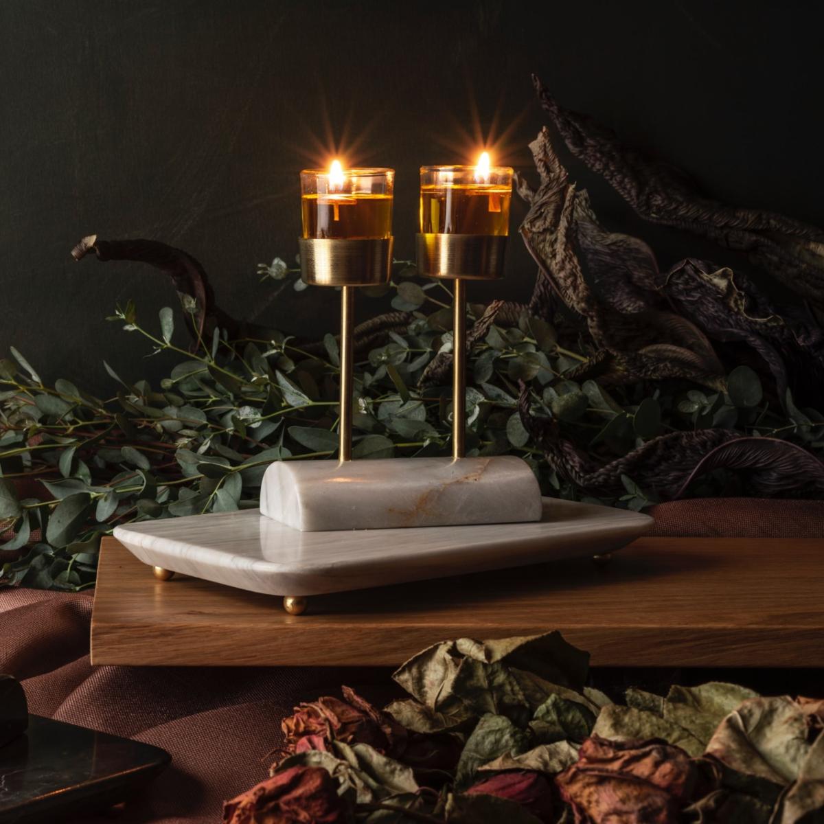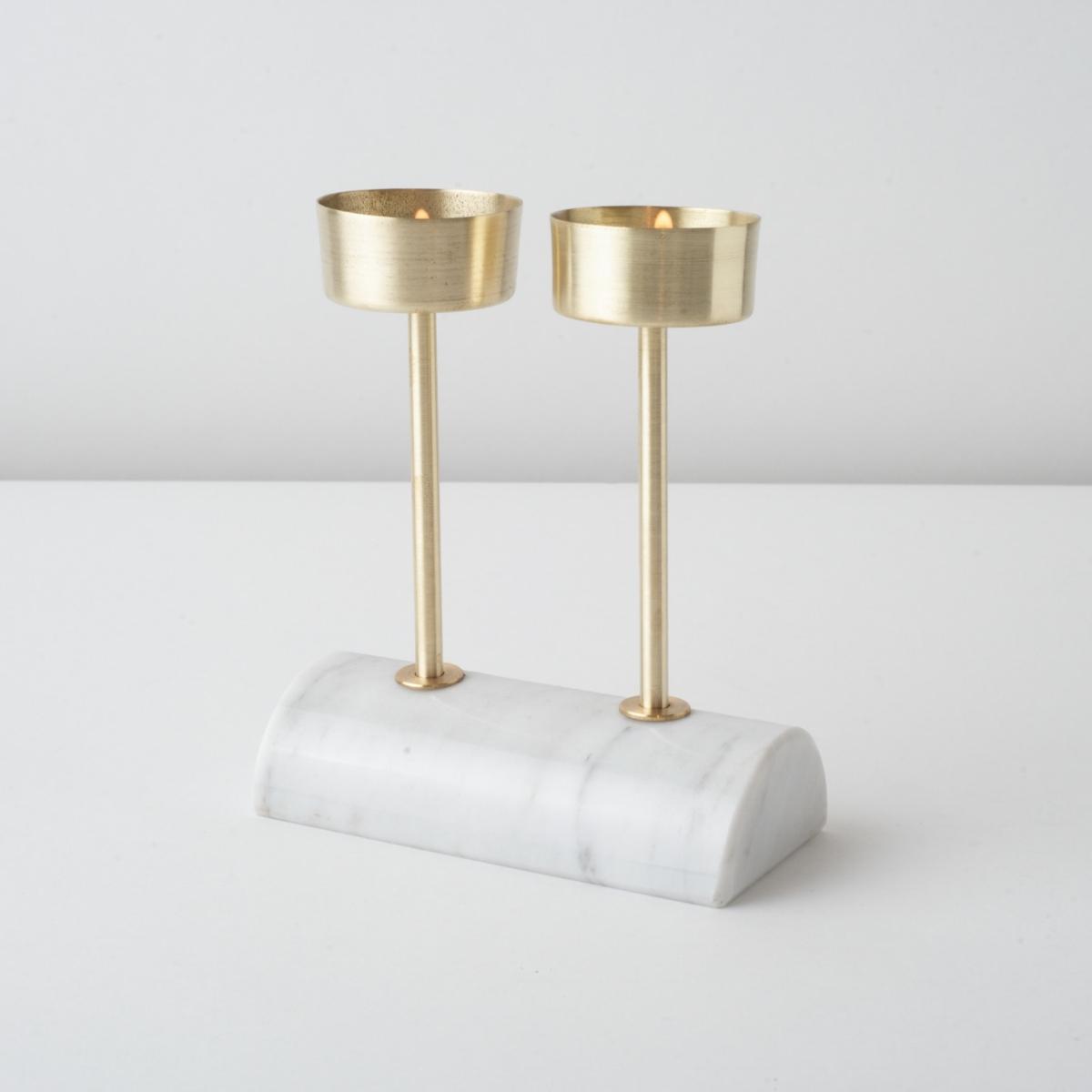 This decorative and luxurious piece combines a hand-carved marble base with two brushed brass poles, creating a visually stunning contrast that is sure to captivate the eye. Crafted with the utmost attention to detail, this two-in-one candle holder boasts a modern and sophisticated design that will elevate any living space. Light up your world and set the mood with two small tealight-type candles, creating a warm and inviting ambiance that will leave a lasting impression on all who enter. Each piece is lovingly handmade, ensuring that no two Yunta Tealight Candle Holders are exactly alike. With its impeccable quality and unique character, this exquisite creation is the perfect addition to any luxury home décor collection.