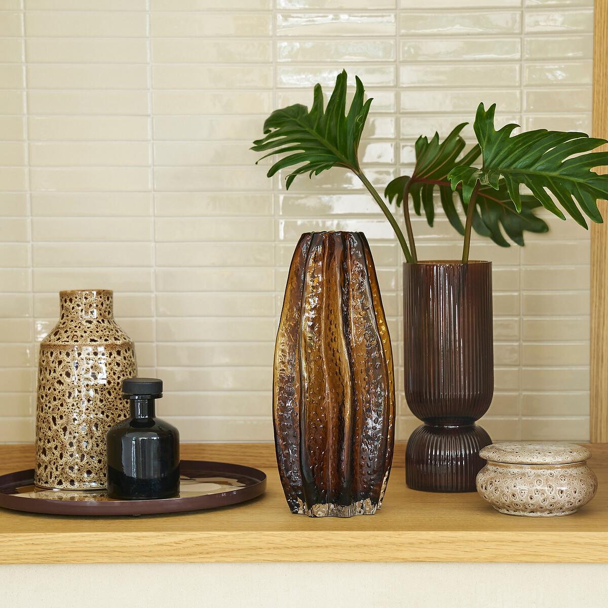 I love this vase for its rich amber hue and textured finish, which add warmth and visual interest to a variety of interiors. It works especially well in modern or mid-century styled spaces, where its organic form can create a striking focal point. Practical styling tips include pairing it with minimalistic greenery or a few long-stemmed flowers to highlight its height and texture. It’s also versatile enough to work well on side tables, mantelpieces, or as a standalone statement piece on a sideboard. Due to its colour and texture, it pairs beautifully with taupe, beige, or deep earthy tones, making it an easy way to introduce colour and depth into a neutral palette.