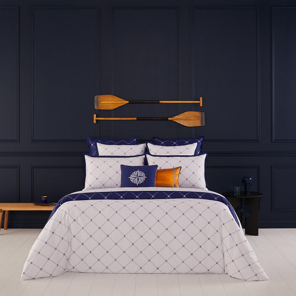 Transform your sleep space with this Encre duvet cover from Yves Delorme. Inspired by the romance of being at sea, this nautical design features miniature marine emblems and the Yves Delorme logo. Pair with the matching pillowcase to complete the look. Key features: * Material: 100% organic cotton sateen * Dimensions: 240x220cm * Blue and white colourway * Nautical design * Indulgent 300 thread count * Machine wash at 40°C