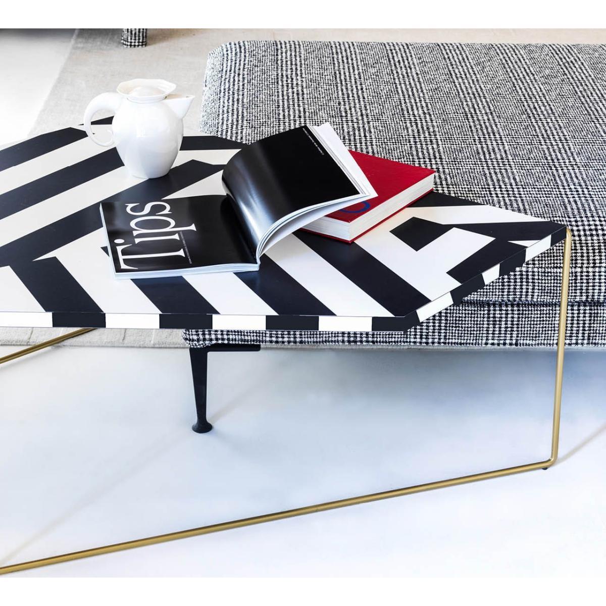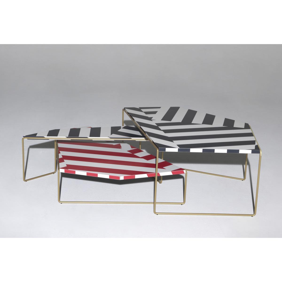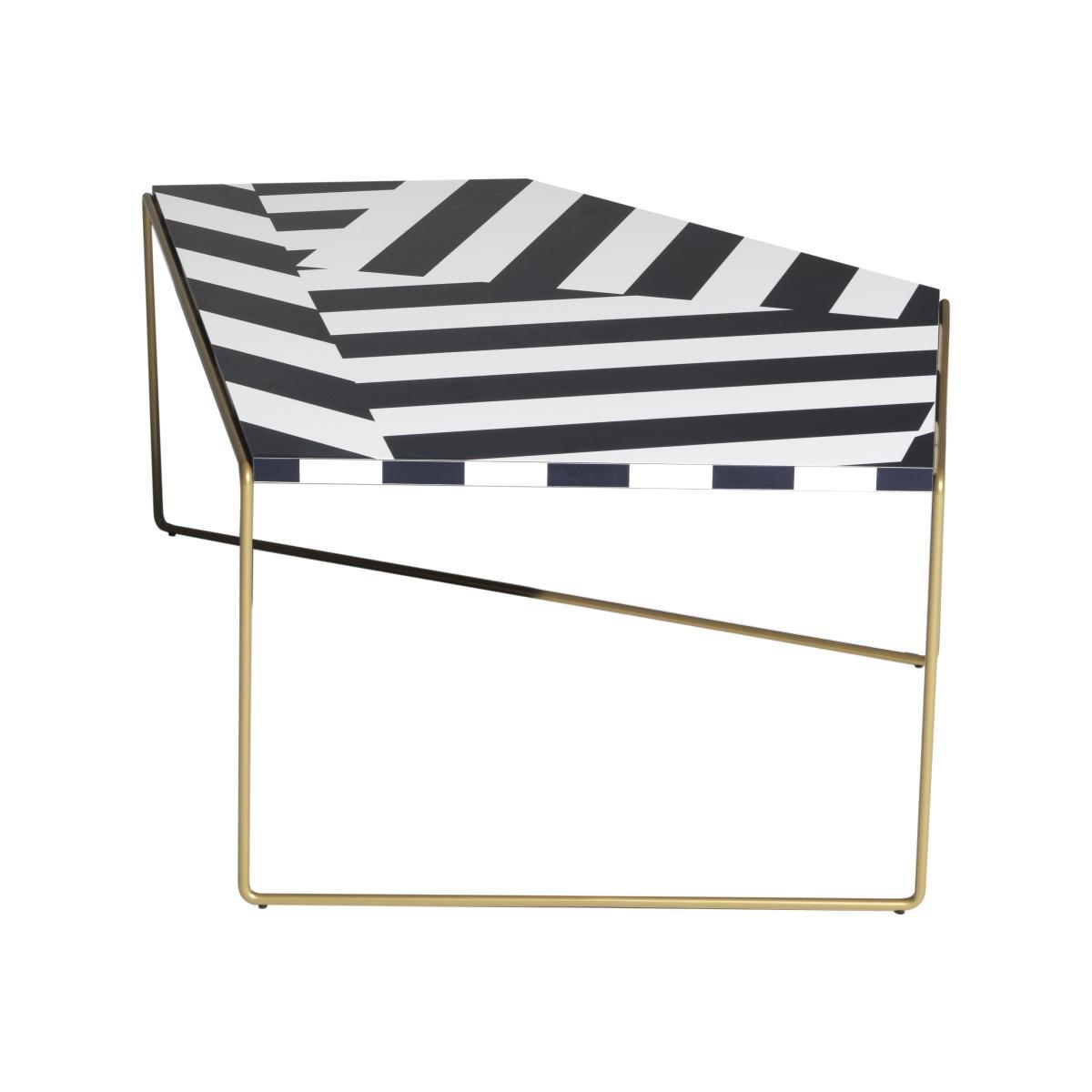 "With its Zagazig coffee tables, Driade Lab offers a fresh look at contemporary decorative arts. Graphic and contemporary, these coffee tables feature angular, asymmetrical geometric lines. Straddling the border between art and design, they are covered with incredible colourful decorations. Made in Italy, their high-end laminate tops are digitally printed. The very high definition printing gives an illusion of breathtaking depth. These furniture items are true paintings on which the Driade Lab designers give free rein to their creativity. As part of the optical art movement, this extraordinarily playful geometric design gives the impression of movement and vibration. It has an asymmetrical collage of broad black stripes. The repetitive, dynamic pattern includes random intermissions. It plays with the use of breaks, offsets and continuity. The sideboard thus becomes a rhythmic surface of events, movement and depth. This precision and rigour in the lines evokes the work of artist Daniel Buren with his "striped interventions", very popular in the 70s. Chic and ethereal, the wired base is made of golden steel. ".