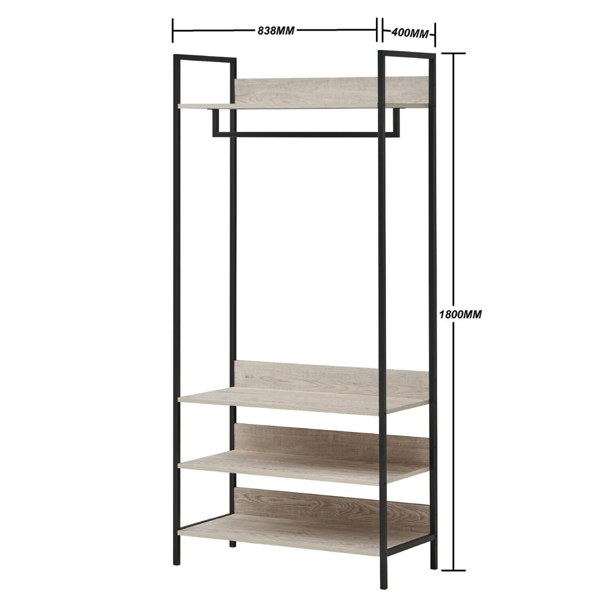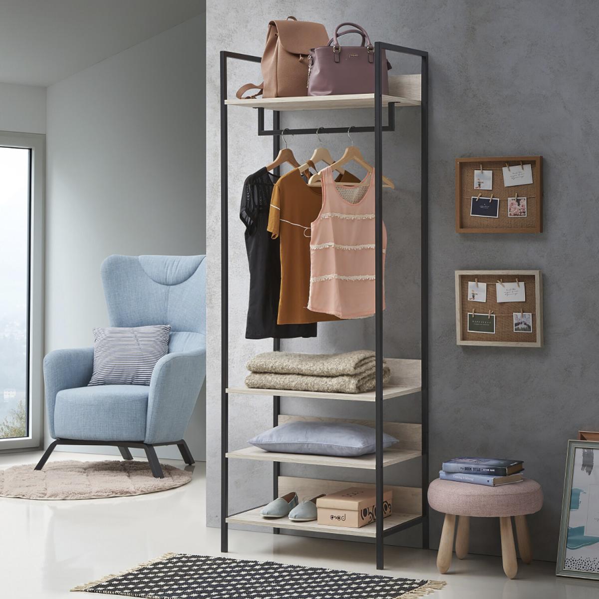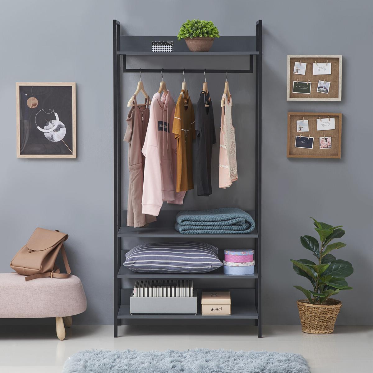I’m a big fan of the Zahra rail for its clean lines and on-trend Wotan oak finish - it brings warmth to minimalist, Scandi or industrial-style bedrooms without feeling bulky. The matte black metal frame is sturdy yet light, so it’s equally at home in a compact city flat or a loft bedroom. To style it, hang your everyday garments at eye level, then use the four lower shelves for woven baskets or neatly folded jumpers and jeans. Add a couple of matching storage boxes on the top shelf for off-season items, and finish with a small plant or a stack of books to soften the look.
