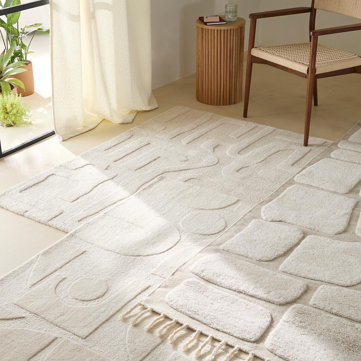 Calm and tranquillity in your home. Hand-woven in wool, the Zalya rug features organic prints in different pile heights. Beige and ecru, comforting, it makes your room warm and welcoming. An exclusive by La Redoute Interiors. Product Details • 100% wool fibres • 2300g/m2 • Thickness: 1.5cm/0.5" • Weaving type: Handmade • Fringed edging • Underfloor heating compatible: Yes • Interior Use:Yes • For outdoor use: No. Quality Info • Wool is a warm and comfortable fibre. A wool rug is also an excellent thermal and sound insulator. • Hand-woven, each piece is unique and may have small irregularities that give it its authenticity. Colours and dimensions may vary slightly. Care Instructions • Once unrolled, you must wait a few days for the carpet to return to its initial shape. • To keep the edges flat, roll your mat in the opposite direction. Leave it like this for an hour then put it back flat and place a heavy object on it for 2 days. • New, the carpet may give off an odour which dissipates over time. Ventilate your room regularly to reduce it. • To preserve its appearance, rotate your rug regularly in one direction or the other to minimise localised wear in the same places (due to successive passages), and loss of colour due to regular light exposure. Care Advice • Some materials are very fibrous (such as wool) Wool rugs pill naturally during the first few months: this is a normal for this type of product and is not a defect. Remove the excess fibres by hand where possible, do not use a vacuum cleaner with a rotating brush as this can pull and tear the fibres. The pilling will improve over time. • For maintenance, we advise you to vacuum it very little the first month and then to vacuum it without rubbing too much always without using the brush. • Compatible with robot vacuum cleaners: No • Remove stains immediately with a clean, damp cloth. • Dry clean recommended. Dimensions • Width 120 x Length 170cm • Width 160 x Length 230cm • Width 200 x Length 290cm • OEKO-TEX® Standard 100. Standard 100 certification by OEKO-TEX® tests textile products for harmful substances via an independent, international label.