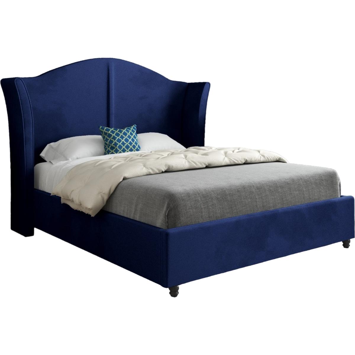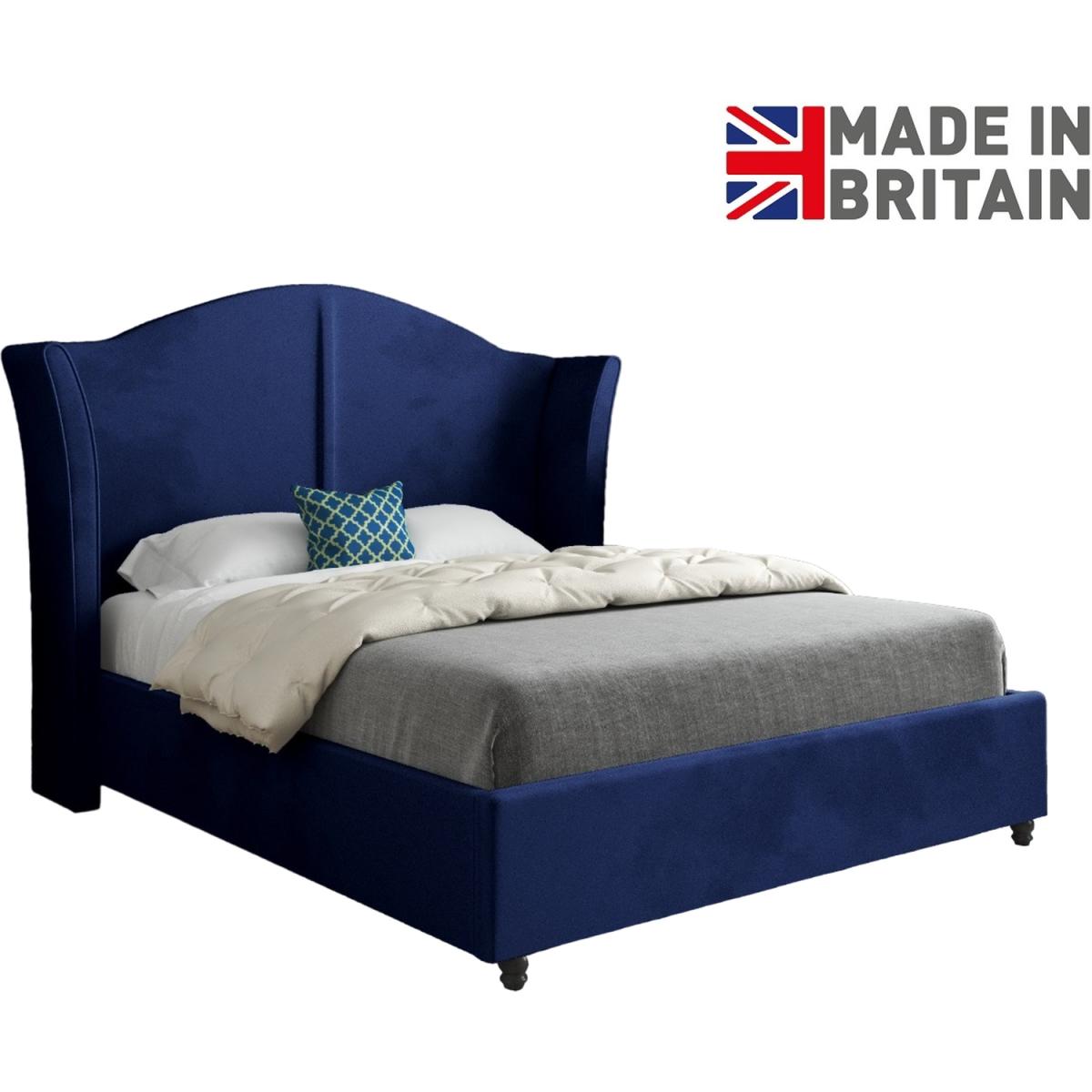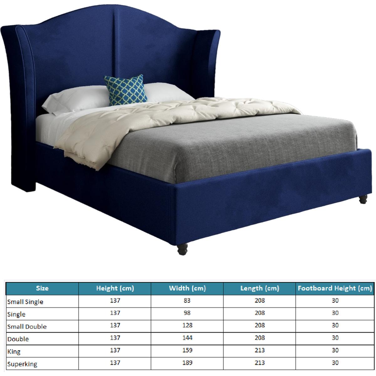 Curved breath taking unique headboard design with piping on the curved wings which flow beautifully. The upholstered foot is complemented by classic wooden feet. The headboard is available plain as pictured or with chesterfield pleated upholstery to suit your interior decor. The shape of the headboard is guaranteed to create feature and focal point to your room. This elegantly curved headboard bed is a beautiful addition to any home. Robust wooden construction and slatted base to give ventilation to your mattress. The dramatic shape is a highlight to this enviable bed frame.
