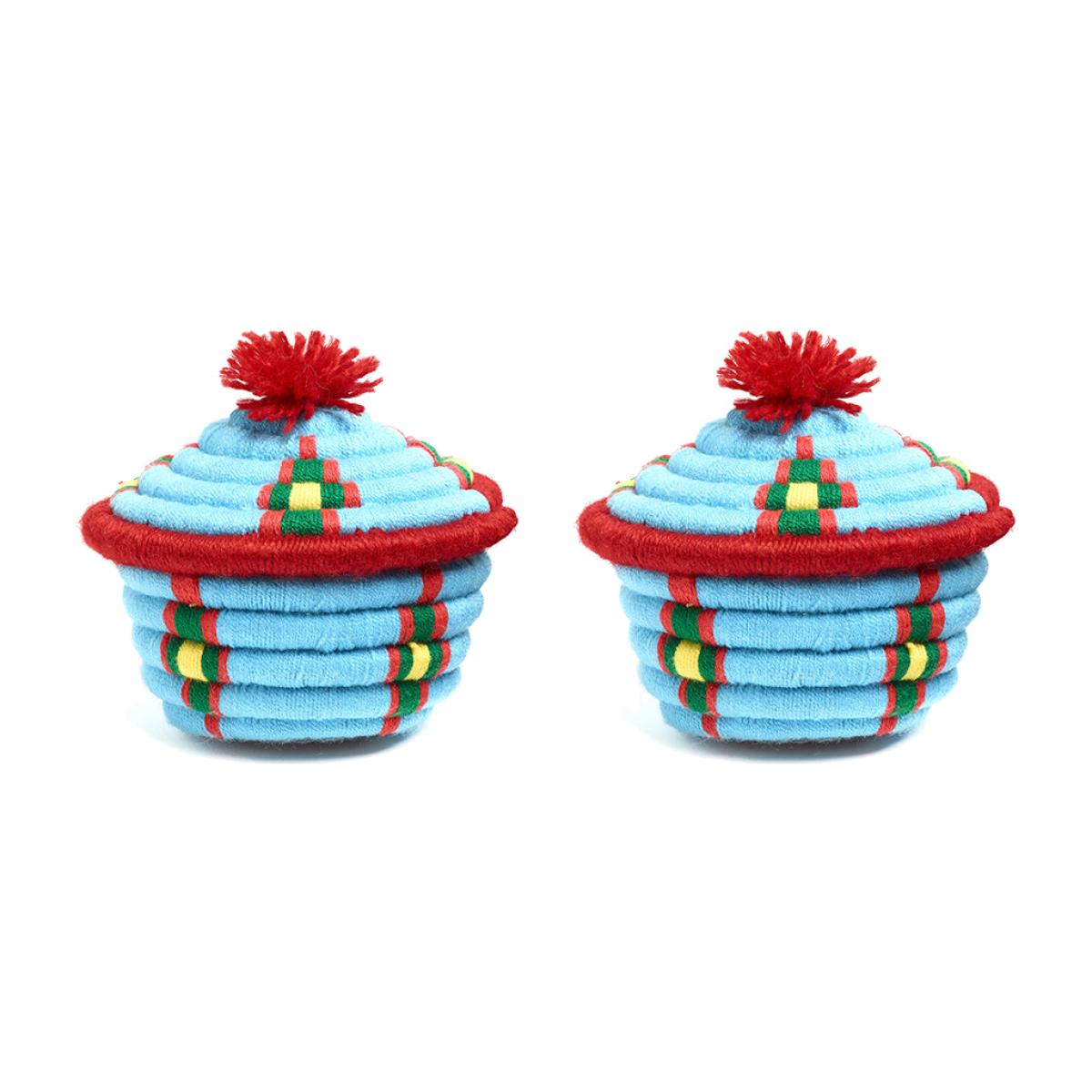 Brighten up your interior with these Dokht baskets from Zan Artefacts. Boasting a beautifully vibrant pattern with pom pom detailing, they are handwoven in Persia by skilled female artisans using ancient techniques. Key features: * Set of 2 * Material: date palm leaves and kertak * Dimensions: 11x6cm (approx.) * Blue colour * With a colourful diamond pattern * Pom pom detailing * Handmade in Persia * Please note, due to handmade nature variations can occur