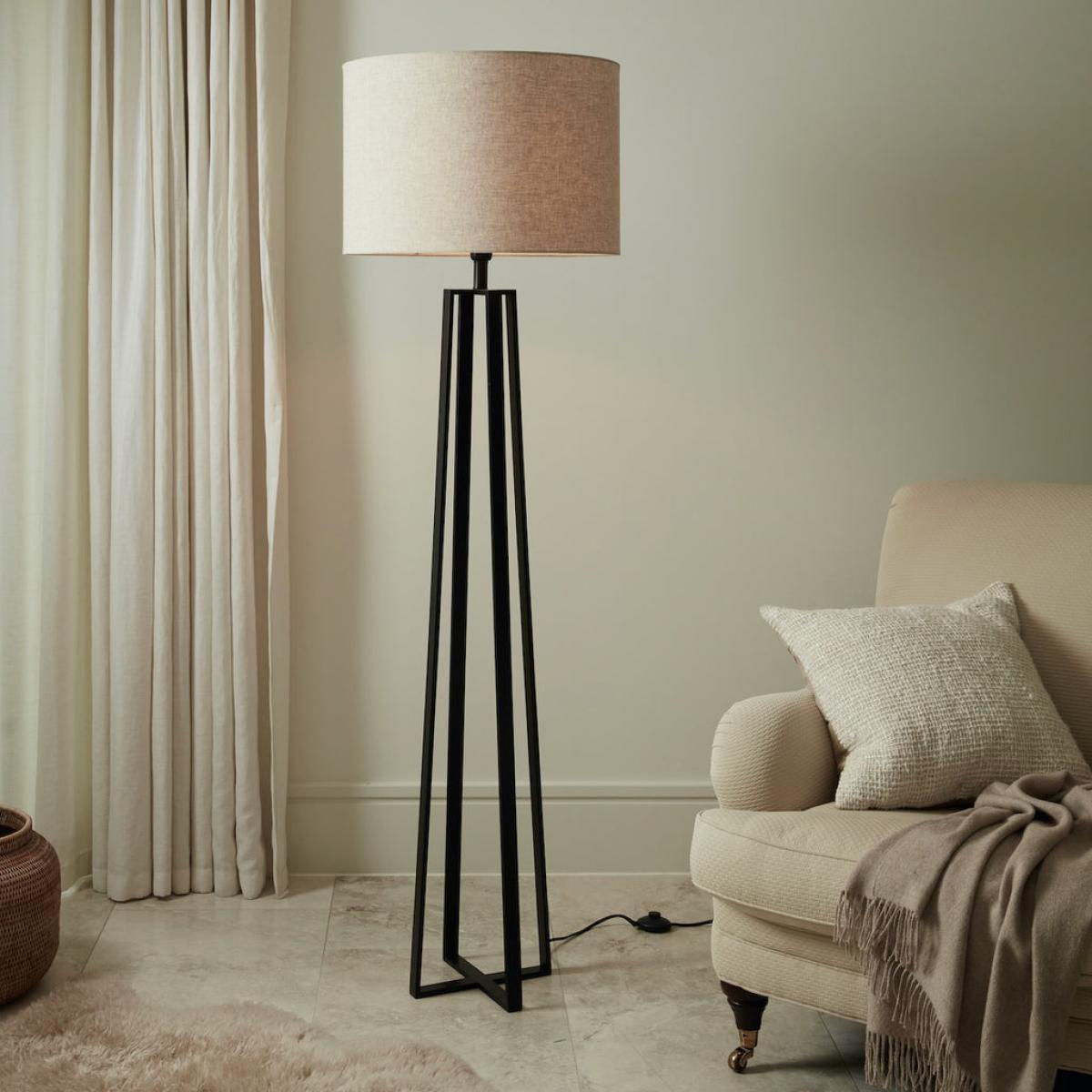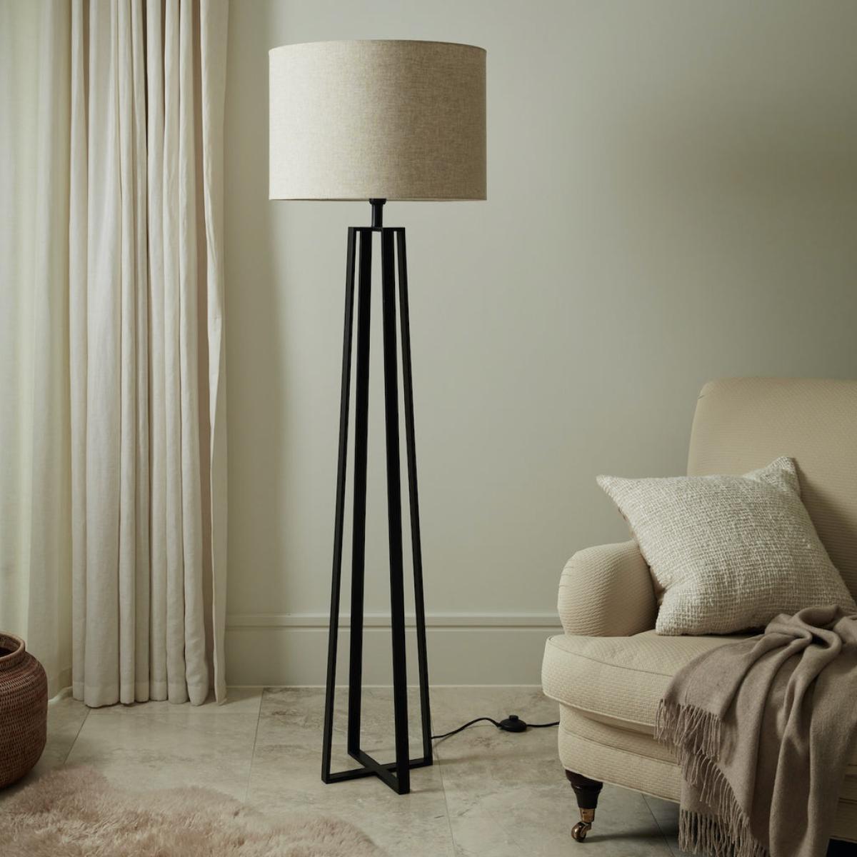 The Zane floor lamp has a sleek design with 4 stems off matt black metal forming the base and topped with a large natural coloured cotton drum shade. Finished with a chorded lead and on off button for ease of use, this is an impressive floor lamp to make a statement in your home.