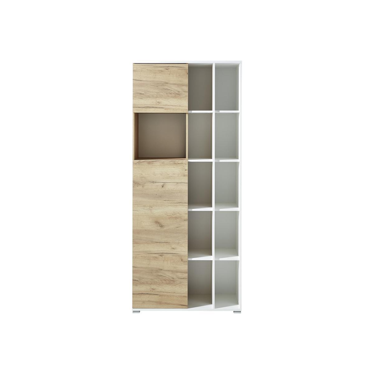 This is a self- assembly item Large and versatile filing cabinet in a white and Navarra oak finish. While it suits a home office, this sleek and stylish shelf unit looks great anywhere. Can be assembled in reverse. Why youll love it Simple functional design, with versatile storage. Contemporary style at a great value price. In a white and warm Navarra oak finish. The melamine finish is strong, scratch and stain- resistant. Perfect for a home office, but so stylish it looks good in any room. With open shelves and two push- open cupboards. German designed and precision- made to a high standard. What you need to know Easy self- assembly required, full instructions included. Cupboard has a push- open mechanism. Construction is particle board with a melamine resin finish. Haptic wood finish resembles real wood in look and texture. The three divided shelves are fixed. Melamine finish safeguards against scratches, stains and heat damage. Protective ABS edging adds durability. Chrome finish metal feet. Shop the Zane home office range for coordinating pieces. WARNING! Furniture can tip over unexpectedly and cause injury. This item must be fixed to a wall using the anti- tip kit provided. Be sure to use the correct wall fixings suitable for the walls in your home. Furniture Village is not able to fix anti- tip devices for you. Seek professional advice if you are unsure.