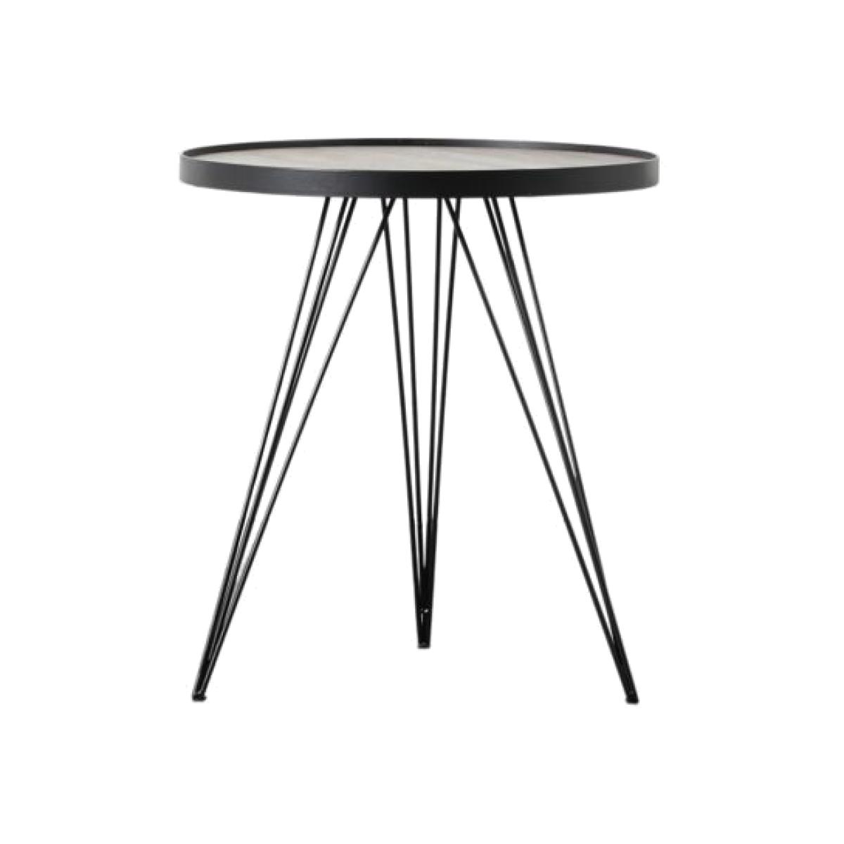 Side table offering a contemporary twist on an industrial look. The angular legs and frame around the table top are crafted from black metal, whilst the inset top is faux timber. A matching coffee tables is available. The tables are part of our Packed-Flat Design Project, offering easy delivery to any room in any property, whilst reducing the packaging needed. Easy assembly is required, but all the tools needed are supplied. Material: Iron. Colour/Finish: Black.