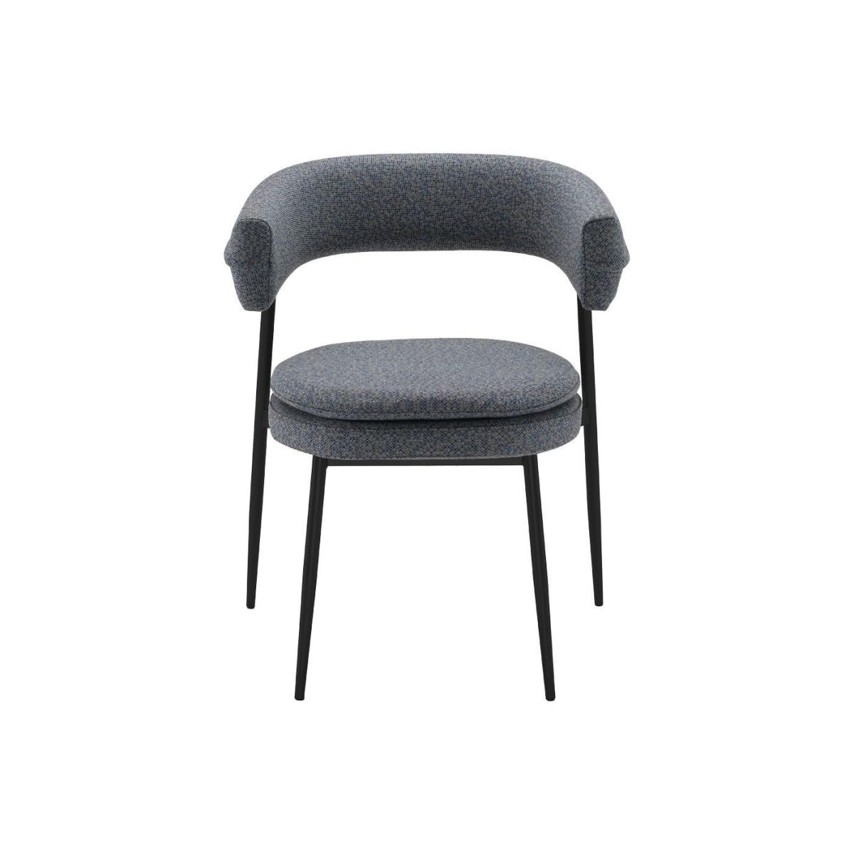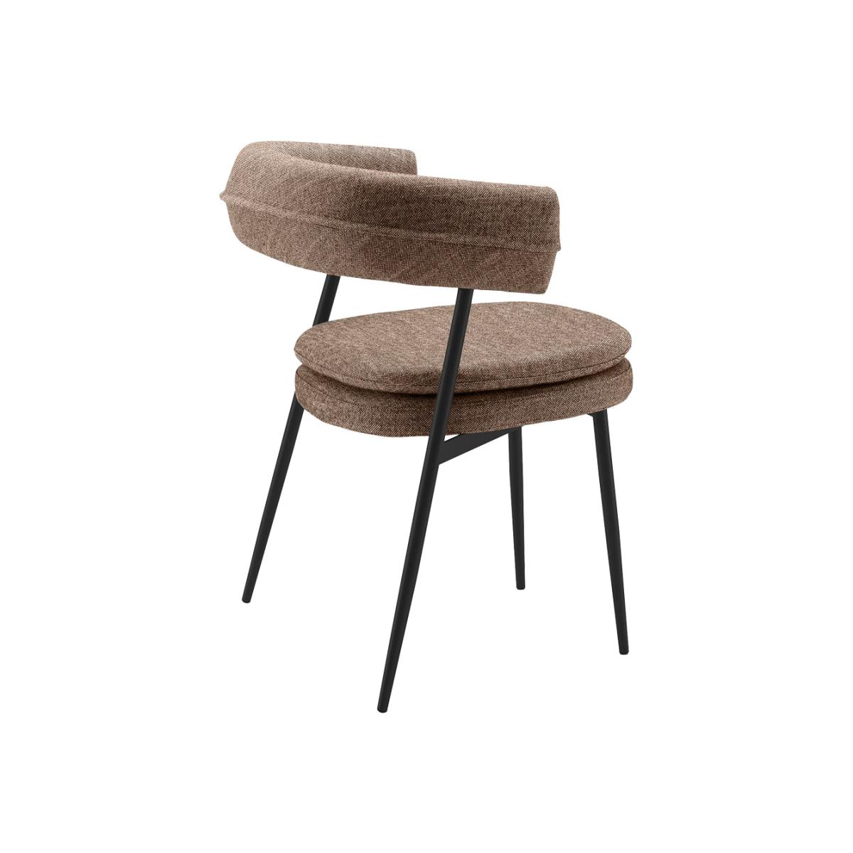 I love this little chair for its sleek profile and comfortable yet understated design. It works particularly well in contemporary or minimalist interiors, where its soft fabric enhances a cosy, inviting vibe. The black metal legs lend an industrial edge, making it versatile enough for both dining rooms and cosy corner seating. For styling tips, consider pairing it with a wooden table to add warmth, or mixing it with softer textiles like cushions and throws to soften its modern aesthetic. Its compact size makes it ideal for smaller spaces or as a statement piece around a larger dining table, offering both function and style without overwhelming the room.