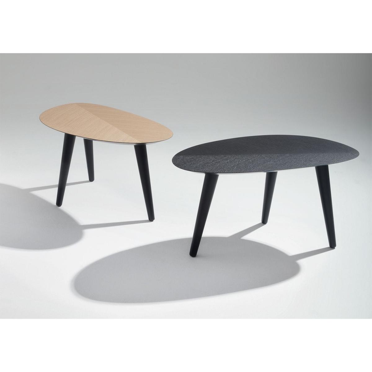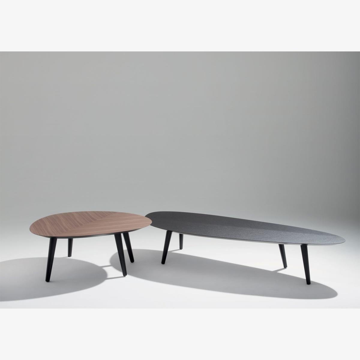 Three coffee tables designed to complete large sofa islands and offer a practical surface at various heights. The surface stands out for the inlaid processing crafted diagonally with a specular game of outstanding precision which lends it an unusual perception, which is different every time depending on the observation point: the thin sheets of wood are carefully placed side by side until the natural lines in the wood create a graphic display, like the veins on a leaf.