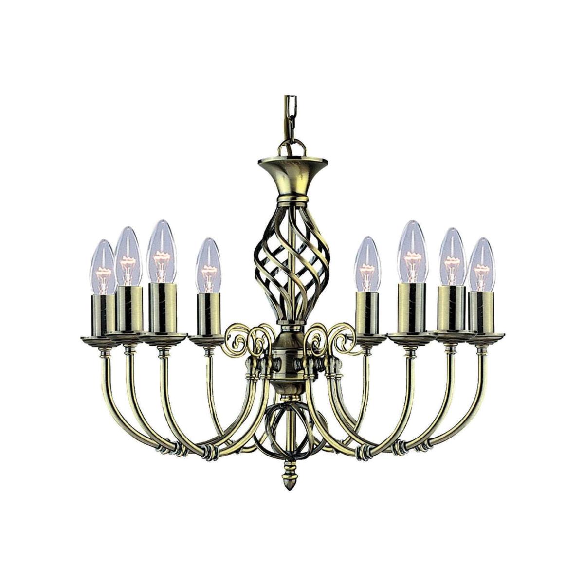 The candelabra fittings allow the light to shine in all directions. The middle pole of the fitting has a vintage design, allowing this range to match perfectly in an old-fashioned, wood-walled dining room. The range offers a choice of sizes to suit all room sizes. This eight light ceiling light is also available in three and six light ceiling lights and a matching wall light. All fittings are available in antique brass and satin silver, and some are also available in black.