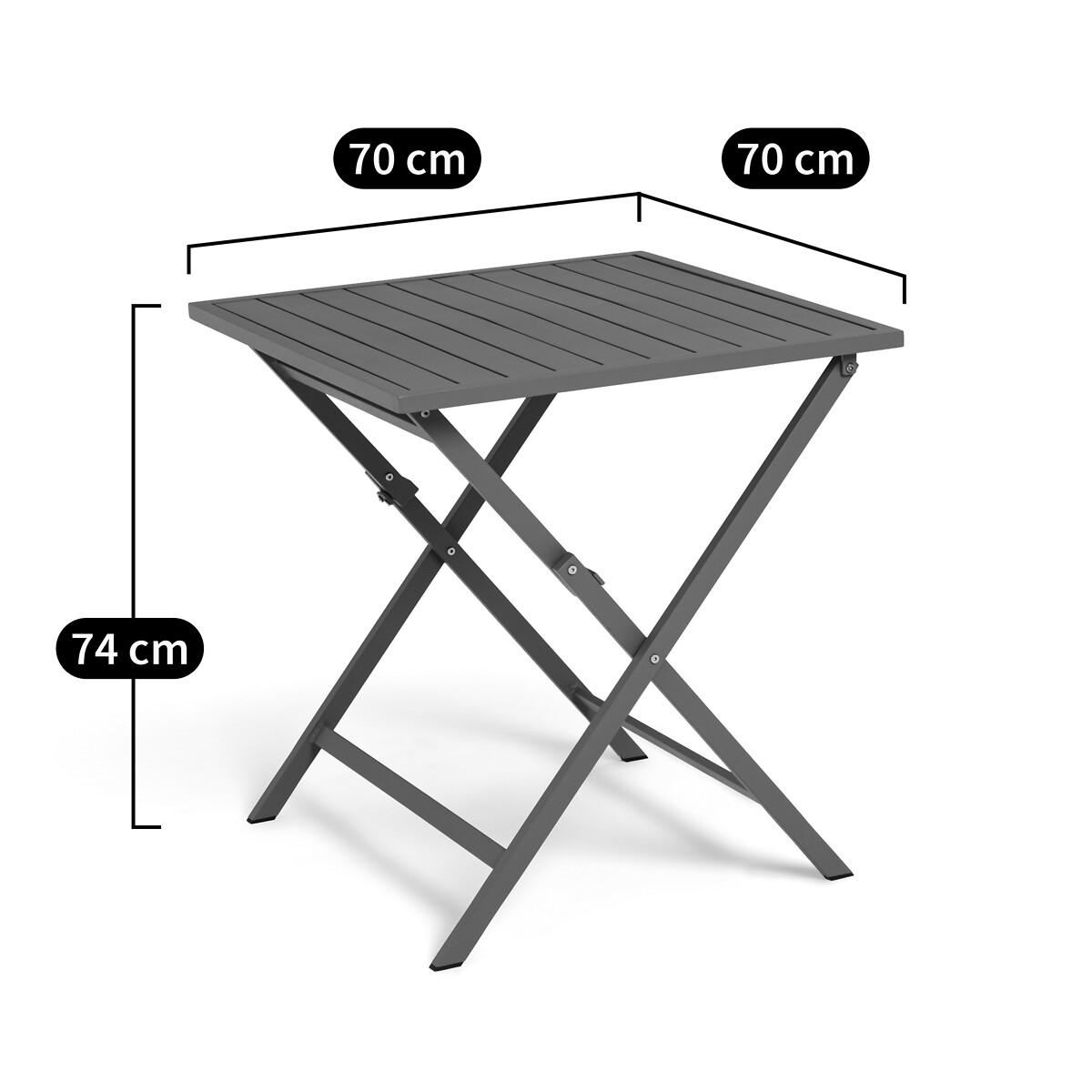Fair weather incoming! To take advantage of it, here is the ZAPY folding aluminium garden table. Robust, light and easy to store, it adapts to all spaces: terrace, balcony, garden... The sun is waiting for you!Product Details • Aluminium frame • 60mm slatted top • Foldable and ultralight: easy to store and transport • Aluminium has the advantage of not rusting and is also very resistant to abrasion. Easy to clean, it can be washed with soapy water. This material is ideal for outdoor furniture. • Sold pre-assembled. Dimensions • Width: 70cm • Height: 74cm • Depth: 70cm • Weight: 6kg Parcel dimensions and weight1 parcel • L102 x H15 x D72cm. 8.5kg