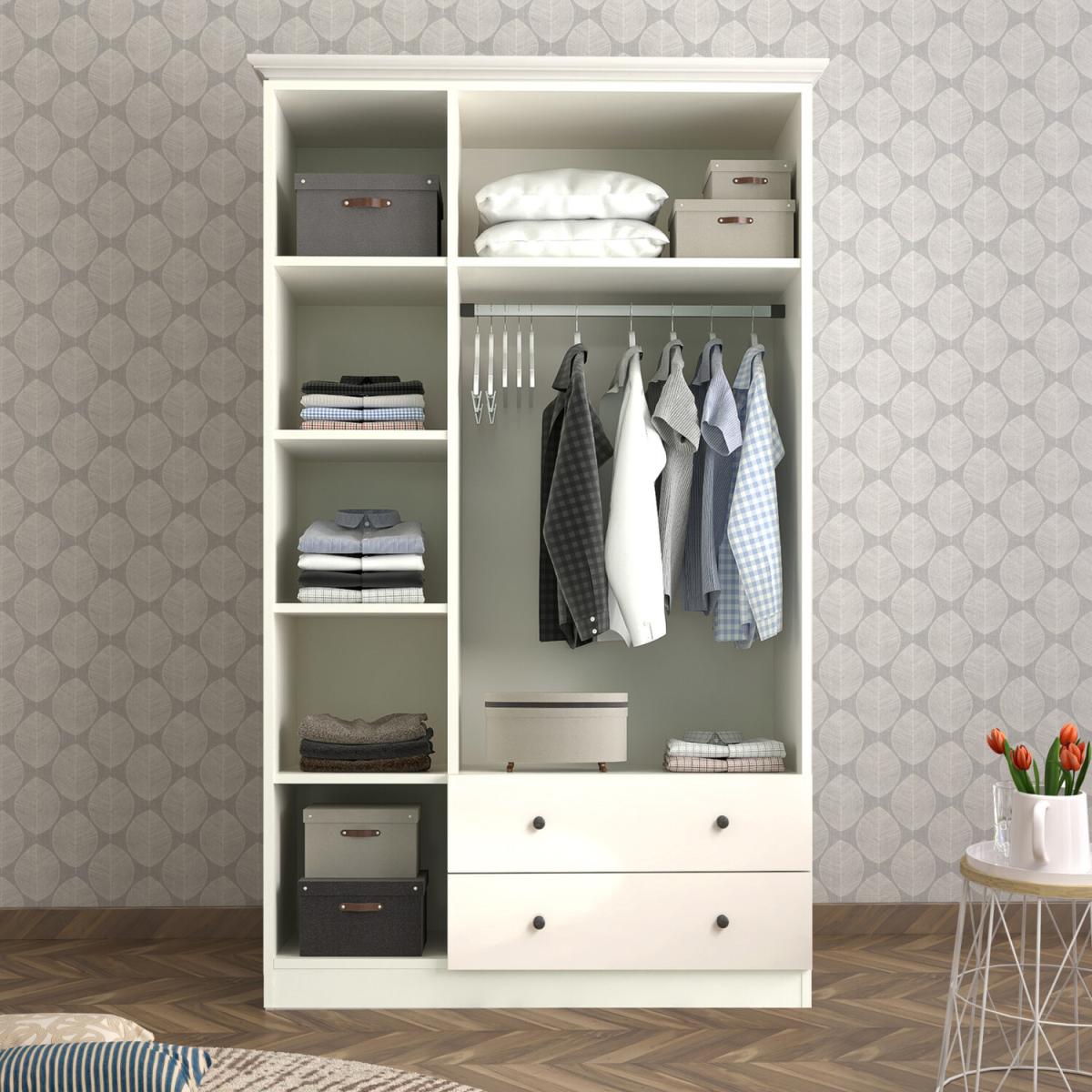 3-door 2-drawer mirrored white wardrobe finished with black handles. Featuring one clothes rail and ample shelving for your folded clothes this unit would suit a modern and classic home settings. Delivered flat packed, assembly required.