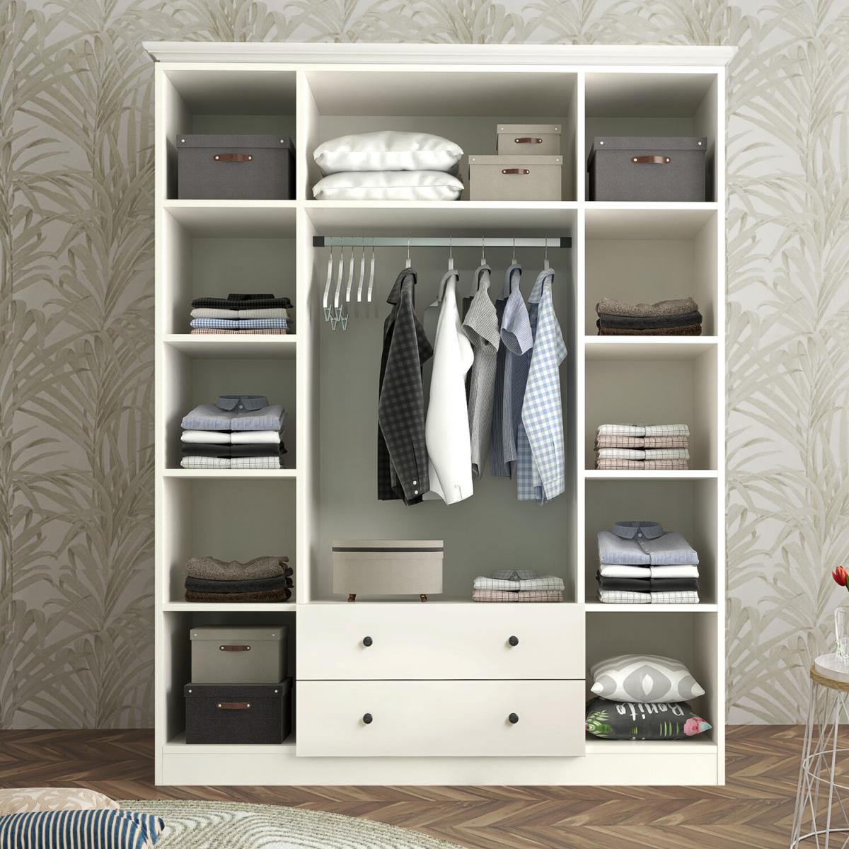 4 door 2 drawer mirrored wardrobe featuring ample shelving space for your folded clothes as well as a large hanging space with metal rail. Finished with tapered style cornicing and black handles this unit would suit classic and modern home themes. Delivered flat packed, assembly required.