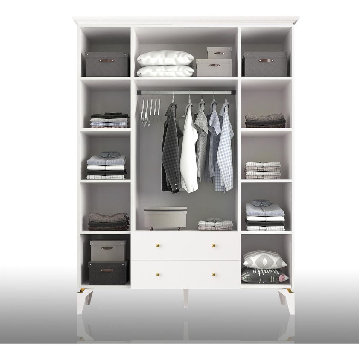4 door 2 drawer mirrored white wardrobe finished with metal handles. Featuring ample shelving space for your folded clothes as well as a large area with metal rails for hanging clothes. Delivered flat packed, assembly required.