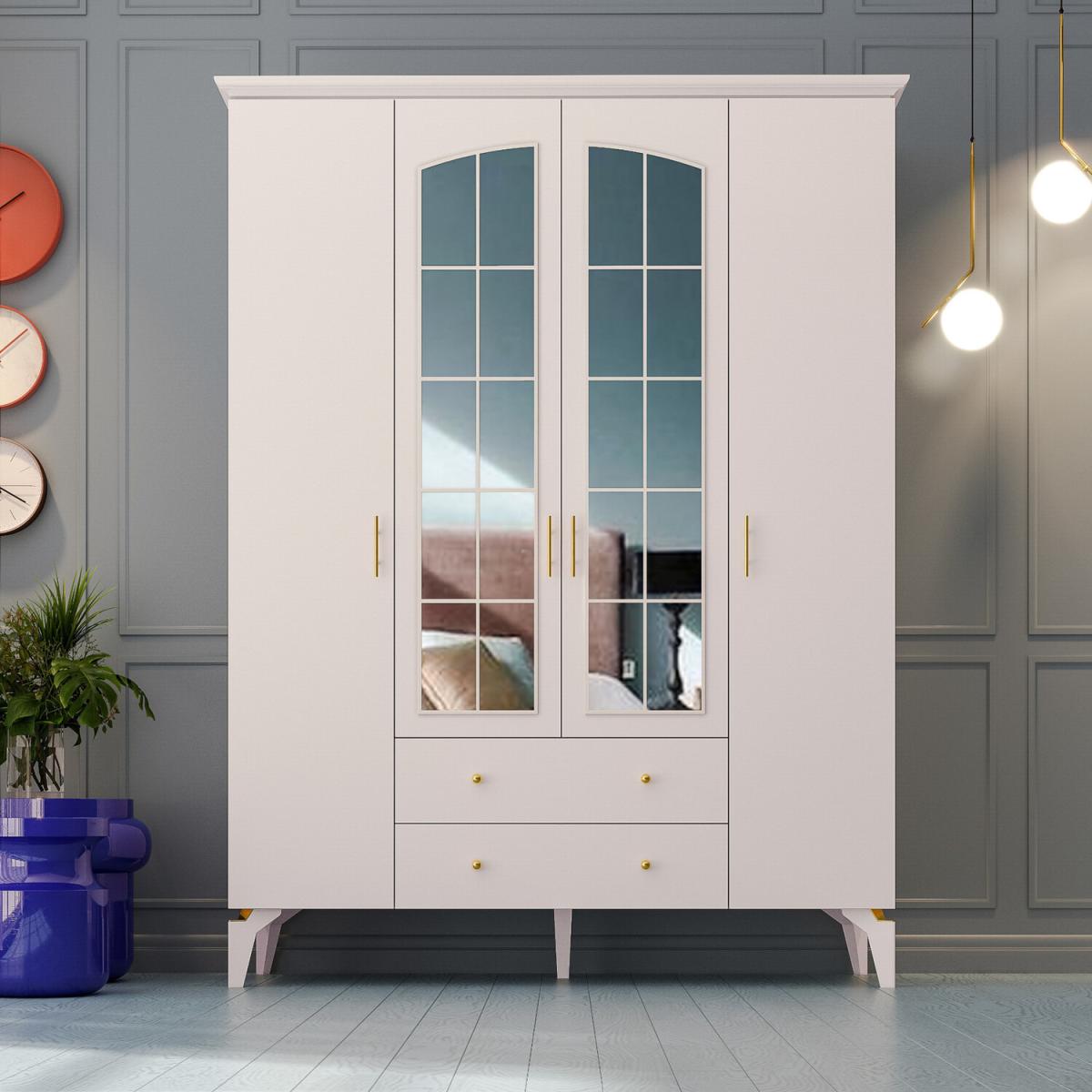 ZARA PLUS 4 Door 2 Drawer Mirrored Wardrobe, White - White