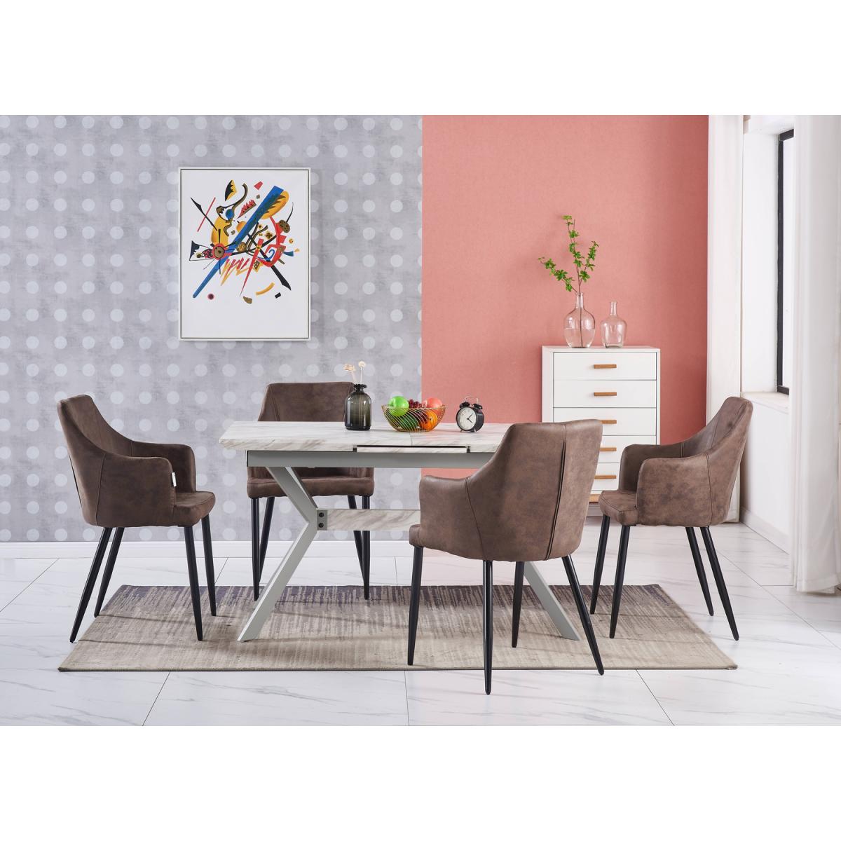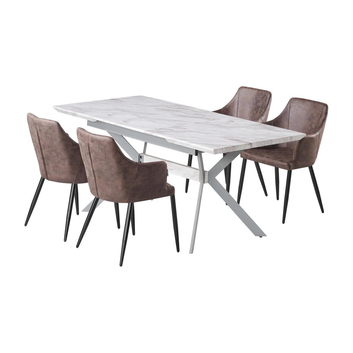 The dining set includes a Blaze Rectangle Dinette Table that features a storage leaf allowing you seating of six with ease. The base is the sculptural cross-shaped design of legs in powder-coated MDF. The chic and innovative table to pass the test of time and help you live better. Comes with the luxurious and contemporary Zarah Armchair that features a high back, metal powder-coated legs, foam padded seat, and back. The metal, powder-coated legs are sleek and sturdy while the foam padding over the body gives comfort and support where it's needed. The high back and armrests make the Zarah armchair perfect for sitting back. The faux leather finish gives this chair richness and the stitching adds detail for a rustic, hand-finished look. The elegant Chair provides you with comfort, and durability while high back with roomy seat areas to relieve the pressure on your back and legs and enable you to relax your body and sit comfortably.
