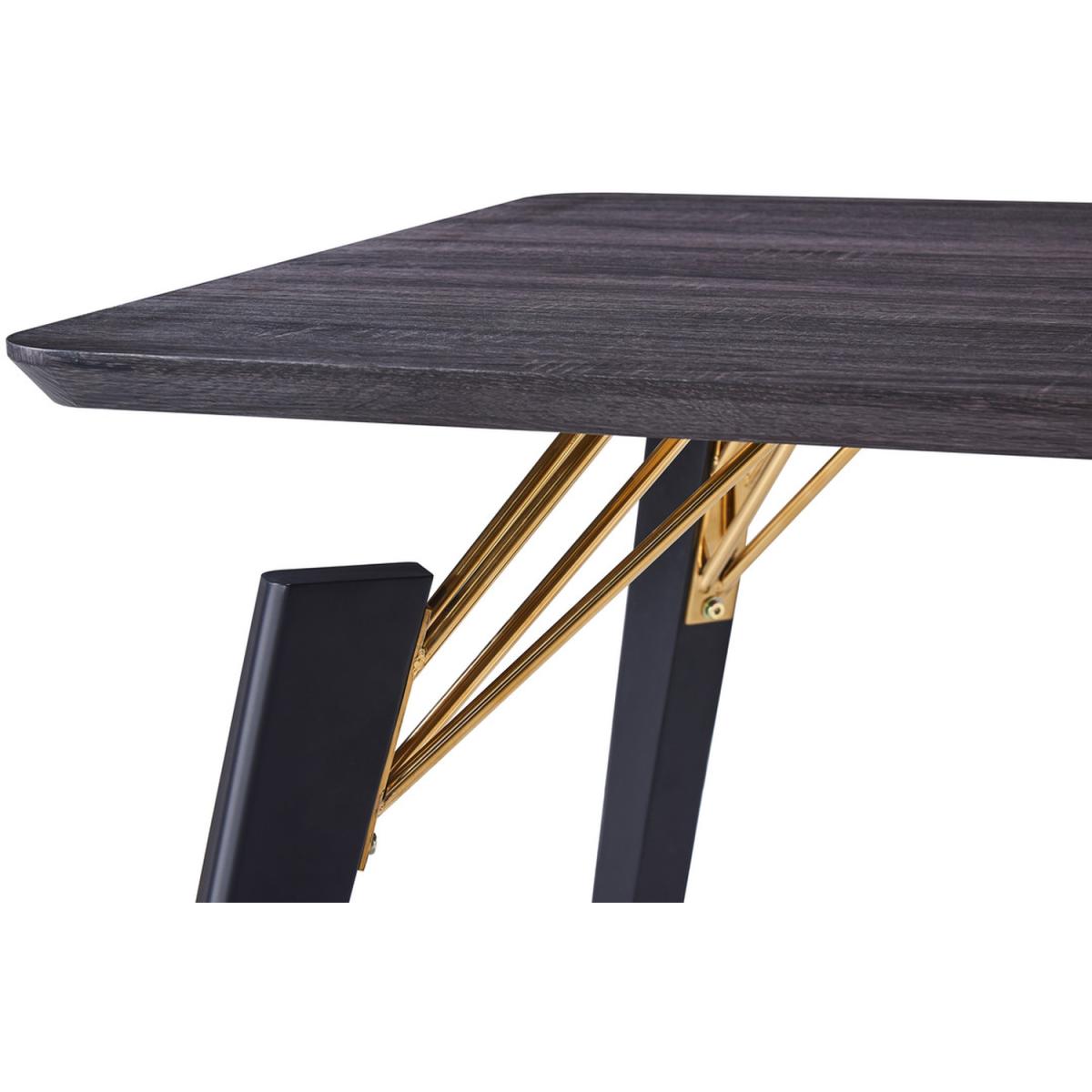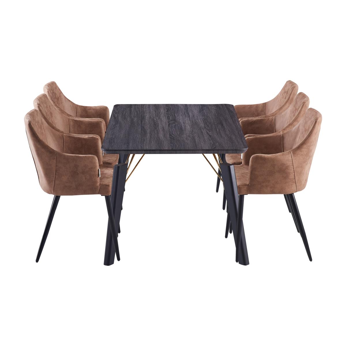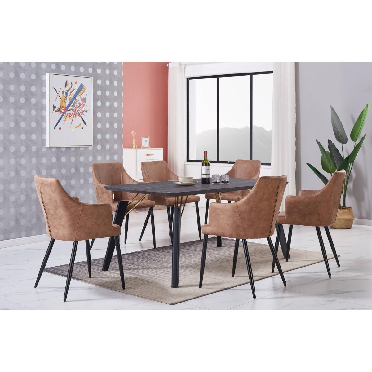 The dining set includes a Cosmo LUX Rectangle Dining Table that has been designed with precision and a luxury finish to deliver an amazing dining experience. The sleek design of this table is giving it both functionality and a modern look with a touch of a rustic home feel The wooden look of the top gives it a warm rustic feel while the black metal legs with a gold chrome frame bring the modern feel. Comes with the luxurious and contemporary Zarah Armchair that features a high back, metal powder-coated legs, foam padded seat, and back. The metal, powder-coated legs are sleek and sturdy while the foam padding over the body gives comfort and support where it's needed. The high back and armrests make the Zarah armchair perfect for sitting back. The faux leather finish gives this chair richness and the stitching adds detail for a rustic, hand-finished look. The elegant Chair provides you with comfort, and durability while high back with roomy seat areas to relieve the pressure on your back and legs and enable you to relax your body and sit comfortably.