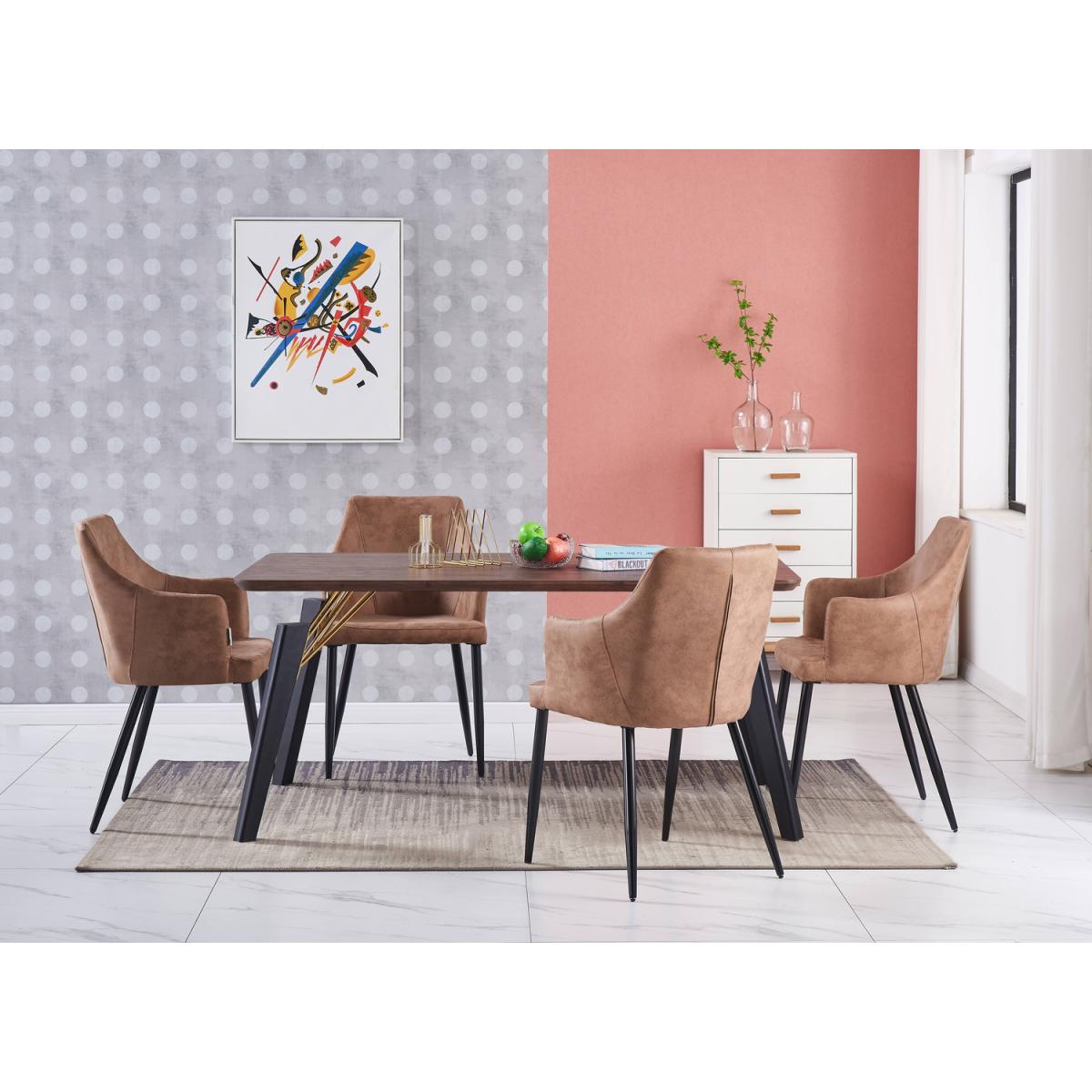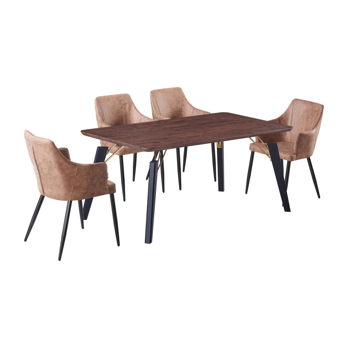 The dining set includes a Cosmo LUX Rectangle Dining Table that has been designed with precision and a luxury finish to deliver an amazing dining experience. The sleek design of this table is giving it both functionality and a modern look with a touch of a rustic home feel The wooden look of the top gives it a warm rustic feel while the black metal legs with a gold chrome frame bring the modern feel. Comes with the luxurious and contemporary Zarah Armchair that features a high back, metal powder-coated legs, foam padded seat, and back. The metal, powder-coated legs are sleek and sturdy while the foam padding over the body gives comfort and support where it's needed. The high back and armrests make the Zarah armchair perfect for sitting back. The faux leather finish gives this chair richness and the stitching adds detail for a rustic, hand-finished look. The elegant Chair provides you with comfort, and durability while high back with roomy seat areas to relieve the pressure on your back and legs and enable you to relax your body and sit comfortably.