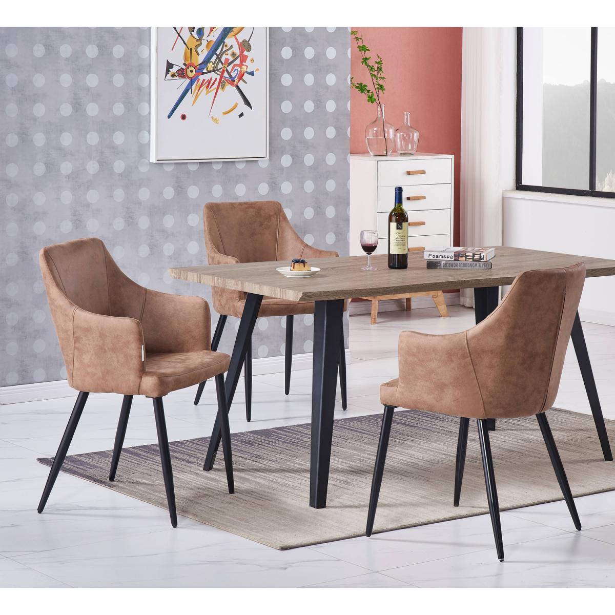 The dining set includes a Rocco dinette Table which features a detailed wood-finished tabletop with modern cast metal legs. Sturdy yet space-enhancing, its shape is timelessly minimalist. The slightly splayed black powder-coated metal legs give a sharp modern feel, whilst the wooden finish top emphasizes natural wavy edges. Comes with the luxurious and contemporary Zarah Armchair that features a high back, metal powder-coated legs, foam padded seat, and back. The metal, powder-coated legs are sleek and sturdy while the foam padding over the body gives comfort and support where it's needed. The high back and armrests make the Zarah armchair perfect for sitting back. The faux leather finish gives this chair richness and the stitching adds detail for a rustic, hand-finished look. The elegant Chair provides you with comfort, and durability while high back with roomy seat areas to relieve the pressure on your back and legs and enable you to relax your body and sit comfortably.