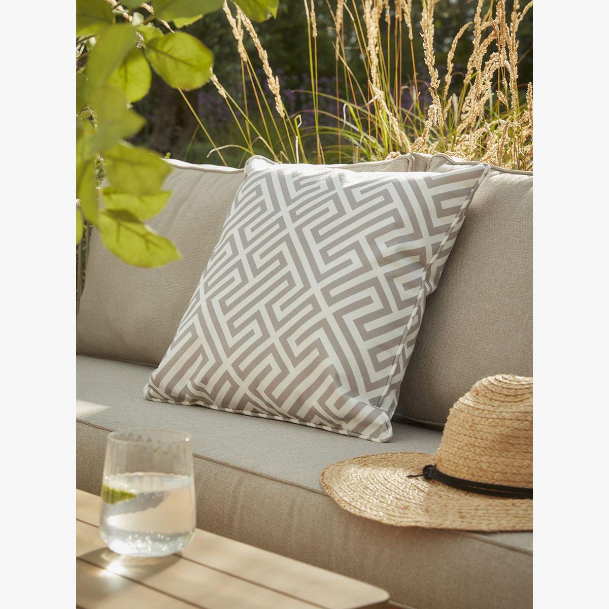 A geometric line patten in contrasting grey and white tones adds character to our Zari Outdoor Cushion. Perfect for adding a unique element to you garden furniture, it pairs wonderfully with our other outdoor cushions for a lovely layered look. Layer up with throws for extra warmth and enjoy the long summer days in the cosiest way.  Also available in blue.