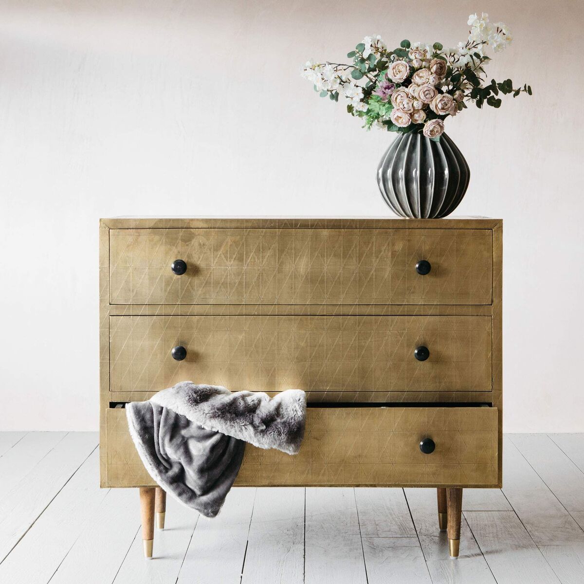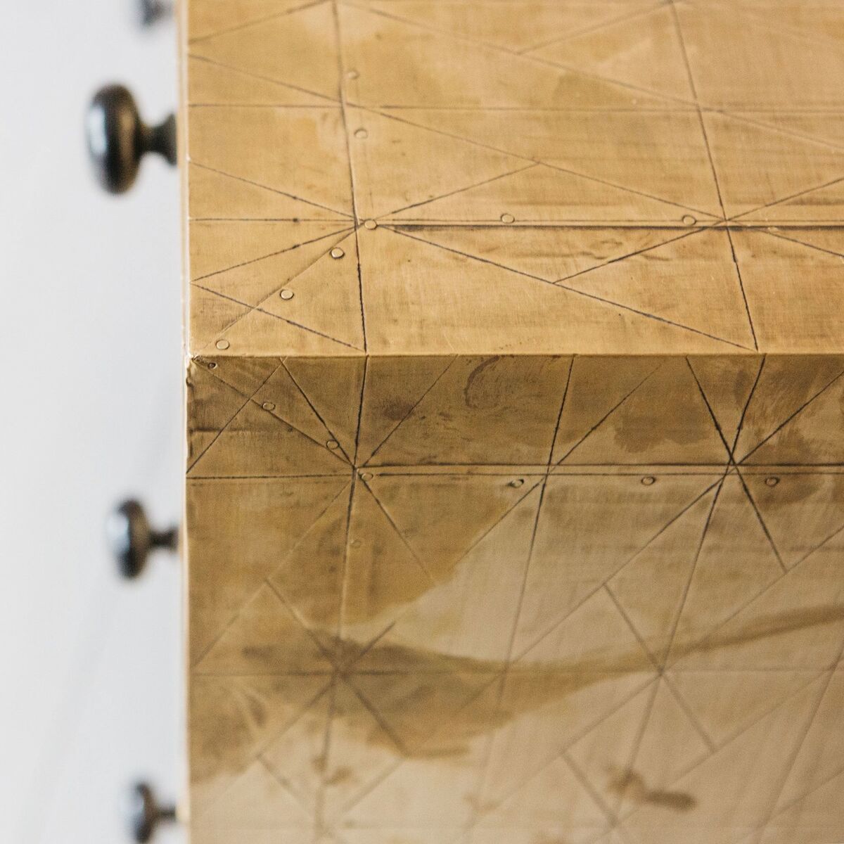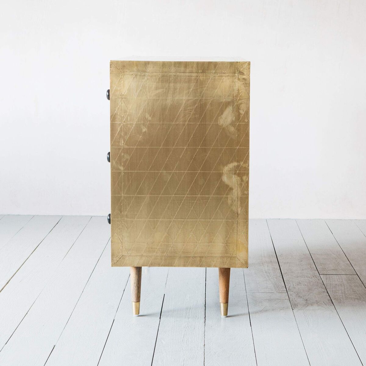 Handcrafted from brass metal pressed over a mango wood frame with a slight antique finish, our Zarina chest of drawers is embossed with a geometric design, finished with black horn knobs and brass-tipped tapered legs. The beautiful finish will naturally mark and mottle, adding to its unique look.