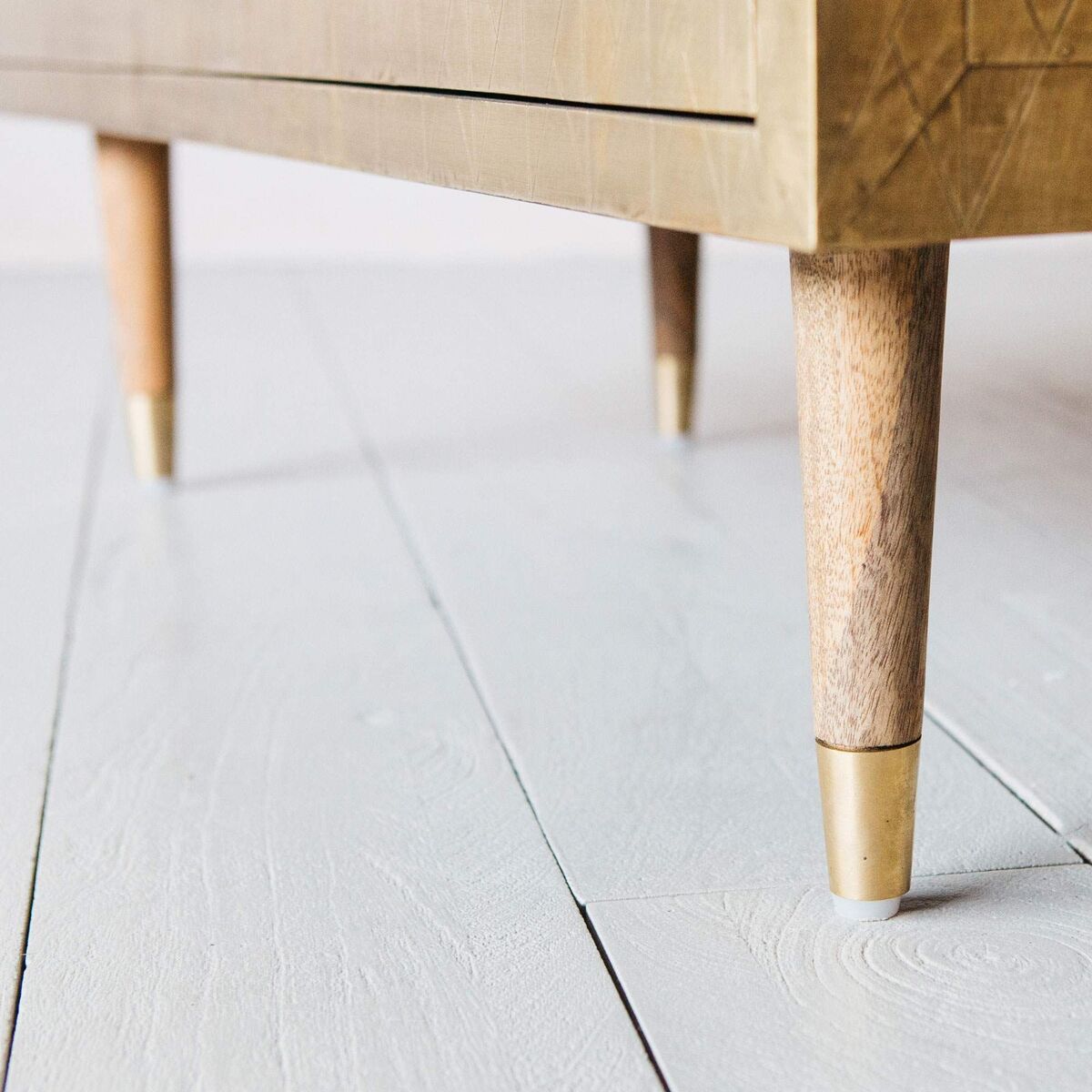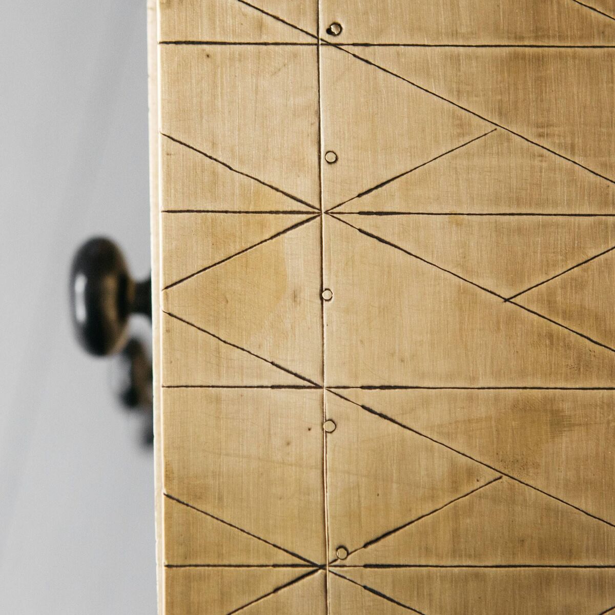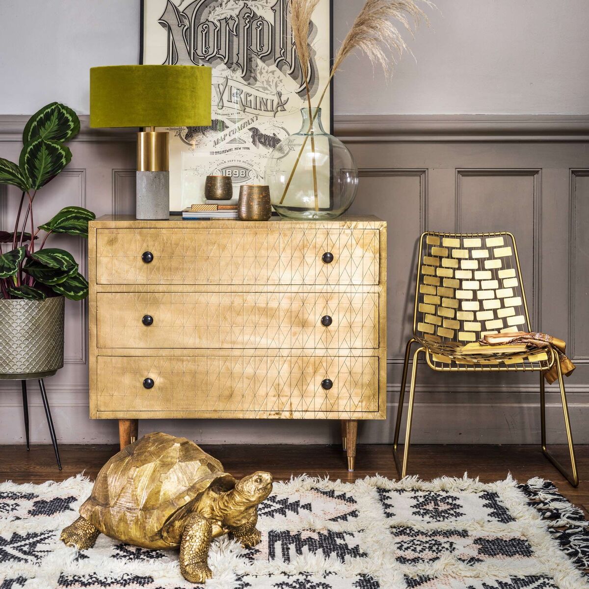 Handcrafted from brass metal pressed over a mango wood frame with a slight antique finish, our Zarina chest of drawers is embossed with a geometric design, finished with black horn knobs and brass-tipped tapered legs. The beautiful finish will naturally mark and mottle, adding to its unique look.