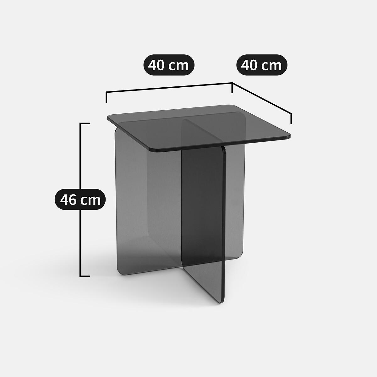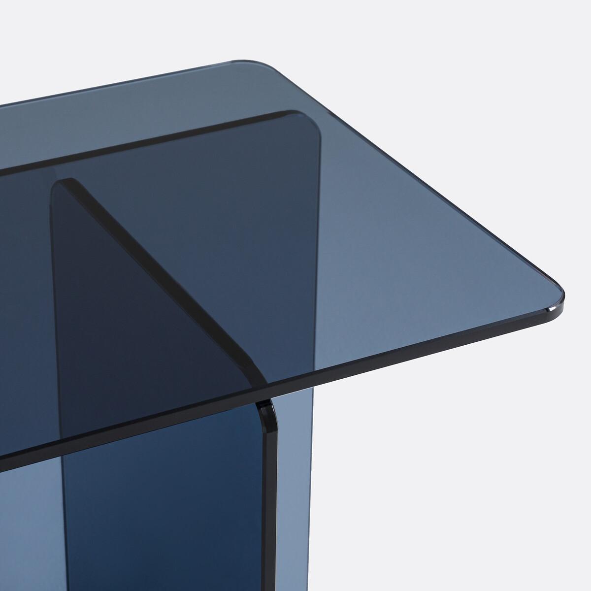 Straight lines. Bold connections. Architectural geometry. Zaz is a radically contemporary side table. In blue-tinted tempered glass, it will be the centre piece of any living room. Product Details • Blue tempered glass • Clear polypropylene glides • Maximum weight supported : 5kg. Quality Info • This side table is in tempered glass for your safety. Care Advice • To protect your side table, think about using coasters, trivets and placemats. Dimensions • Width: 40cm • Height: 46cm • Depth: 40cm • Weight: 12kg • Sold pre-assembled. Dimensions and weight of parcel1 parcel • L53 x H60.5 x D53cm. 19.8kg