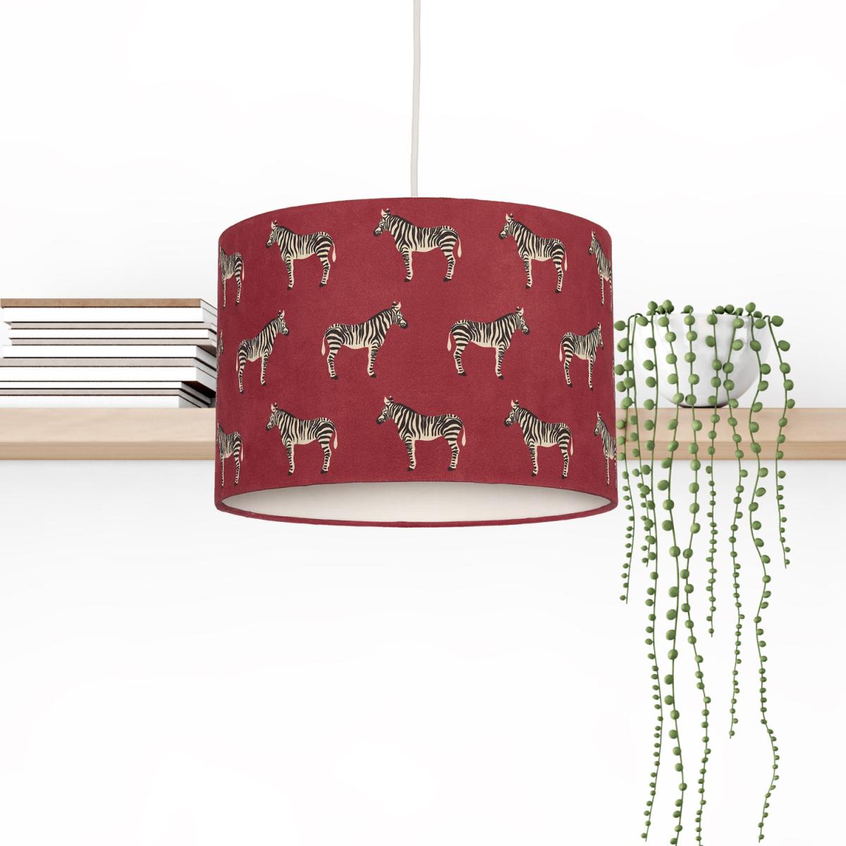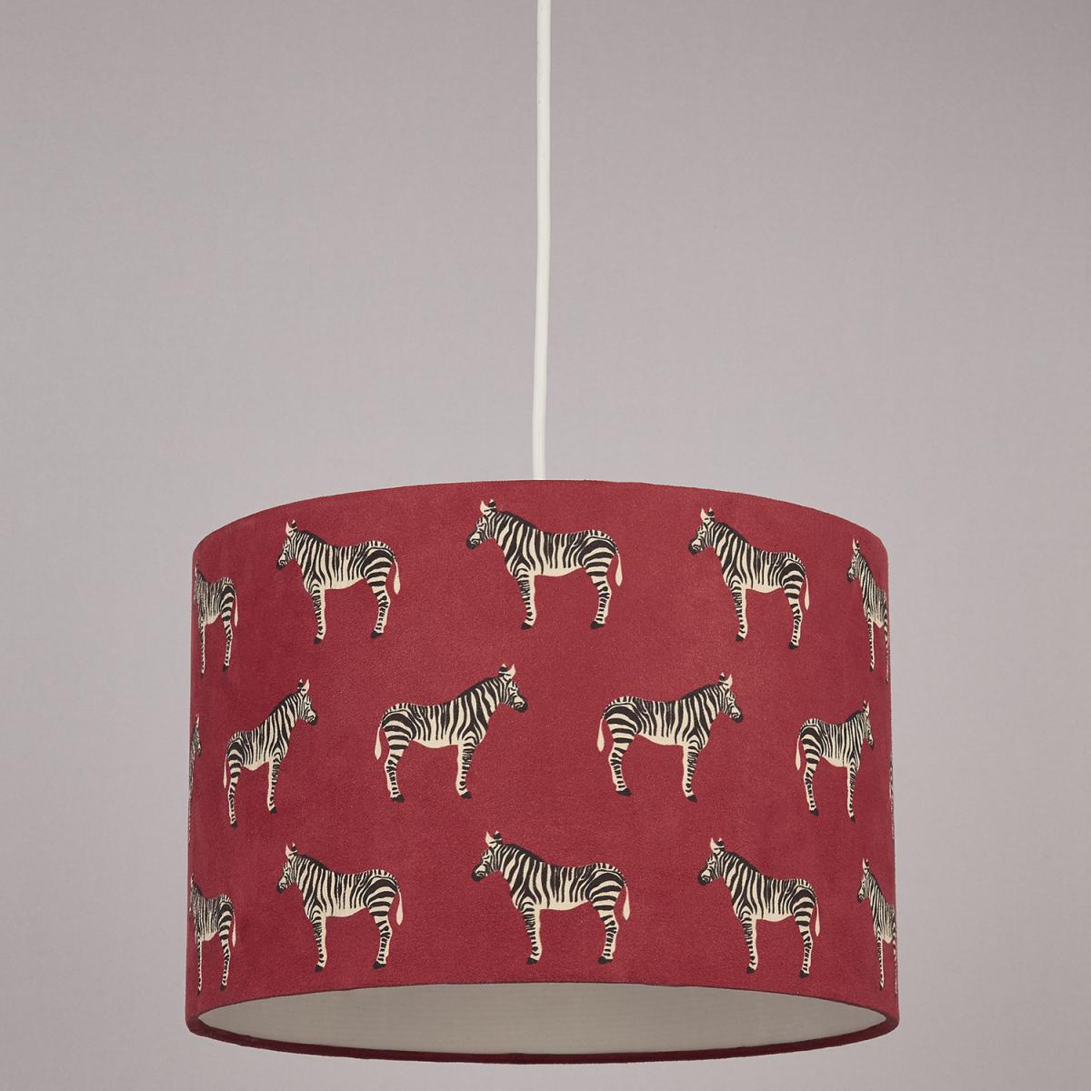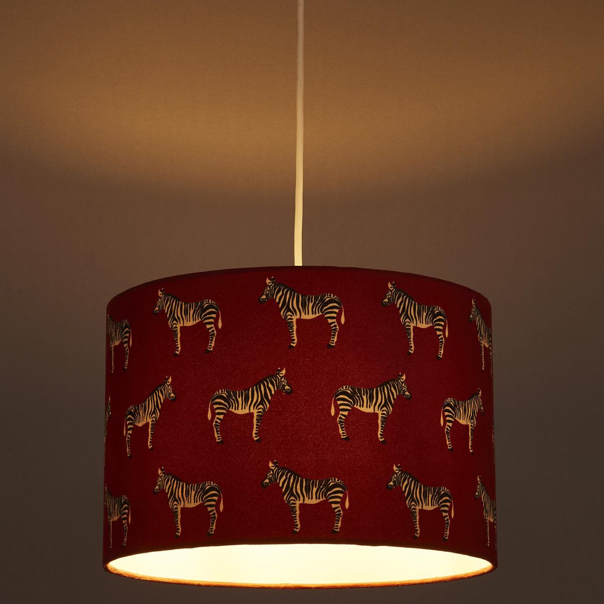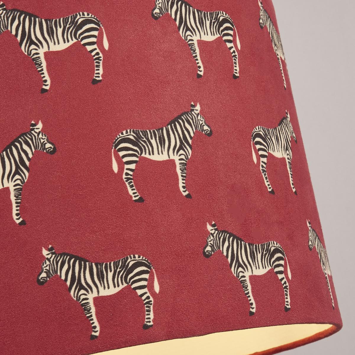 Idea for the animal lover, this zebra shade will add a statement to any room. The fabric shade depicts multiple zebras on a red shade, adding a pop of colour to any room.