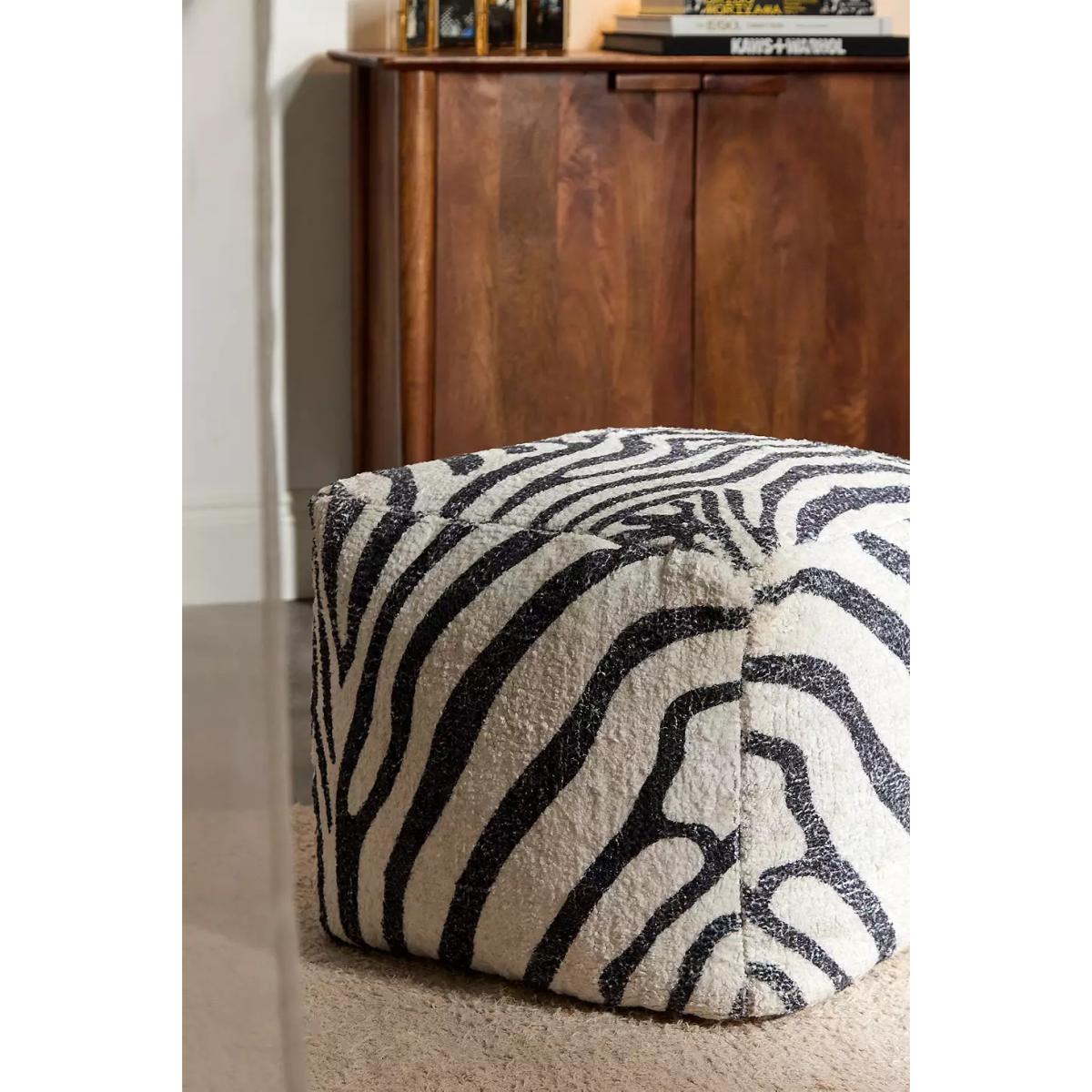 Statement cube-shaped pouffe with a zebra print pattern and soft filling. Perfect for resting your feet, as extra seating, or even a decorative accent piece. *Online return only. This item cannot be returned instore. Please note furniture items currently cannot be shipped to Northern Ireland or The Republic of Ireland. Delivery of large furniture items may take 1-2 weeks and are therefore not eligible for Next Day Delivery.* **Content + Care** \- Cover: 100% Polyester \- Filling: 100% Thermocol balls \- Spot clean **Size** \- Product: H: 48cm x W: 48cm x L: 48cm \- Package dimensions: H: 50cm x W: 55cm x L: 55cm \- Weight: 3kg