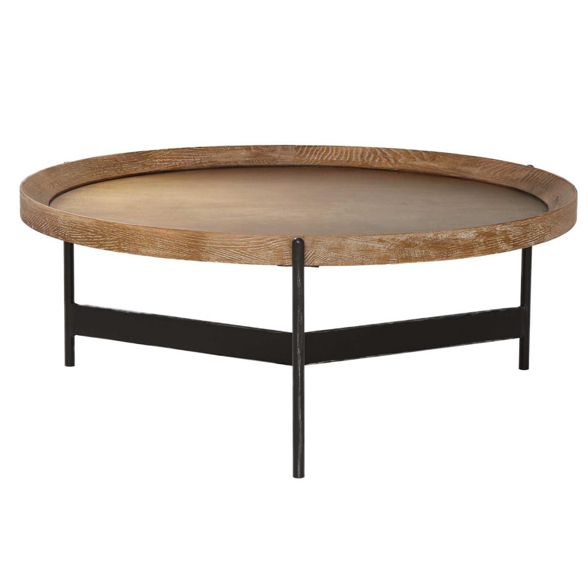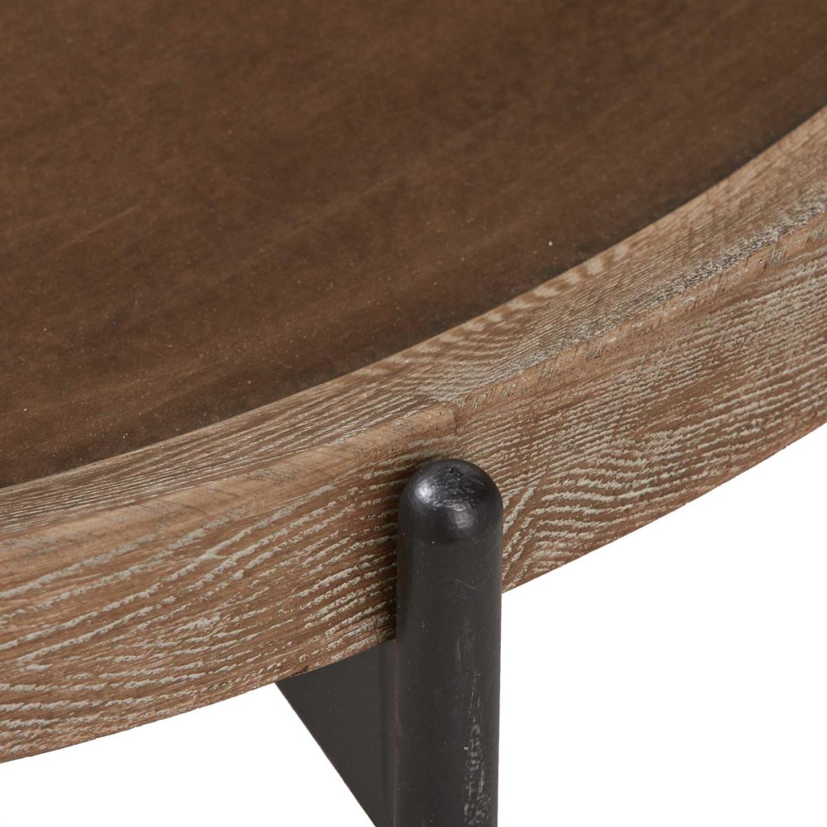 I’d call this the Zeke coffee table - its warm mango-wood top and slim black metal legs give you a neat balance of natural texture and industrial edge. I love how its low, round profile works in both Scandi-inspired and urban loft settings, fitting snugly into smaller living rooms without overwhelming the space. For styling, keep the surface clutter-free: a shallow ceramic tray to corral remotes and coasters, a single sculptural vase with fresh greenery, plus a couple of art books stacked neatly to one side. Underneath, a low-pile rug in muted tones will ground the table and add a cosy layer.
