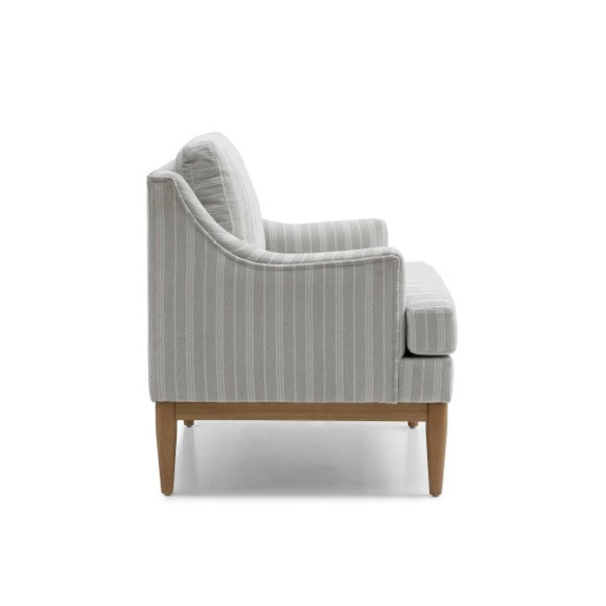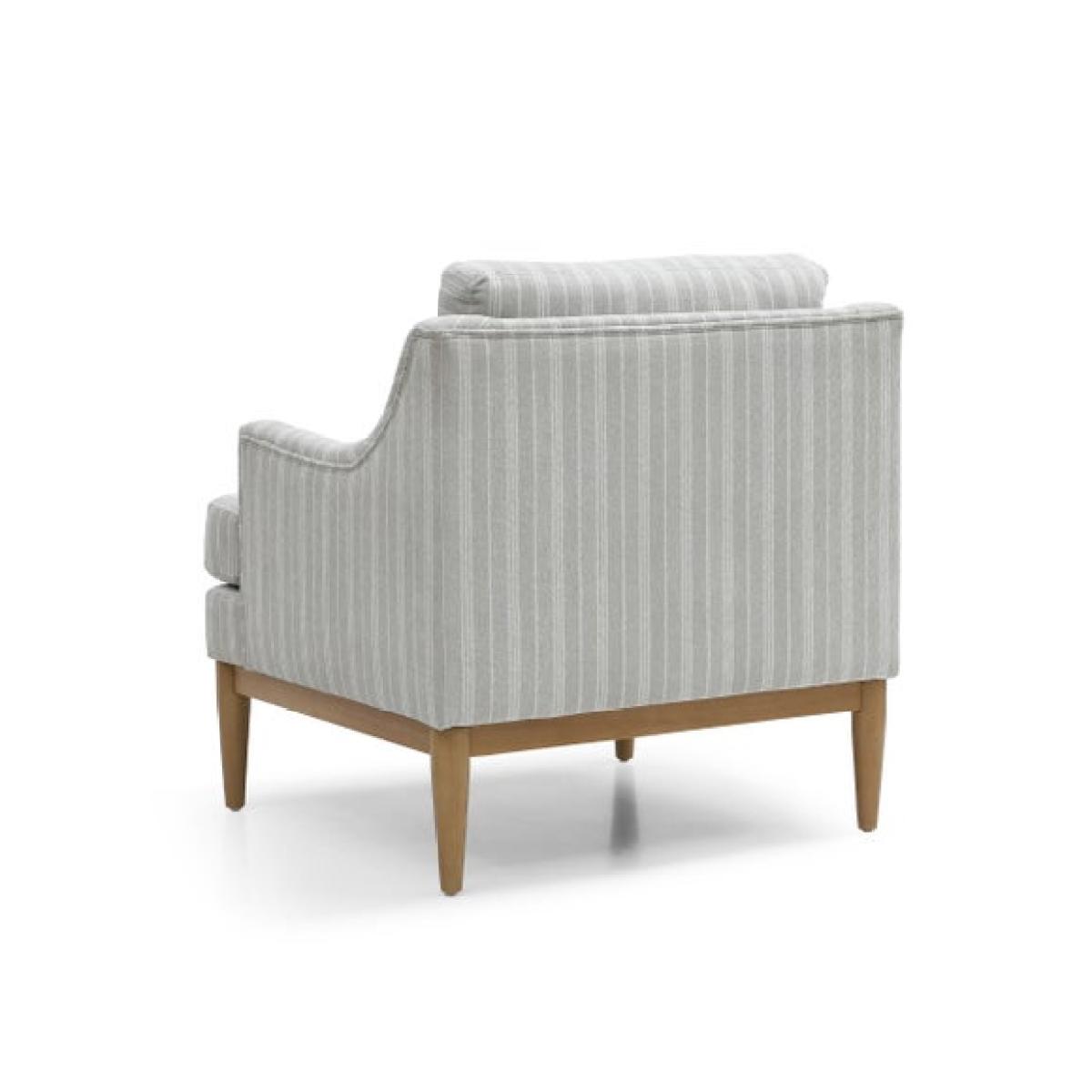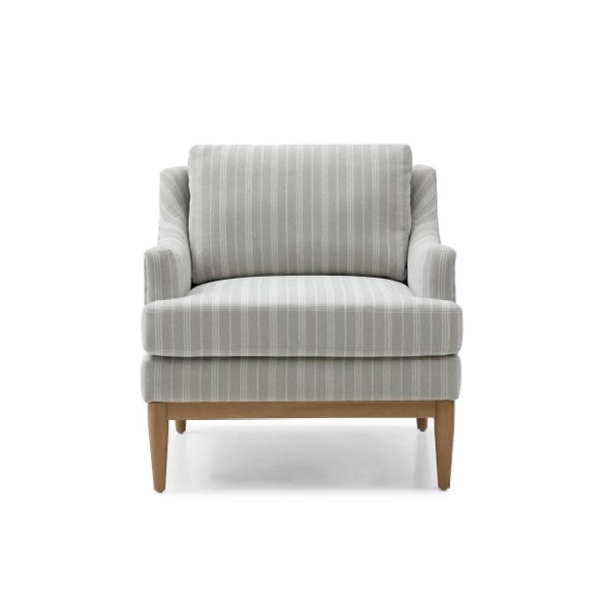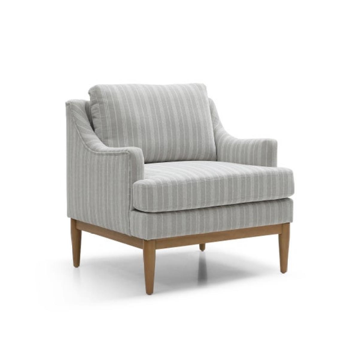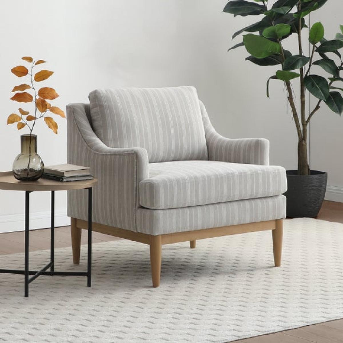 * Elegant occasional chair * Soft, striped upholstery * Sprung seats This chair iss a compact yet comfortable option for adding extra seating with style. Its sloped arms and sprung seat offer a supportive sit, while the padded back cushion ensures lasting comfort. Upholstered in a soft chenille stripe and finished with natural wood legs, this chair is perfect for creating a light, airy feel in your space.