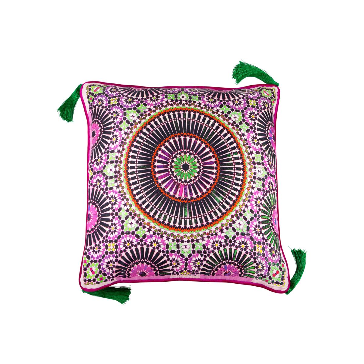Silk twill and cotton viscose velvet zellige-print cushion. The Zellige Ispahan cushion is a colourful play on the famous Moroccan terracotta tileworks, with coloured circle overlays on the zellige design. Irregular shade variations and geometric flaws in the tiles give character to the pattern. Celebrating the mosaics' rich history and craftsmanship and made from silk twill and cotton viscose velvet, the Zellige Ispahan cushion's colourful mosaics add a splash of Moroccan cool to your living room. Composition: Silk twill front with cotton lining, cotton viscose velvet back, cotton viscose velvet piping, silky rayon tassels Digitally printed front Includes feather pad Removable cover Discreet zip closure Dry clean only