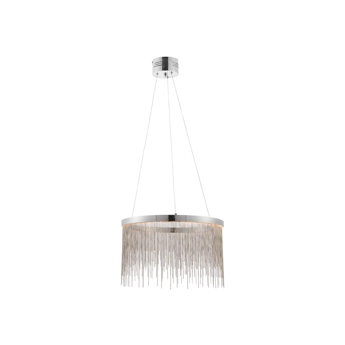 A beautiful pendant light finished in a chrome effect plate. Delicate silver effect chains hang from a LED ring of light at differing lengths for a stunning shimmering effect. Seemingly the pendant "floats", suspended from subtle clear cables that are height adjustable. H50 X W45CM.. This product will be dispatched by one of our trusted suppliers. You’ll be contacted by their selected courier about your delivery.