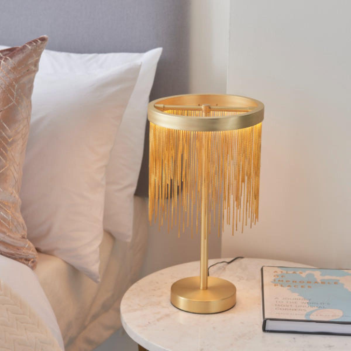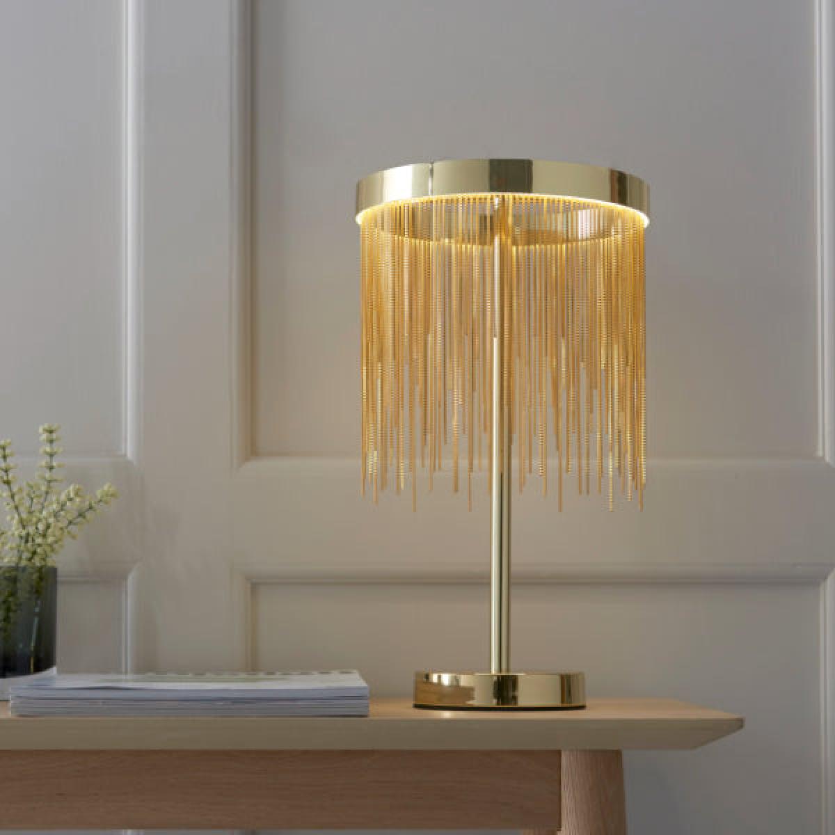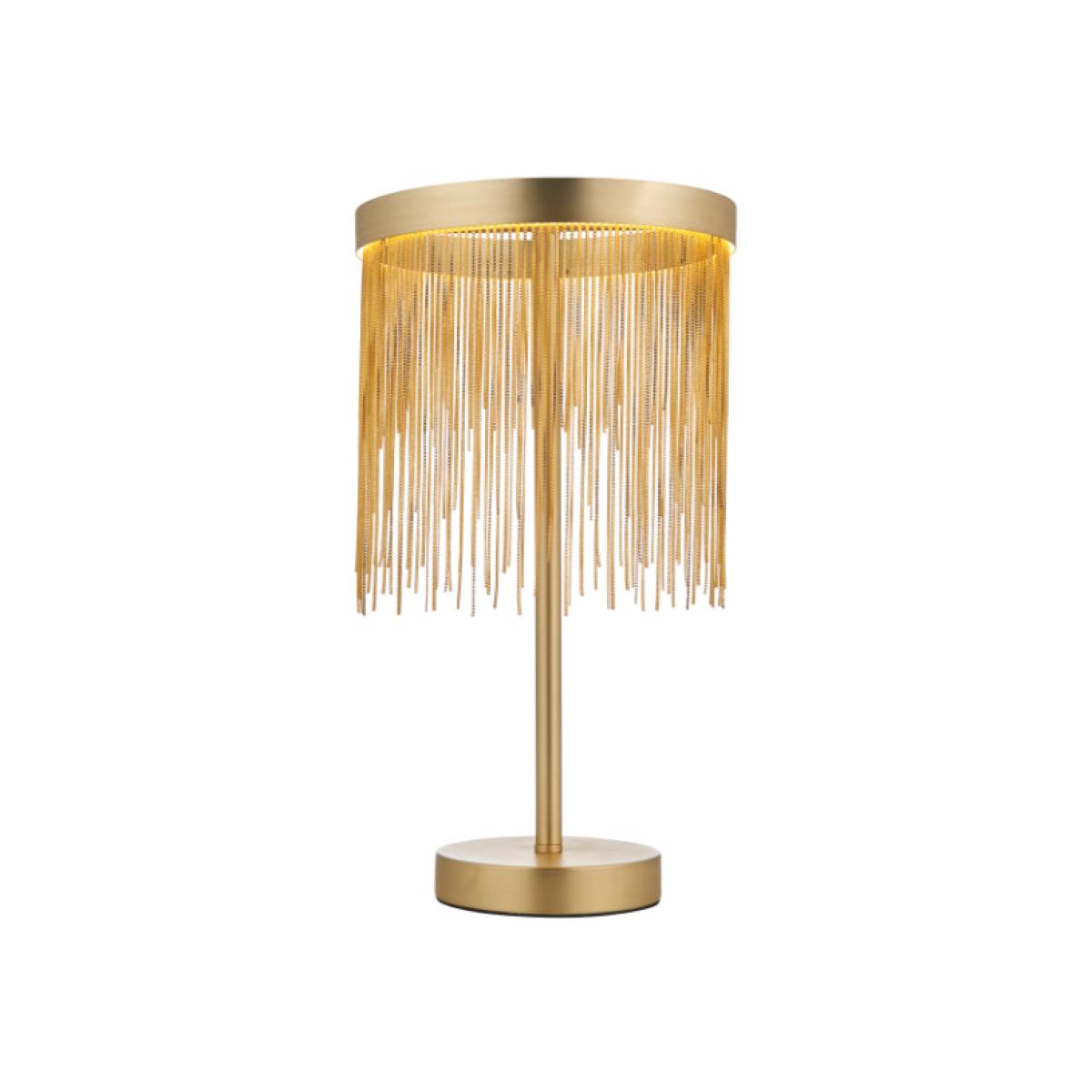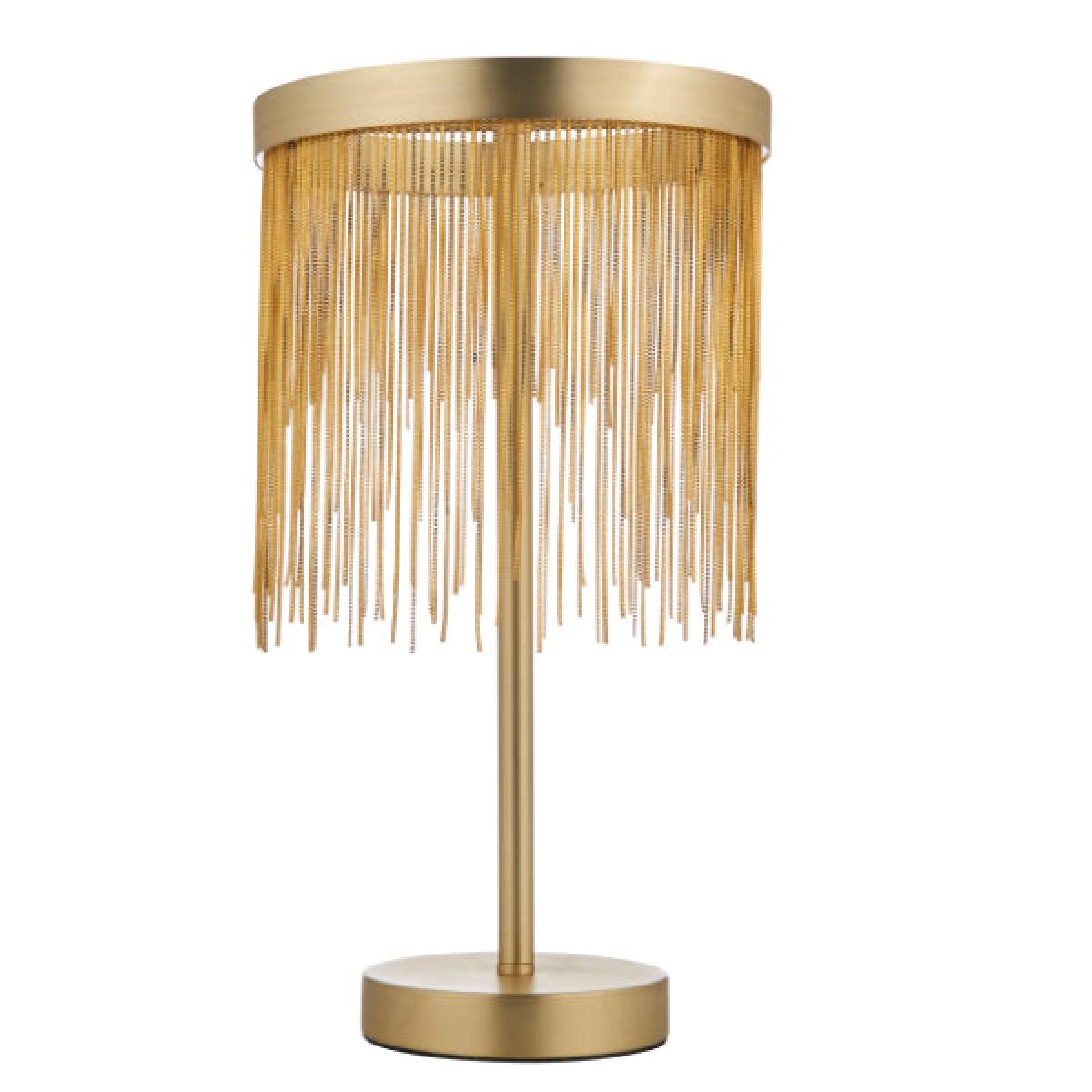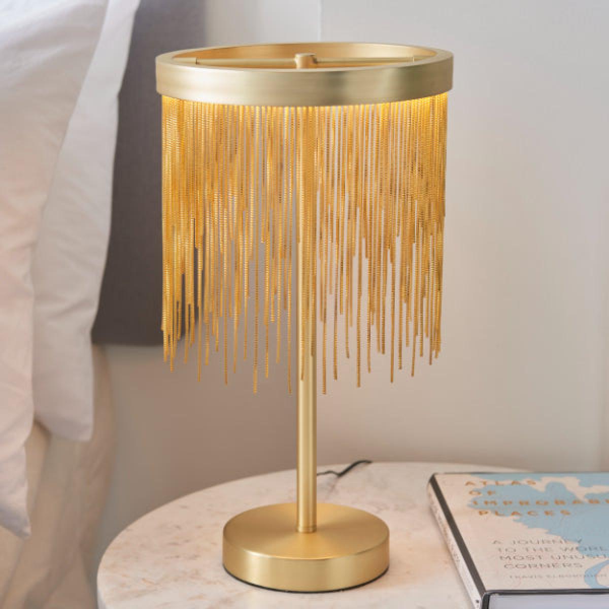 Stunning table lamp boasting a satin brass finish The Zelma LED table lamp is a strikingly beautiful table lamp. Finished in a satin brass, this gorgeous piece boasts a shade with an LED ring, of which delicate satin brass effect chains are suspended. The chains hang at varying lengths, offering a shimmering effect when lit. Stunning table lamp boasting a satin brass finish The Zelma LED table lamp is a strikingly beautiful table lamp. Finished in a satin brass, this gorgeous piece boasts a shade with an LED ring, of which delicate satin brass effect chains are suspended. The chains hang at varying lengths, offering a shimmering effect when lit.