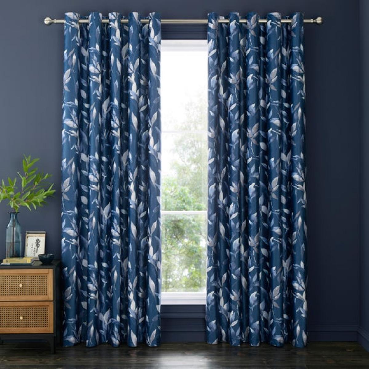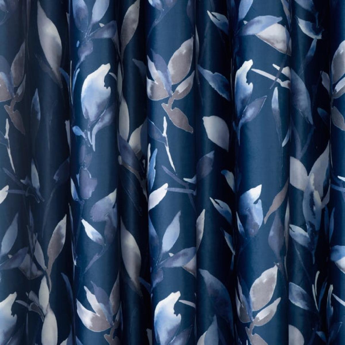 * Printed botanical leaf design * Eyelet header * Available in multiple sizes * Soft touch velour polyester fabric * Blackout lining * Dry clean only * Minimal ironing required Bring a sophisticated yet calm feel to your space with the Zen Velour Curtains in a stylish midnight blue. The botanical leaf print sits on a deep navy background for a clean and elegant look. The soft touch velour fabric lends a luxe feel, and is easy care polyester, with minimal ironing required to keep it looking great. A blackout lining keeps out unwanted light, and the curtains are easy to hang from their eyelet header. A quick and simple refresh for your decor, with matching items available for a full look.